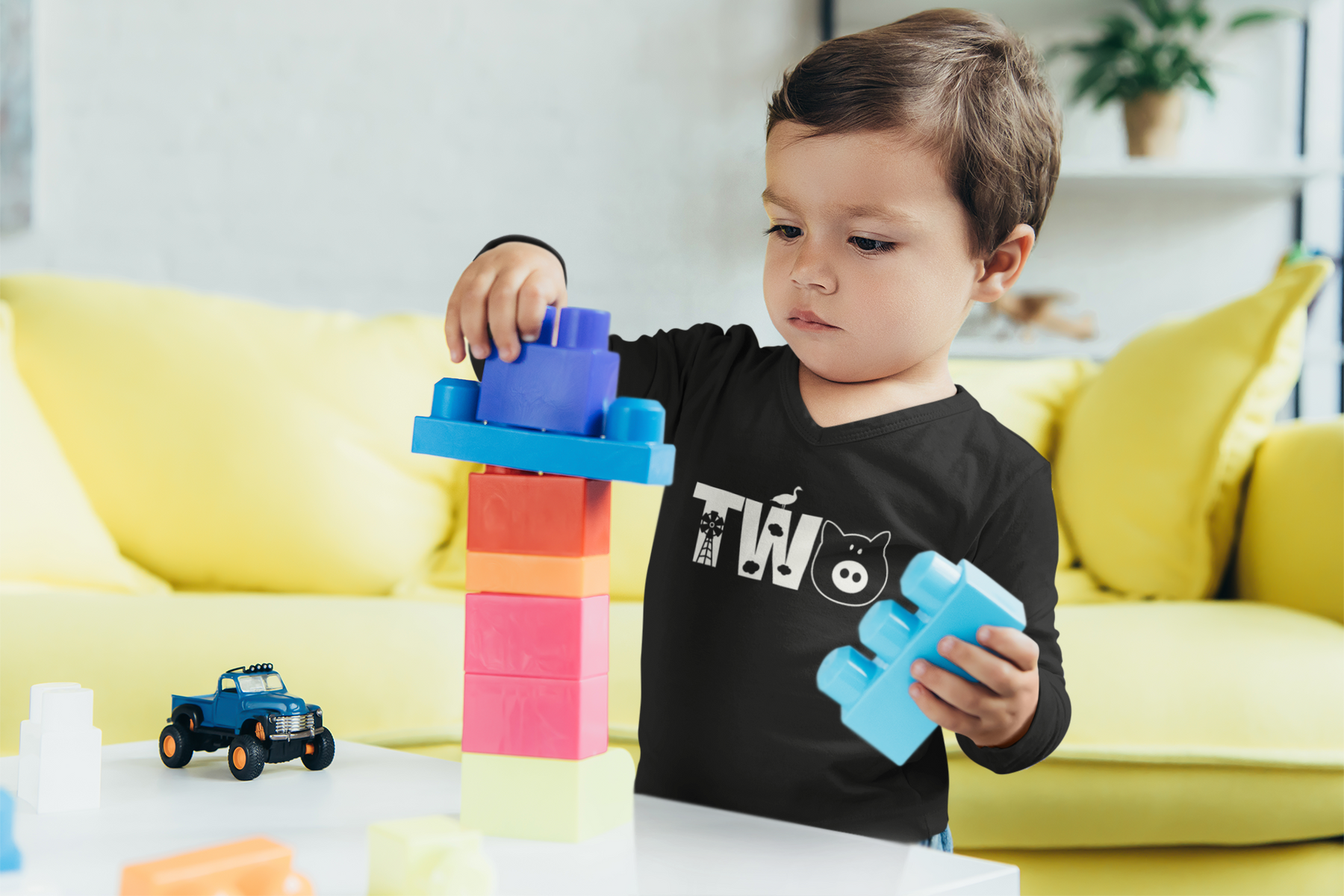 A child playing with blocks, wearing a Two Toddler Tee from Worlds Worst Tees. Made of 100% Ringspun cotton, featuring a classic fit and durable stitching. Ideal for young ones to play in comfort.