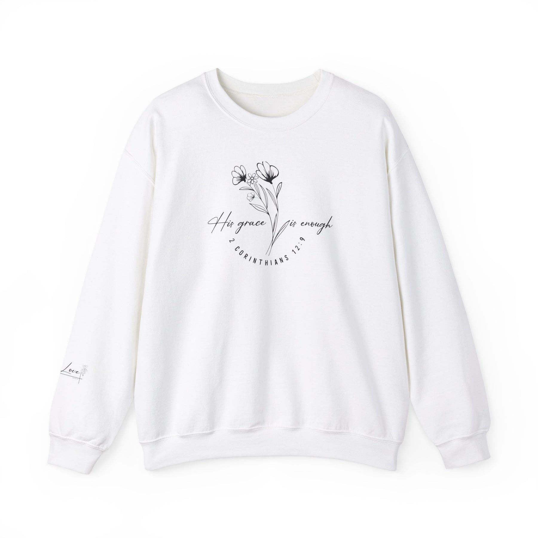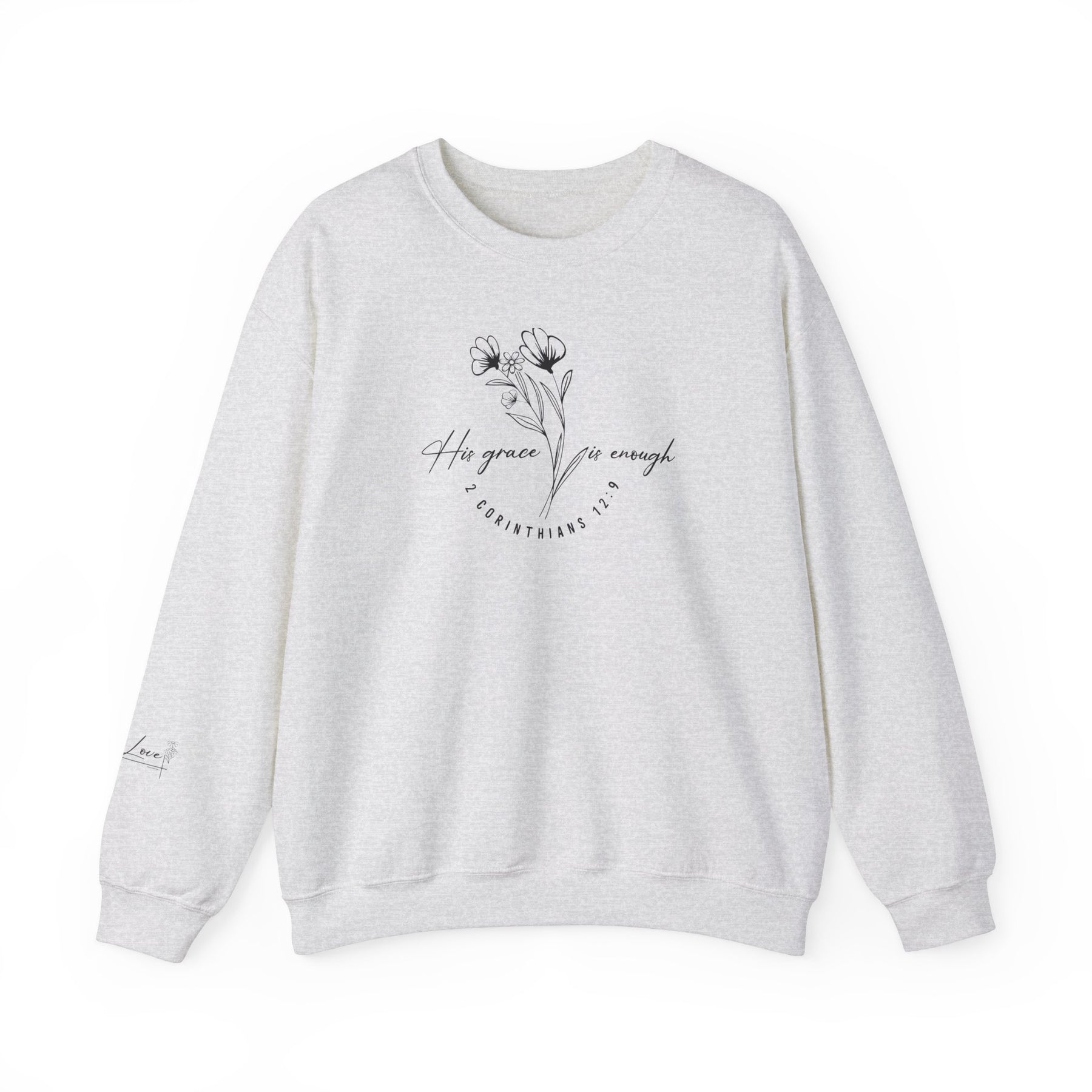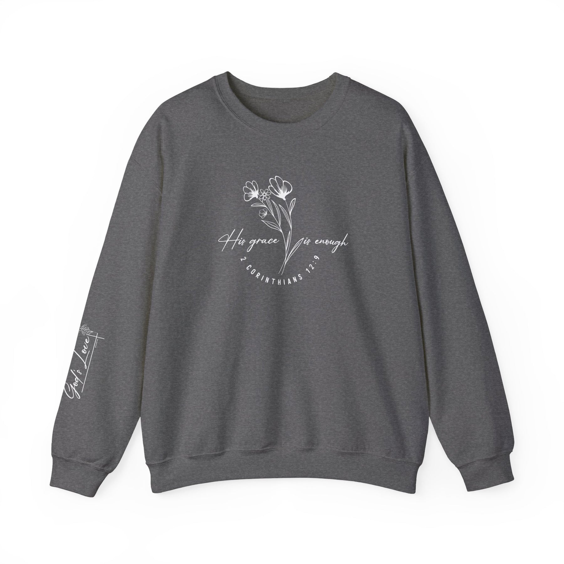 Unisex heavy blend crewneck sweatshirt, His Grace Is Enough Crew, featuring a flower design. Made of 50% cotton and 50% polyester for comfort and durability. Ideal for colder months.
