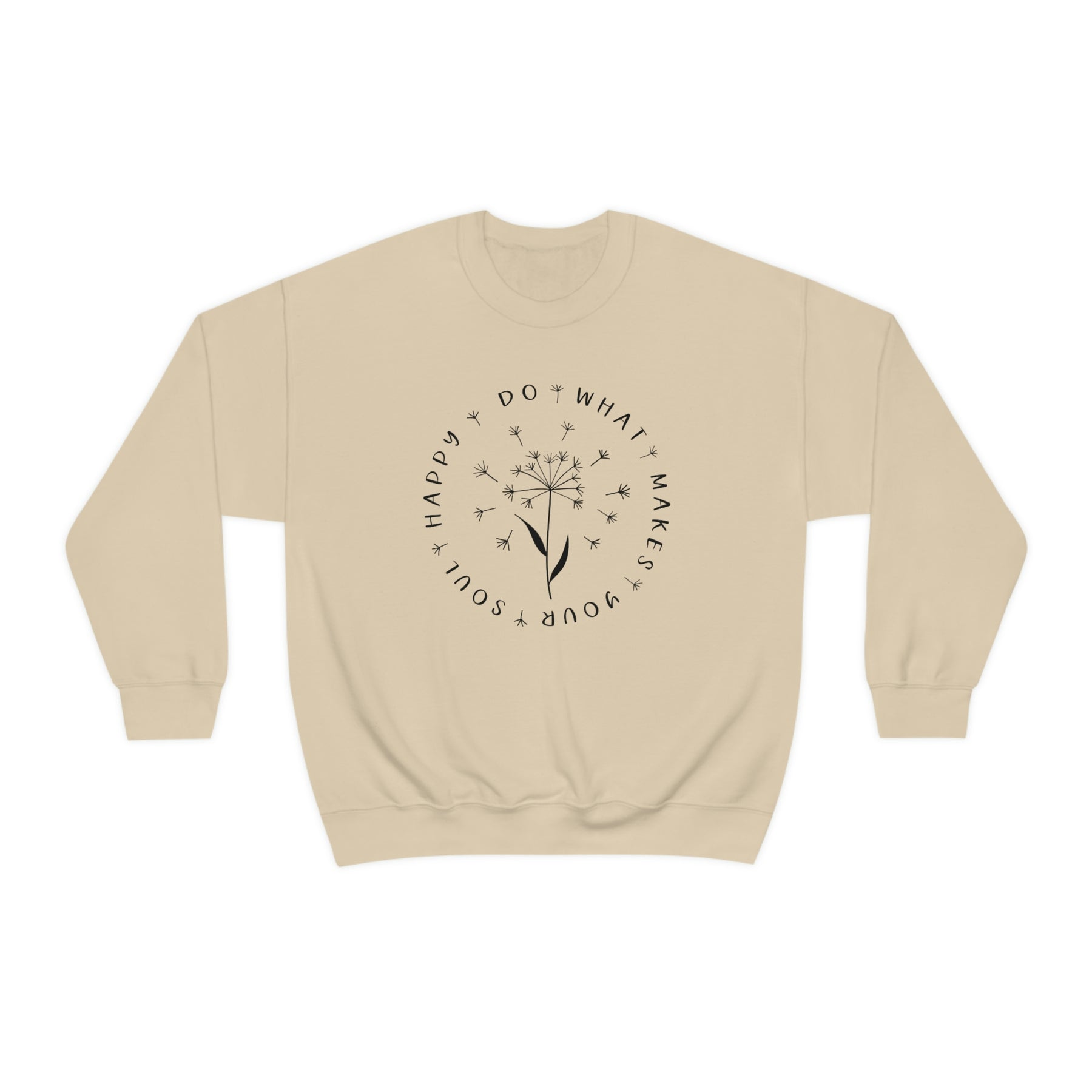 A beige crewneck sweatshirt with a dandelion design, ideal for comfort in any situation. Unisex heavy blend, 50% cotton, 50% polyester, loose fit, ribbed knit collar, no itchy side seams. Happy Soul Crewneck by Worlds Worst Tees.