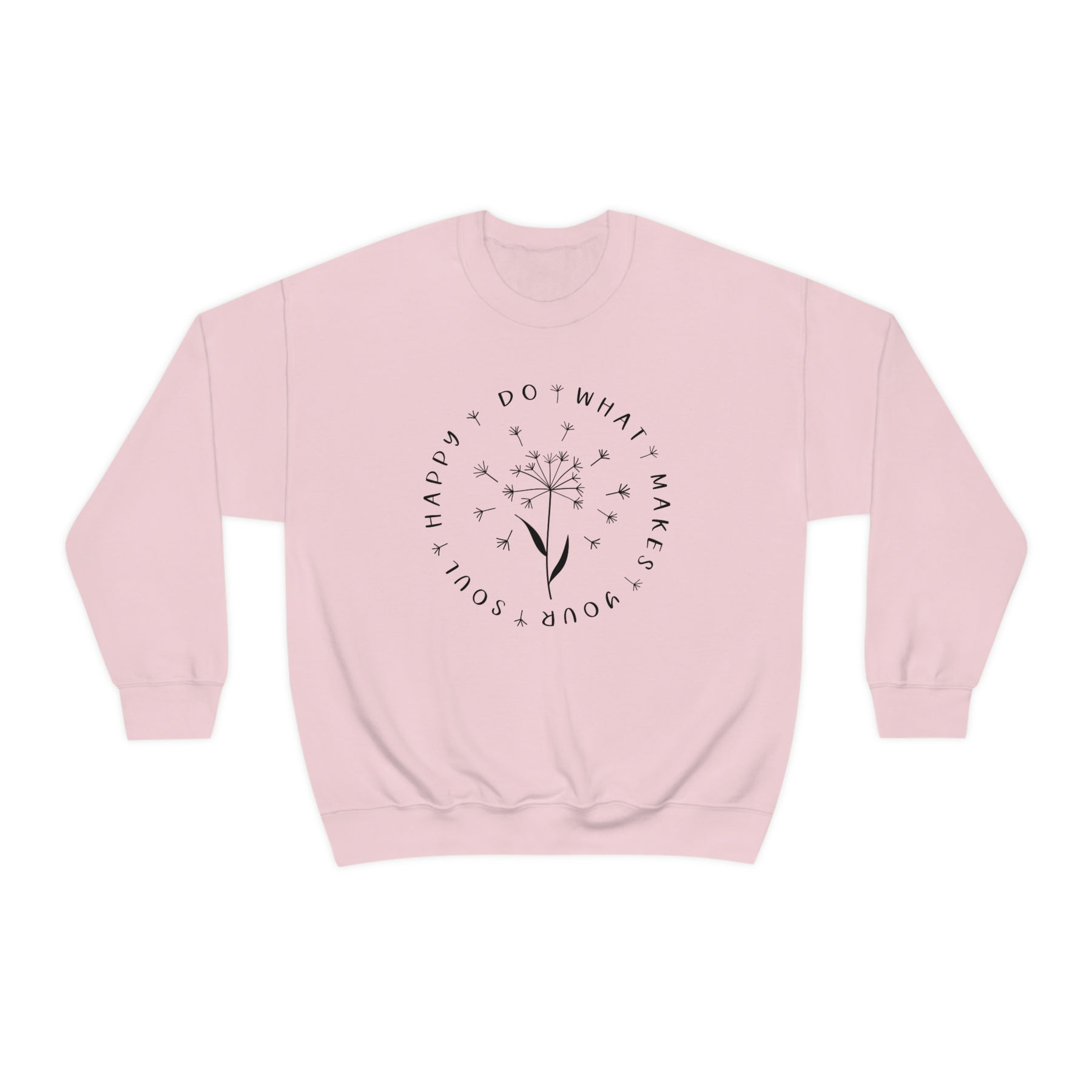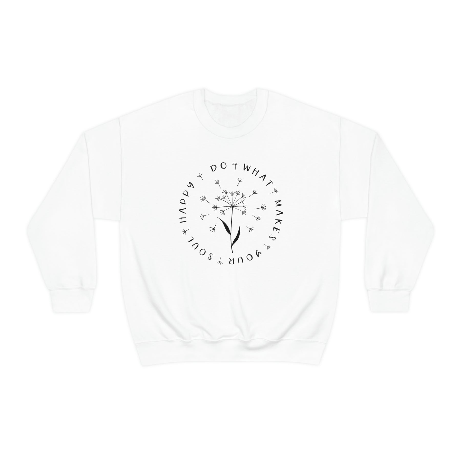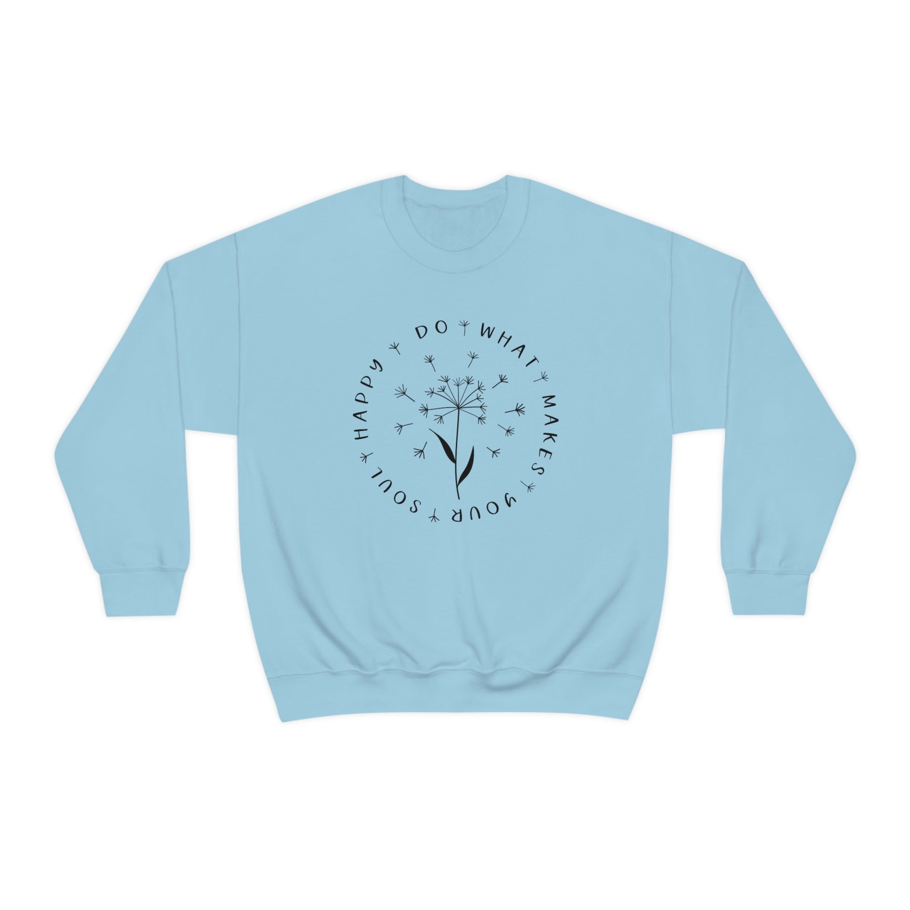 A blue sweatshirt featuring a dandelion design, the Happy Soul Crewneck. Unisex heavy blend, 50% cotton, 50% polyester, loose fit, ribbed knit collar, medium-heavy fabric, sewn-in label. Comfortable and stylish.