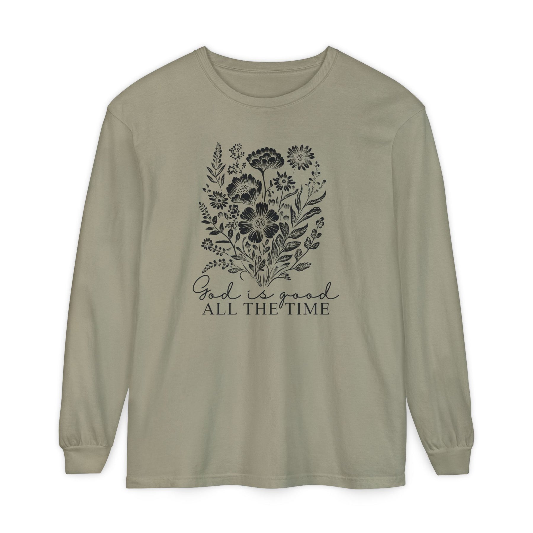 Army-green long-sleeve tee featuring hand-drawn wildflowers and God is good ALL THE TIME text, offering comfort and style from Faith Family Designs.