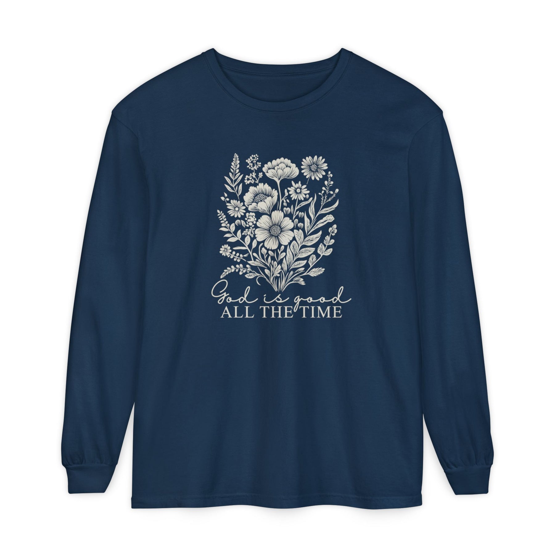Navy-blue long-sleeve tee with off-white floral design and God is good ALL THE TIME text. Made from soft, 100% ring-spun cotton for comfort.