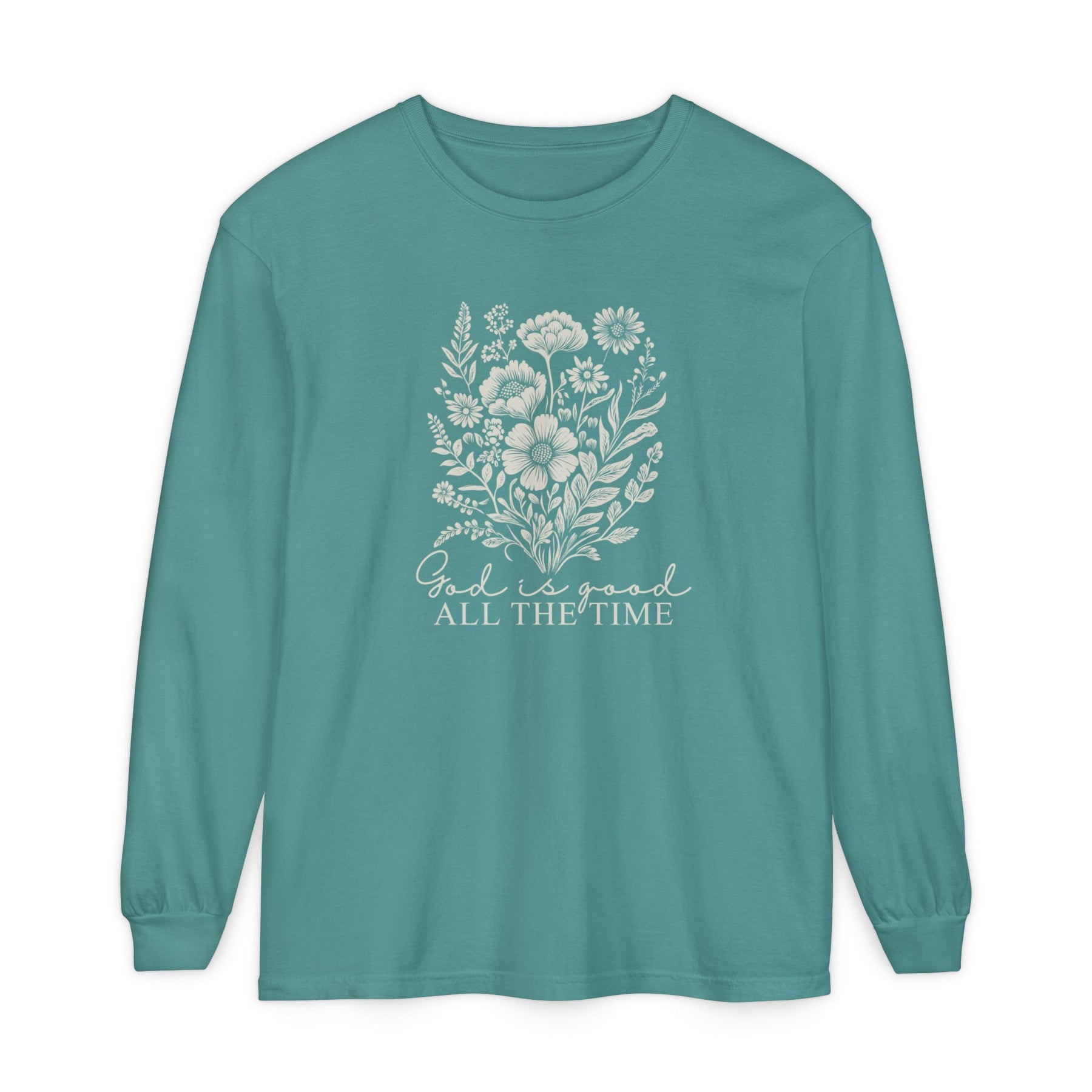 Teal long-sleeve tee with a wildflower bouquet and God is good ALL THE TIME print, made of 100% ring-spun cotton, offering comfort and style.