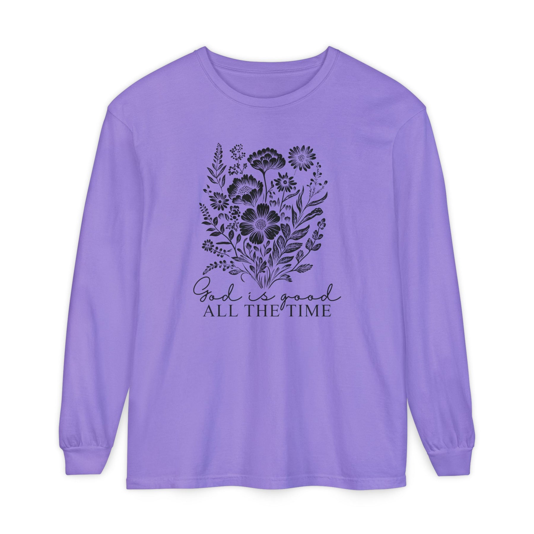 Muted purple long-sleeve tee with a white wildflower graphic and God is good ALL THE TIME text, offering softness and a relaxed fit.