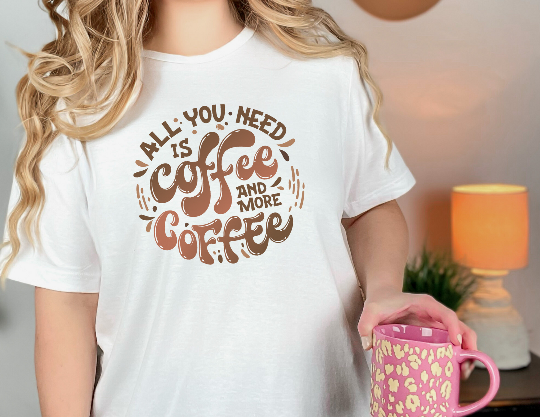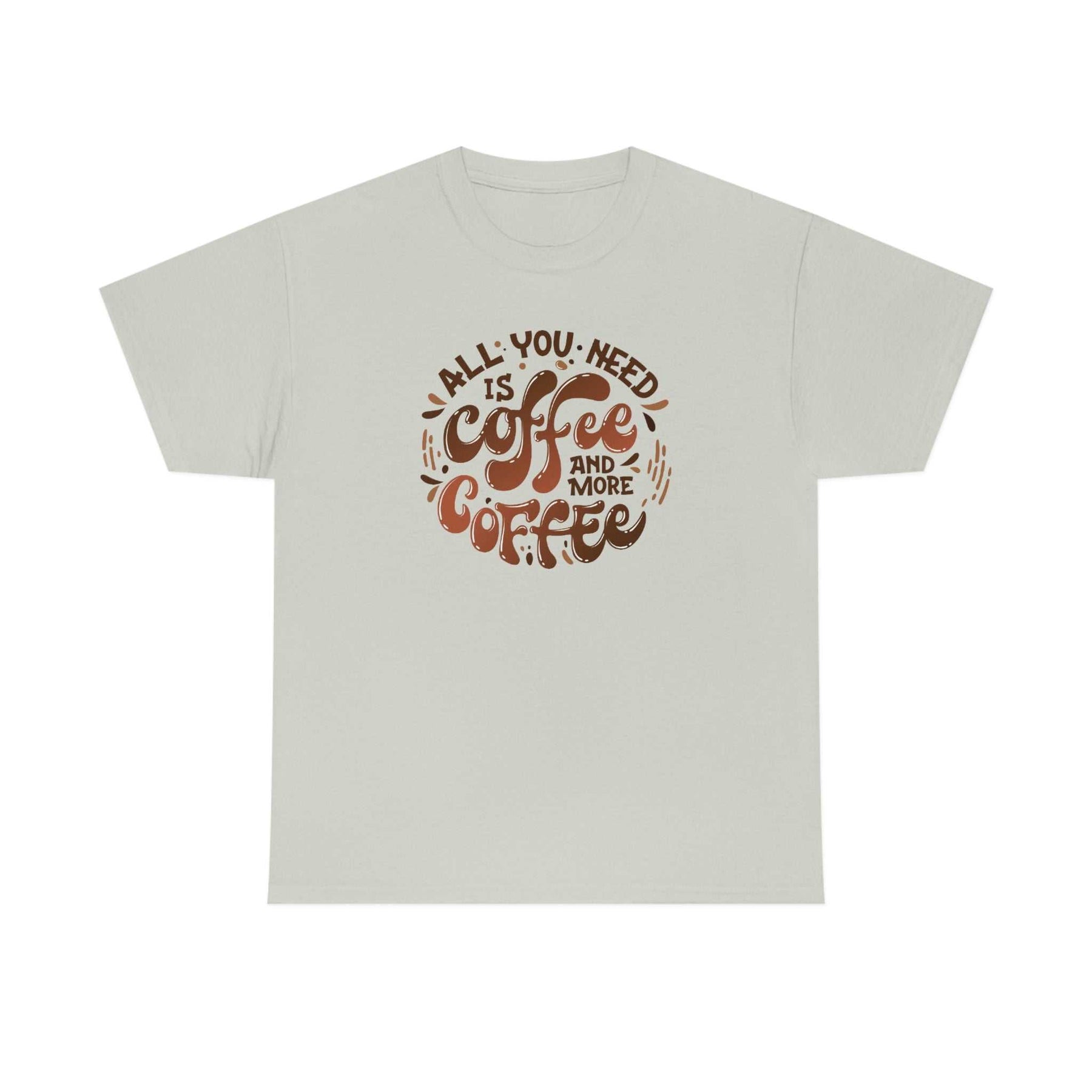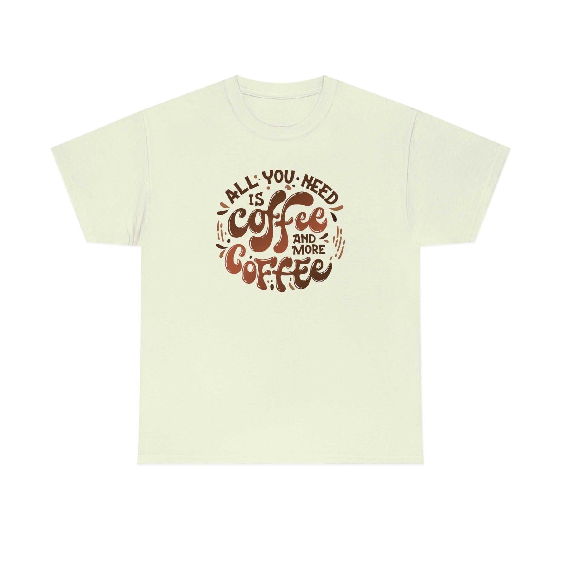 Unisex heavy cotton tee featuring All You Need is Coffee quote graphic. Classic fit with ribbed knit collar, no side seams, and durable tape on shoulders. Medium weight fabric in various sizes.
