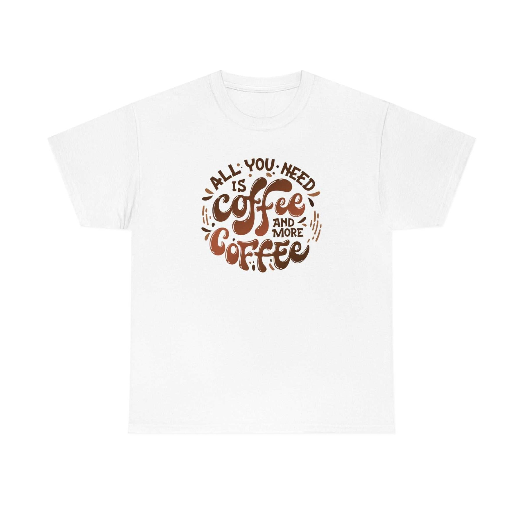 Unisex heavy cotton tee, All You Need is Coffee Tee, featuring brown text on a white shirt. Classic fit with no side seams, ribbed knit collar, and durable tape on shoulders. 100% cotton. Sizes S-5XL.
