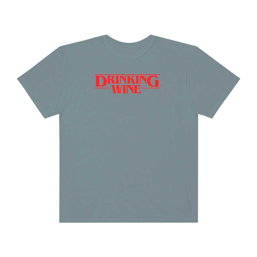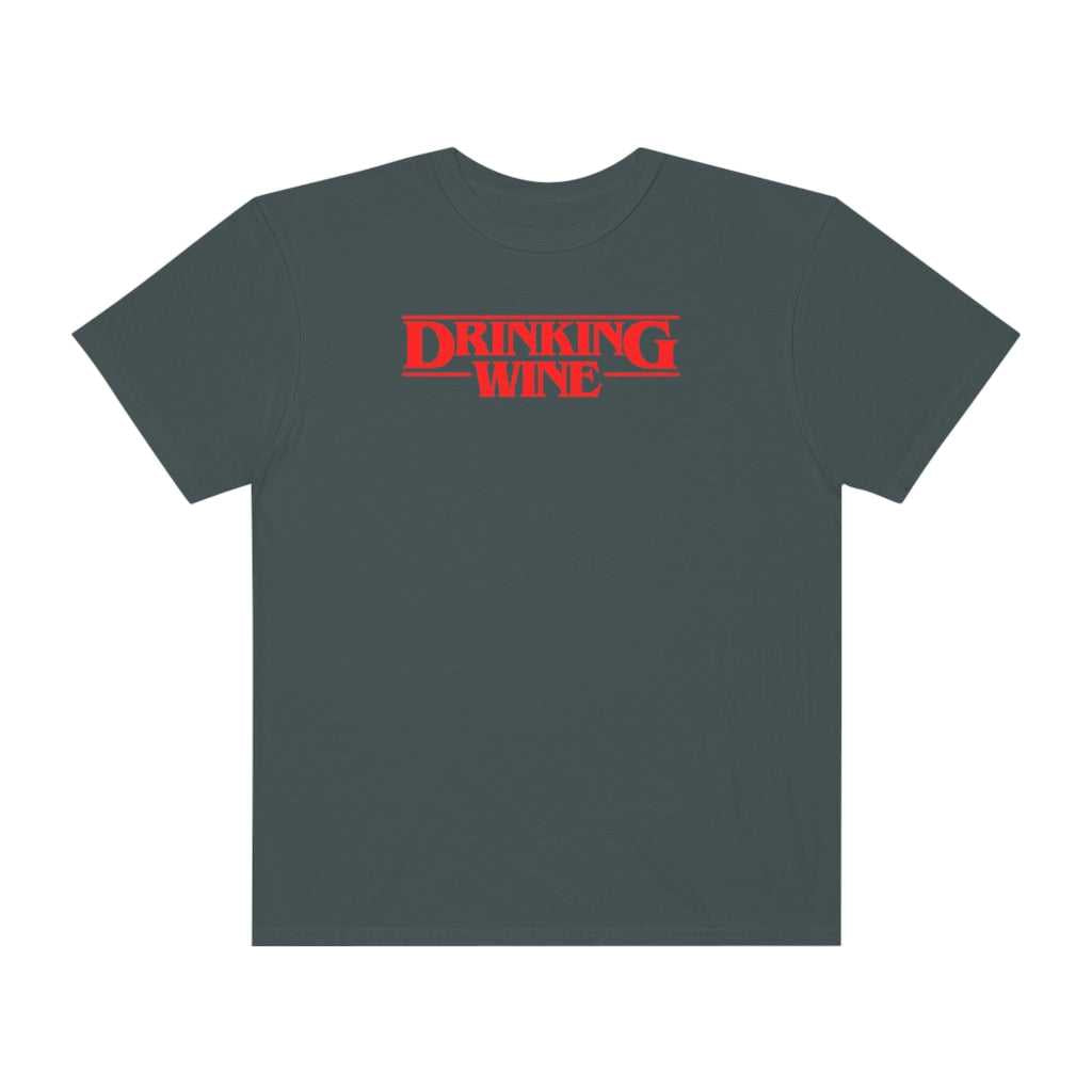 Woman wearing a DRINKING WINE graphic t-shirt, smiling at the camera. The relaxed-fit tee is soft-washed, 100% ring-spun cotton, ideal for casual wear.