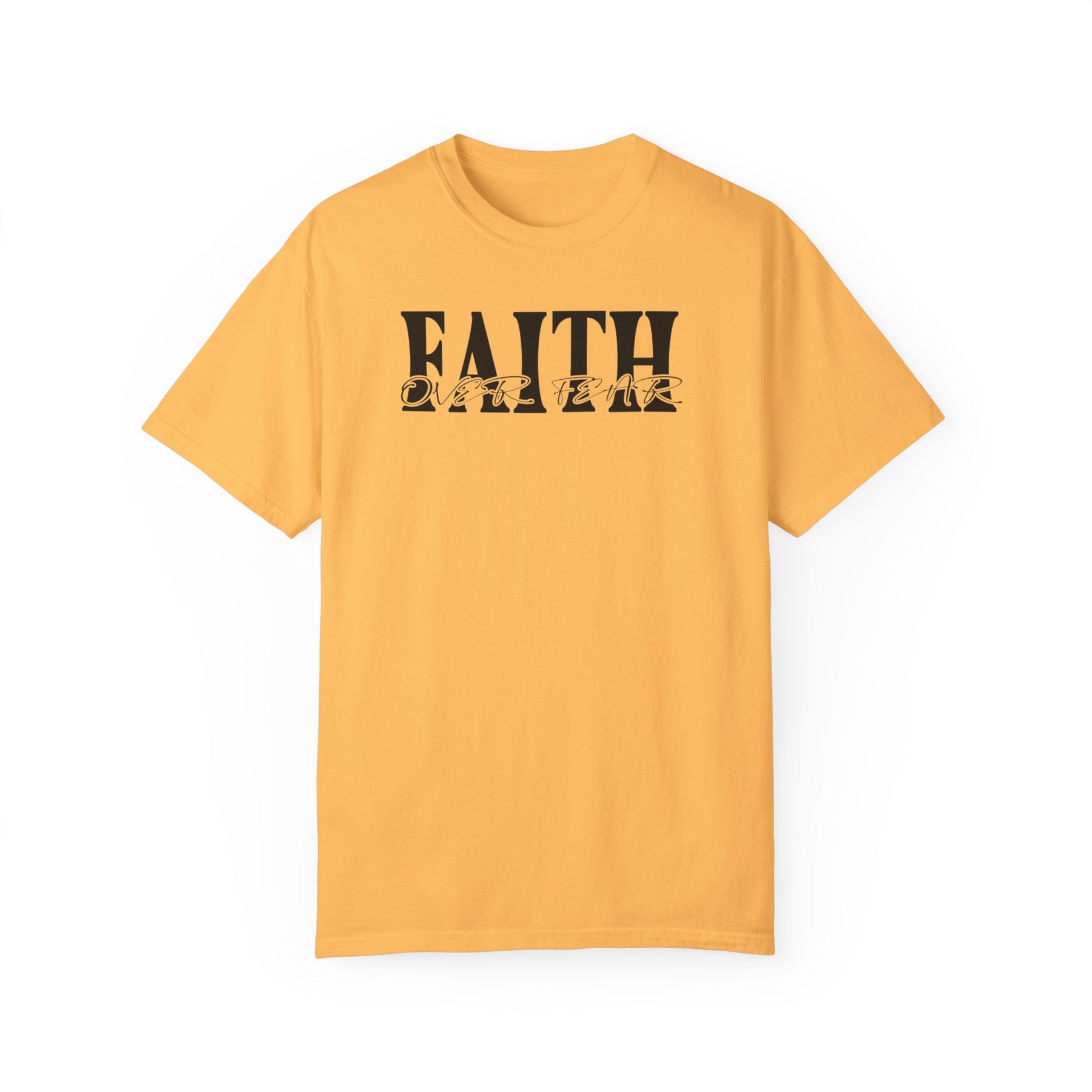 A yellow Faith Over Fear Tee, crafted from 100% ring-spun cotton. Garment-dyed for extra coziness, with a relaxed fit and durable double-needle stitching. No side-seams for a tubular shape.