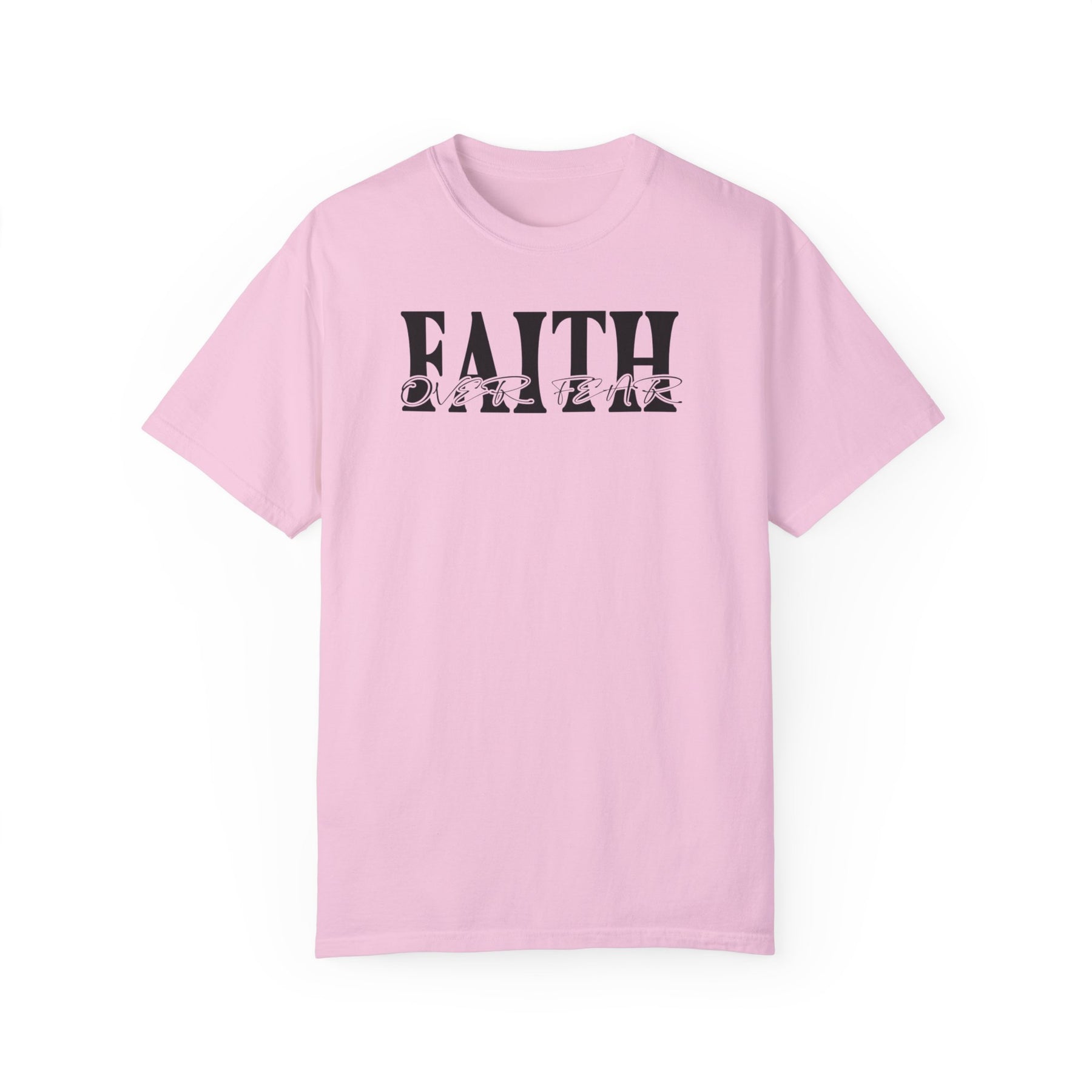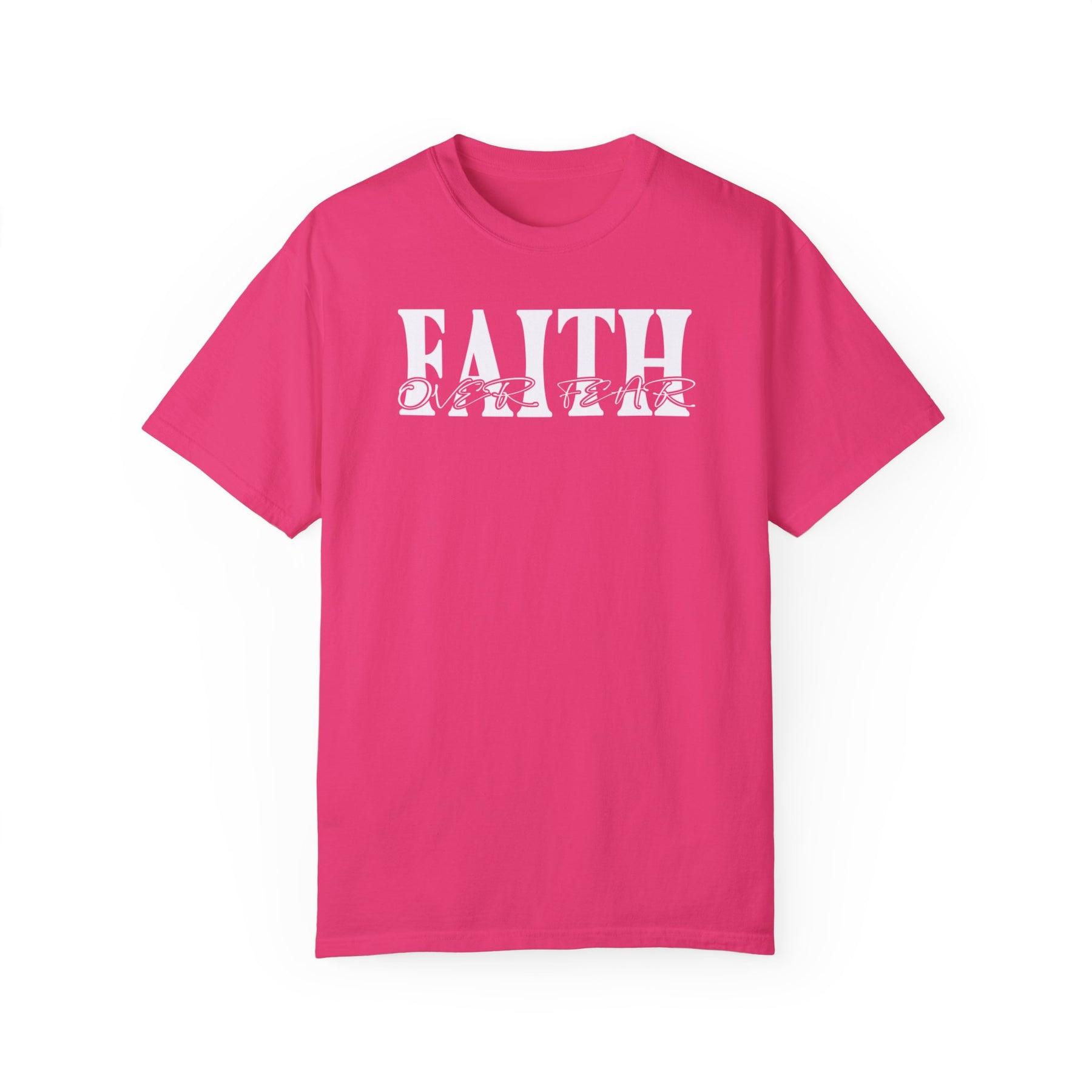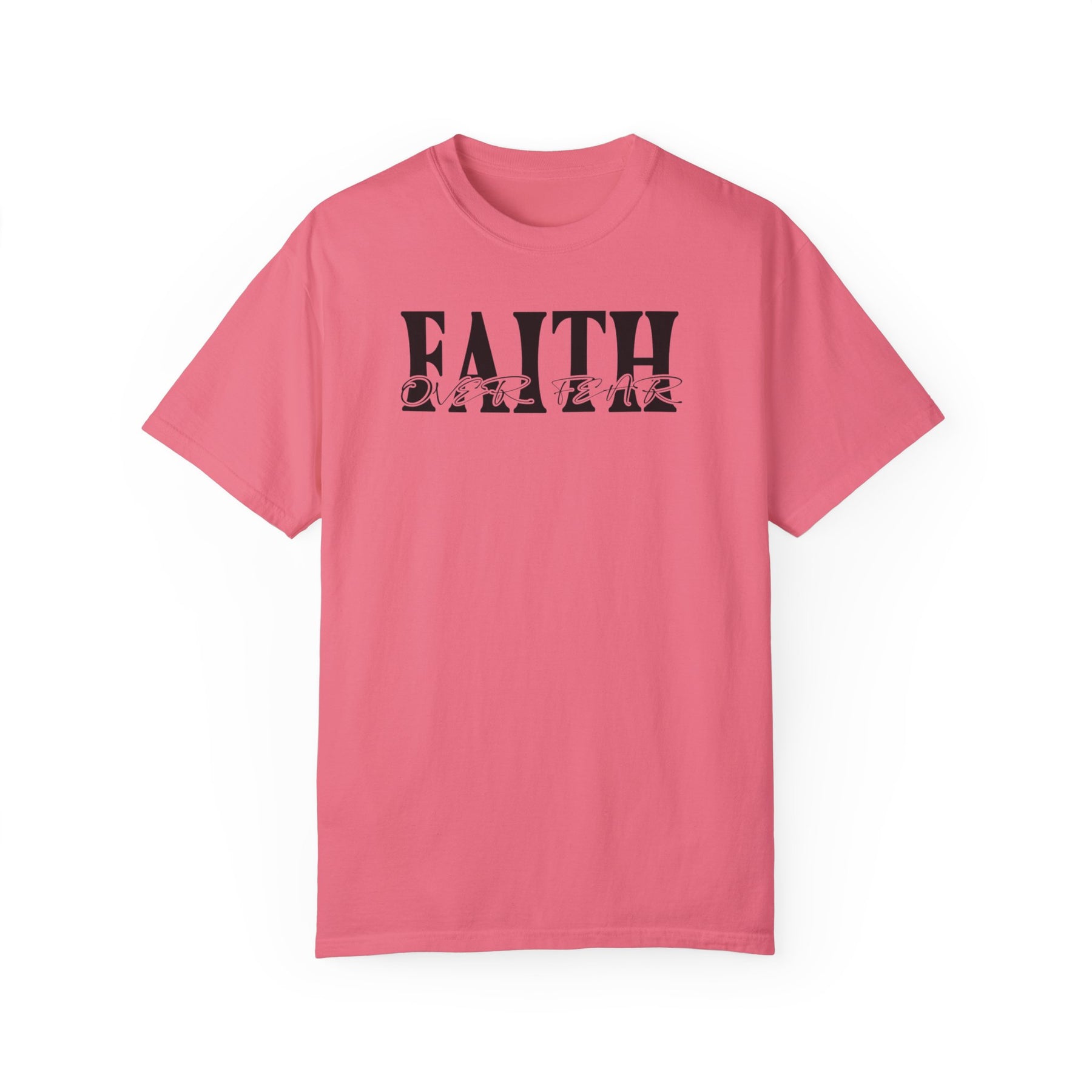 A Faith Over Fear Tee, a pink shirt with white text, crafted from 100% ring-spun cotton. Garment-dyed for coziness, featuring a relaxed fit and durable double-needle stitching. Ideal for daily wear.