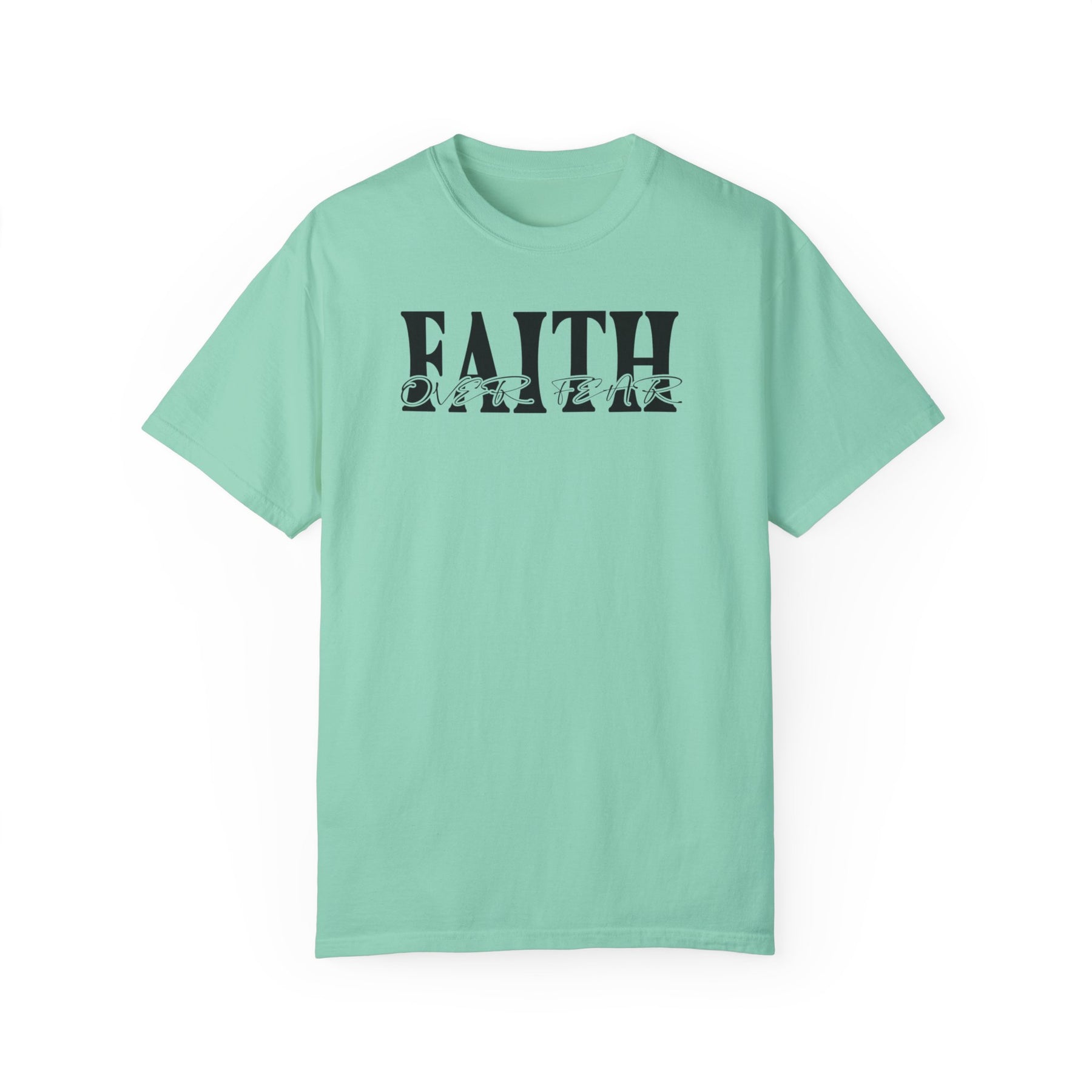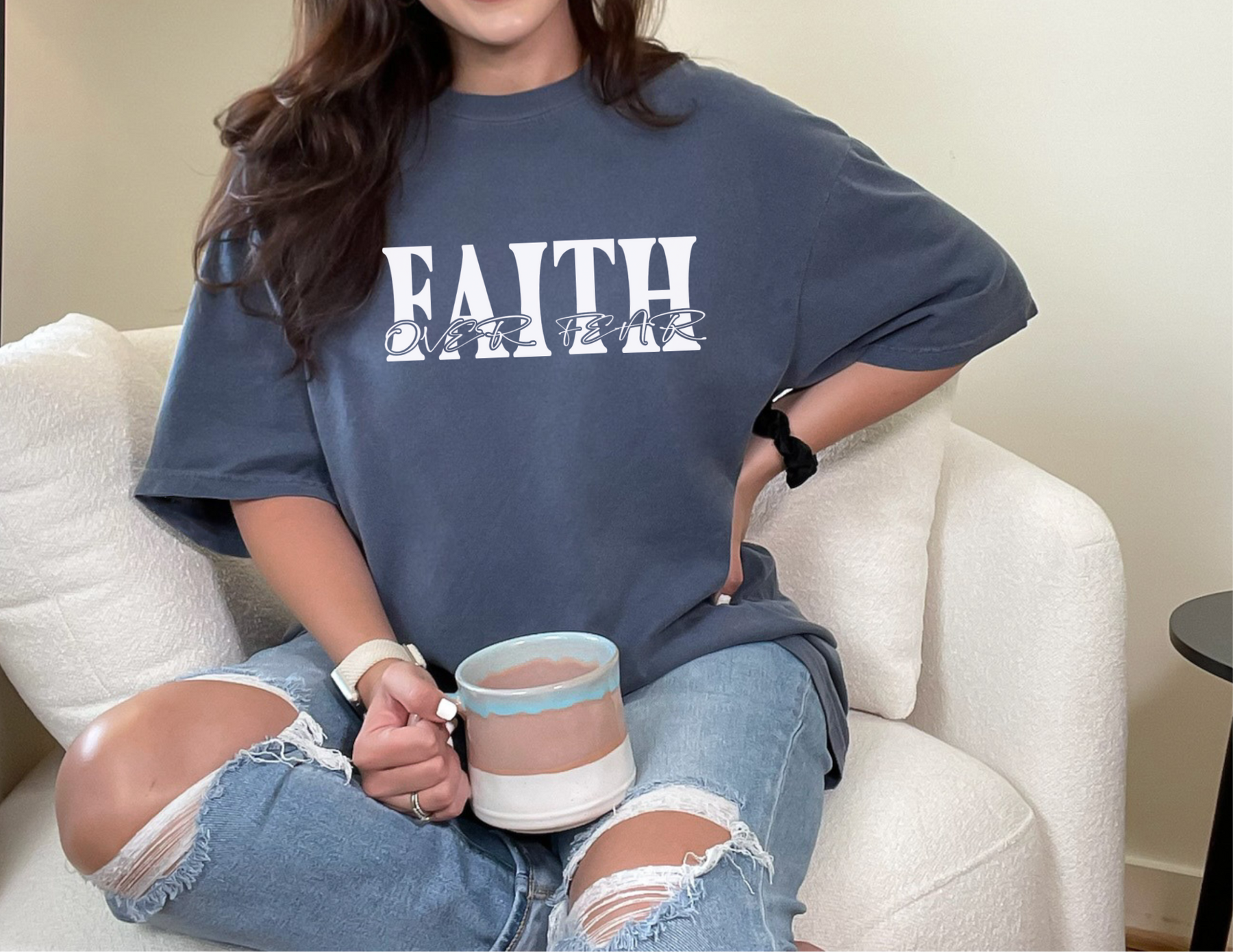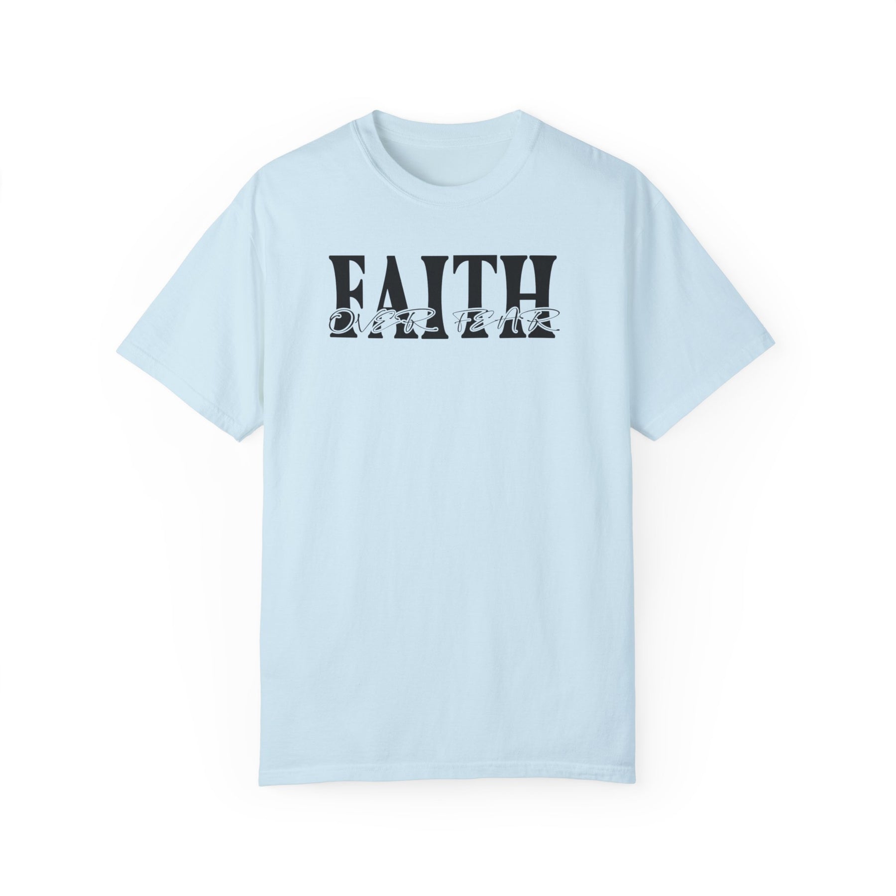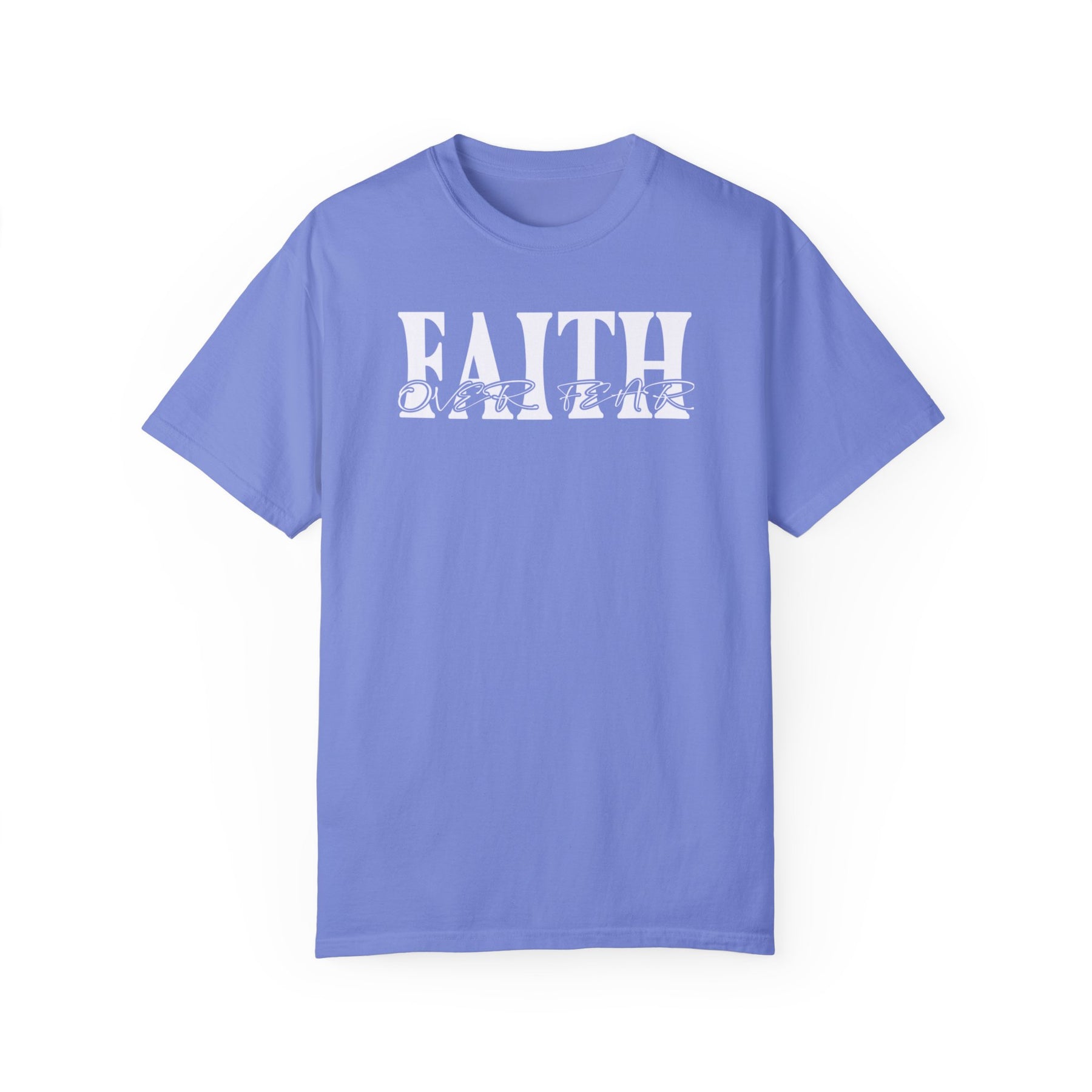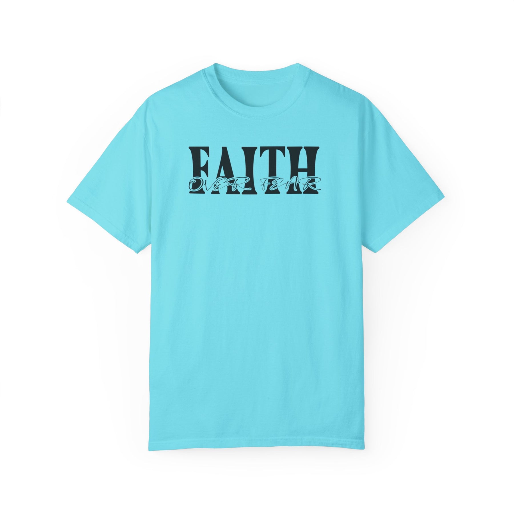 A Faith Over Fear Tee, a garment-dyed t-shirt in blue with white text. Made of 100% ring-spun cotton for coziness, featuring a relaxed fit and durable double-needle stitching. Ideal for daily wear.
