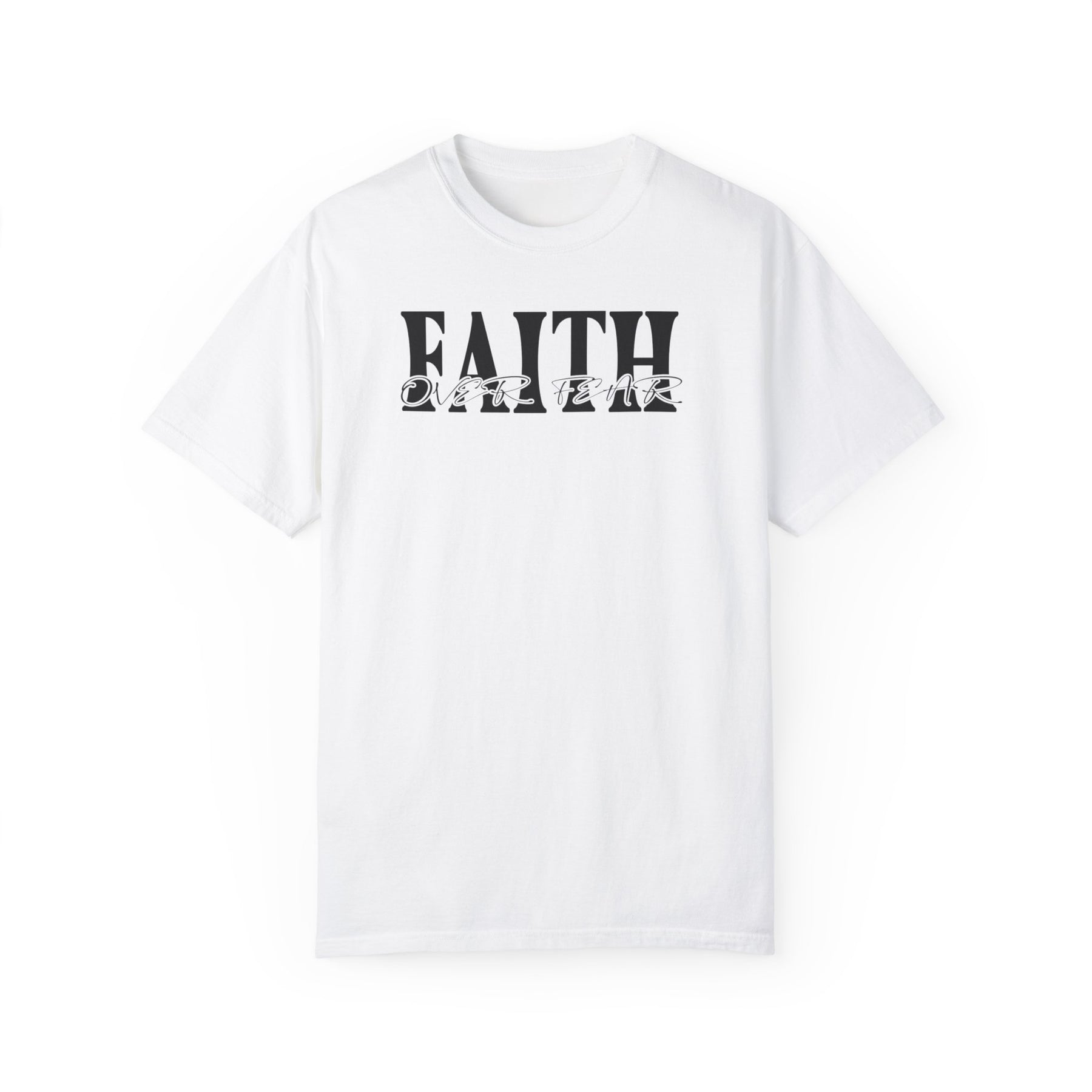 A white Faith Over Fear Tee, featuring black text on ring-spun cotton. Garment-dyed for coziness, with a relaxed fit, double-needle stitching, and seamless design for durability and comfort.