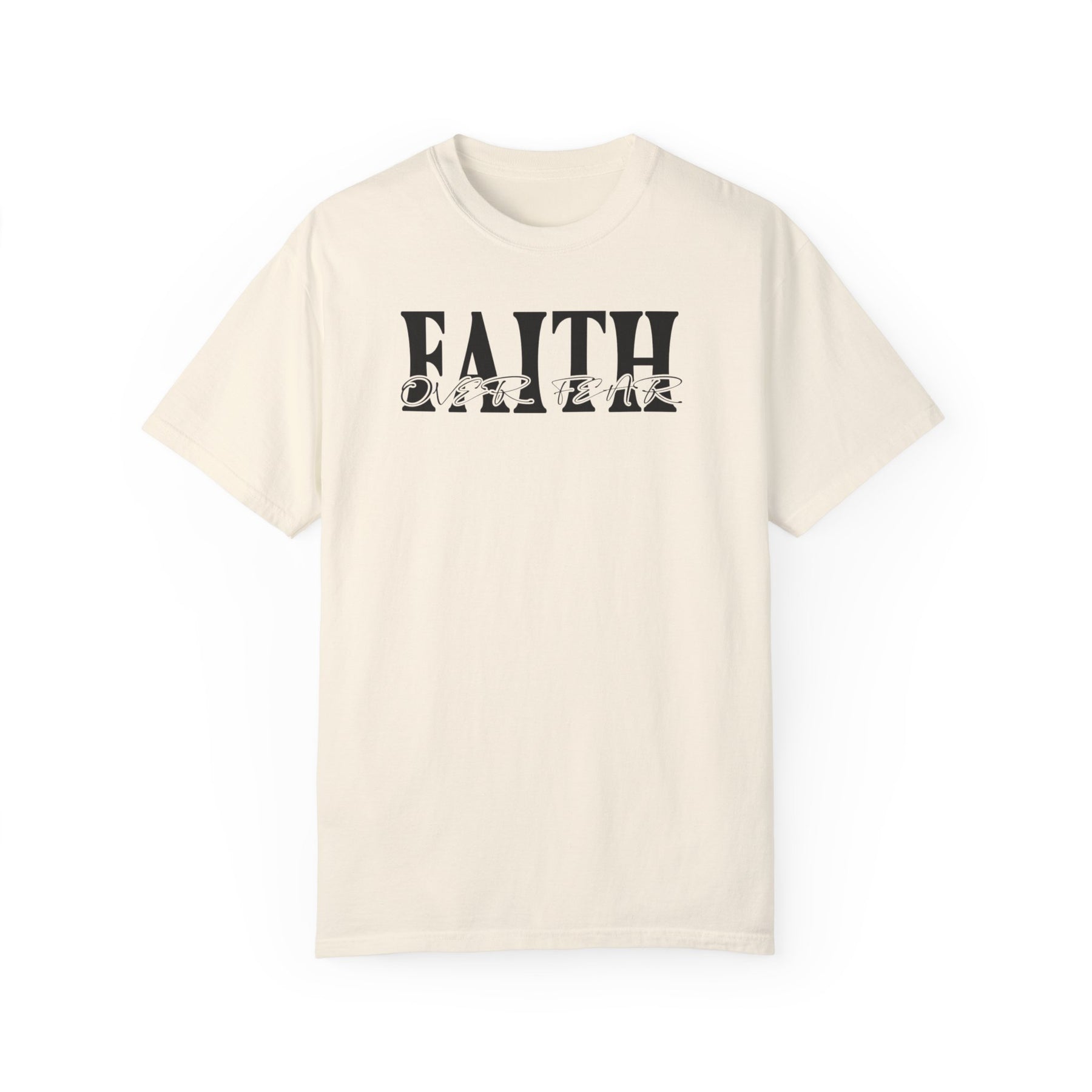 A relaxed fit Faith Over Fear Tee, crafted from 100% ring-spun cotton. Garment-dyed for coziness, with double-needle stitching for durability and a seamless design for a tubular shape.