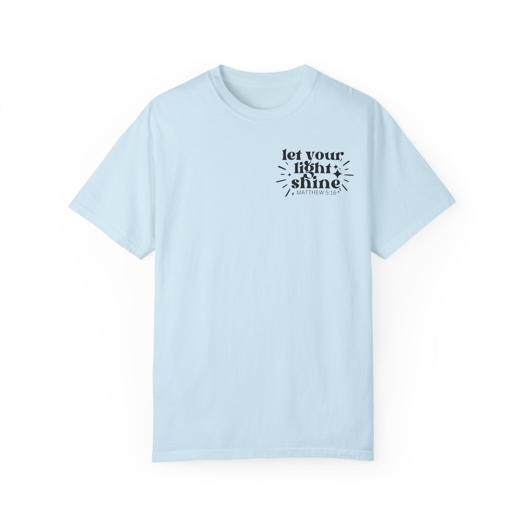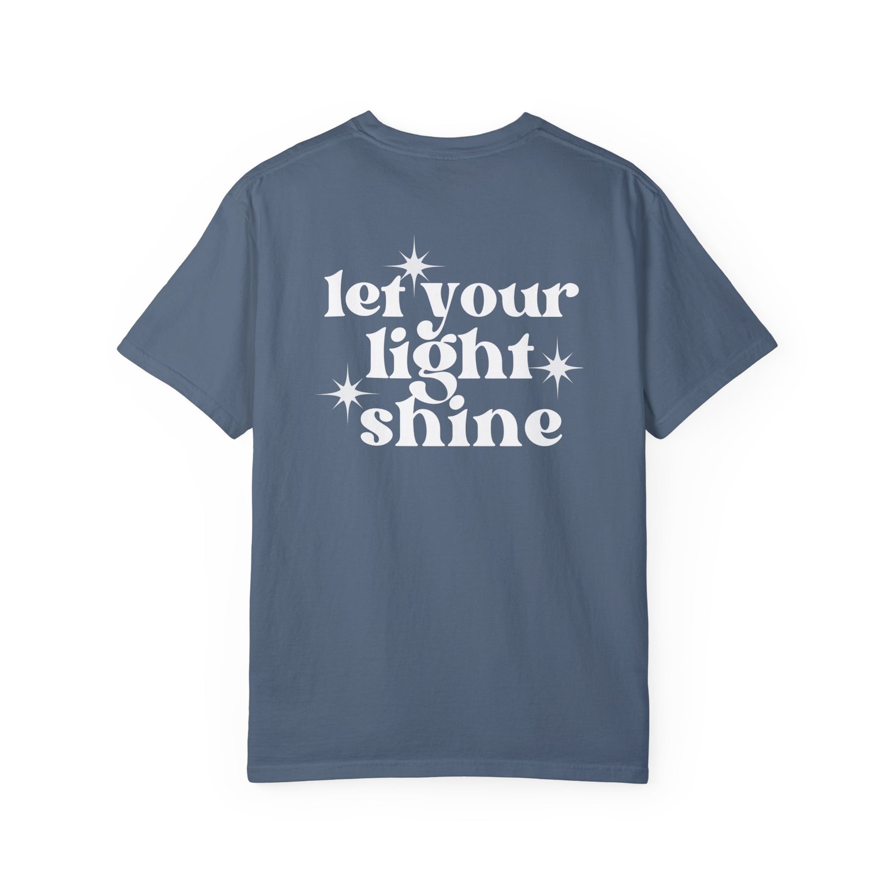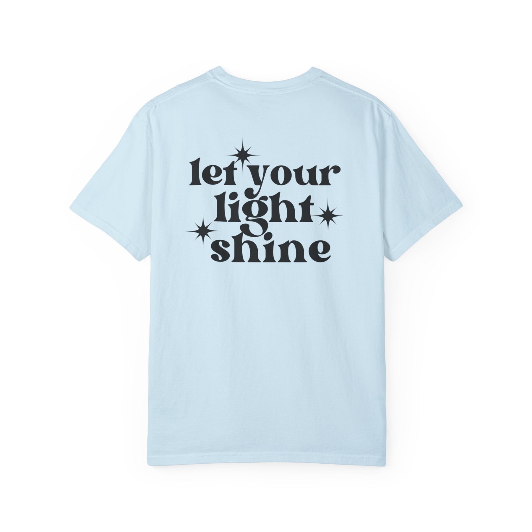 Let Your Light Shine Tee: Light blue t-shirt with black text. 100% ring-spun cotton, garment-dyed for coziness. Relaxed fit, double-needle stitching for durability. No side-seams for a tubular shape.