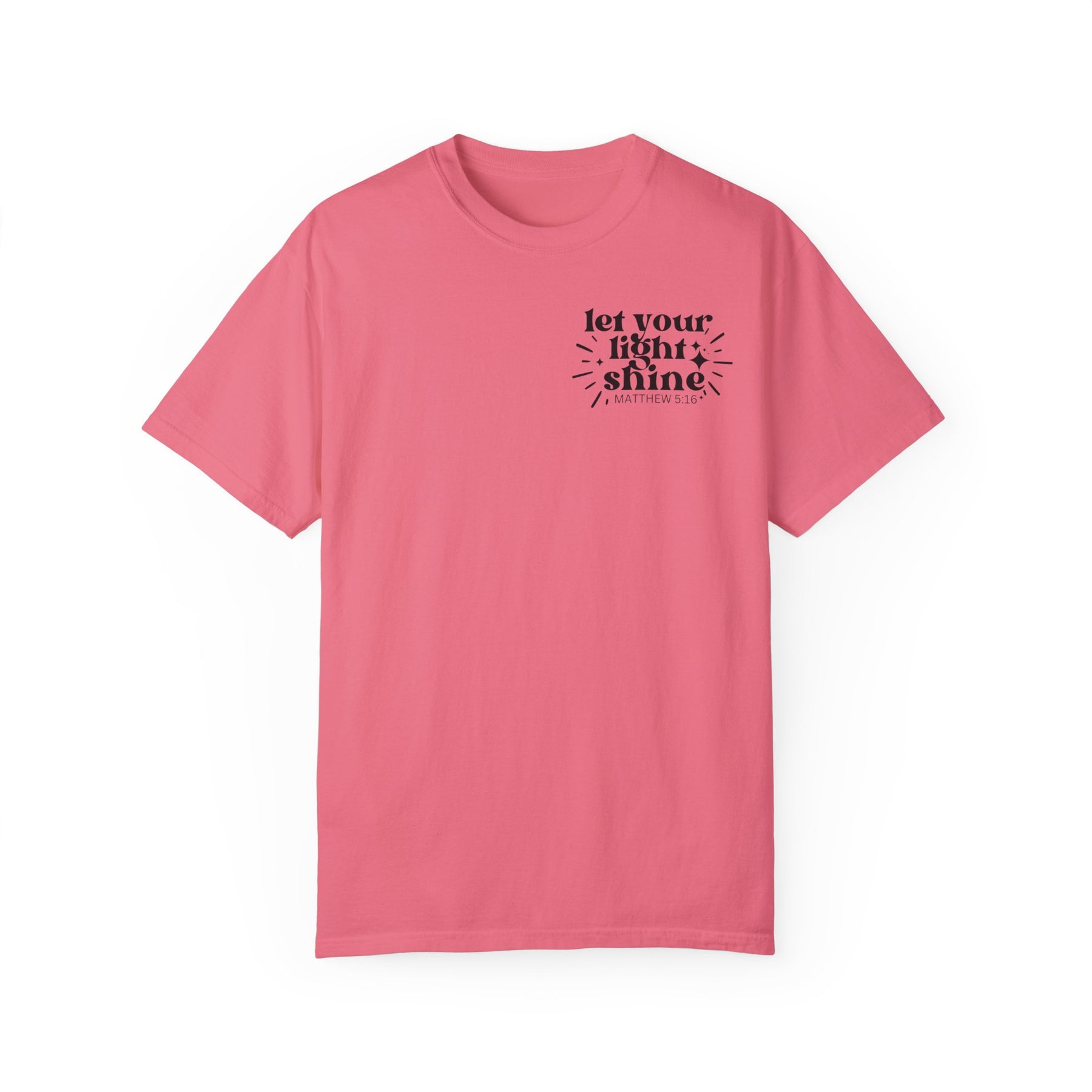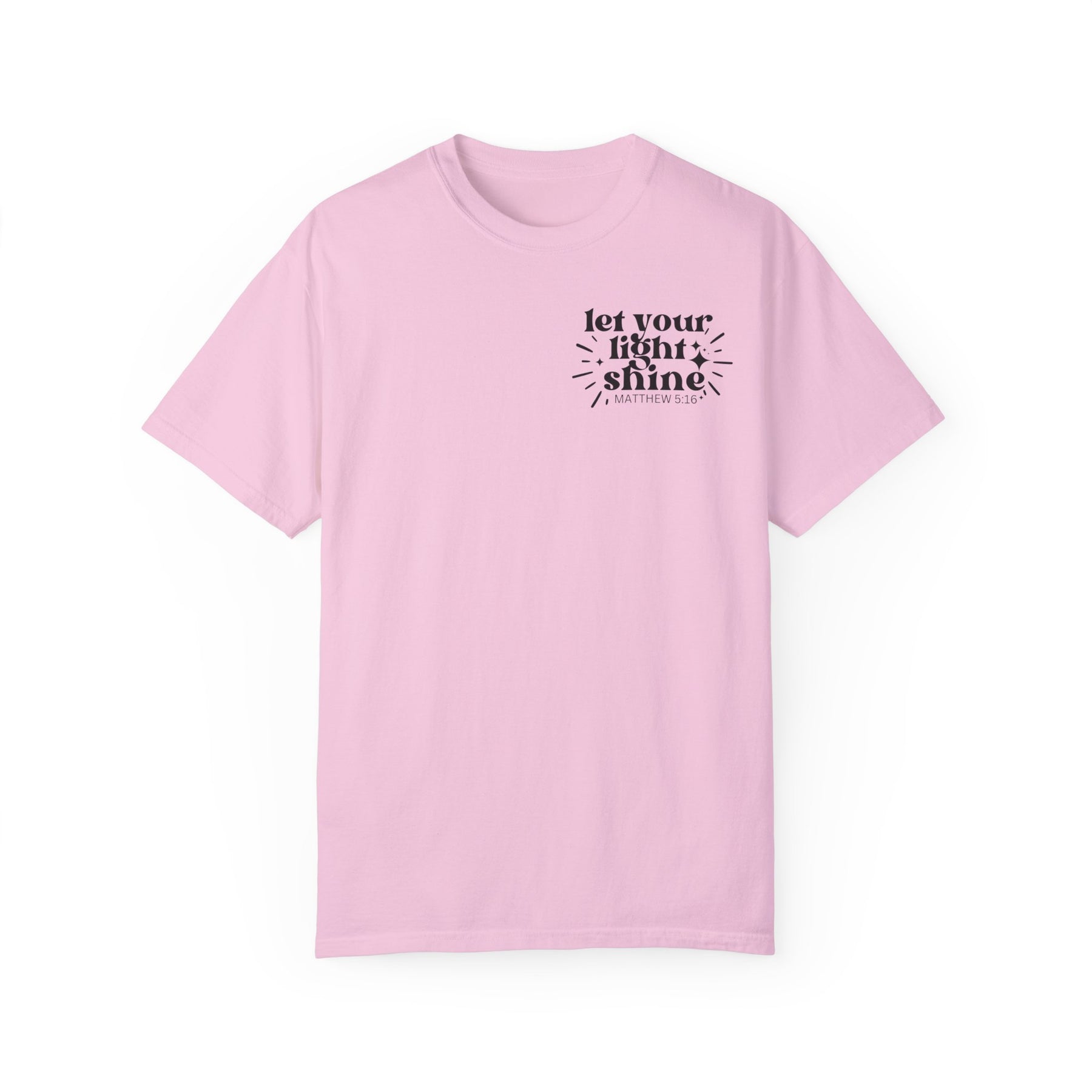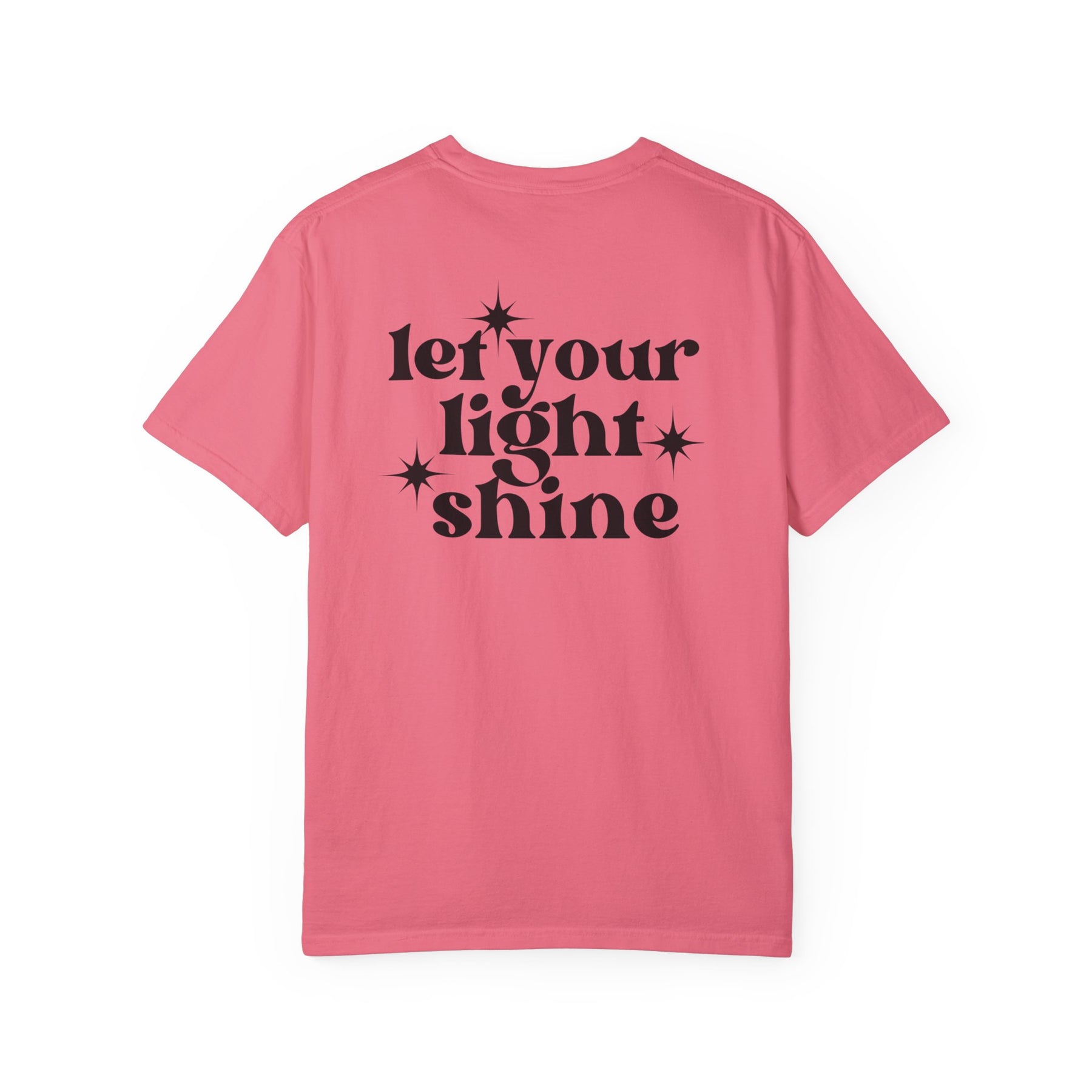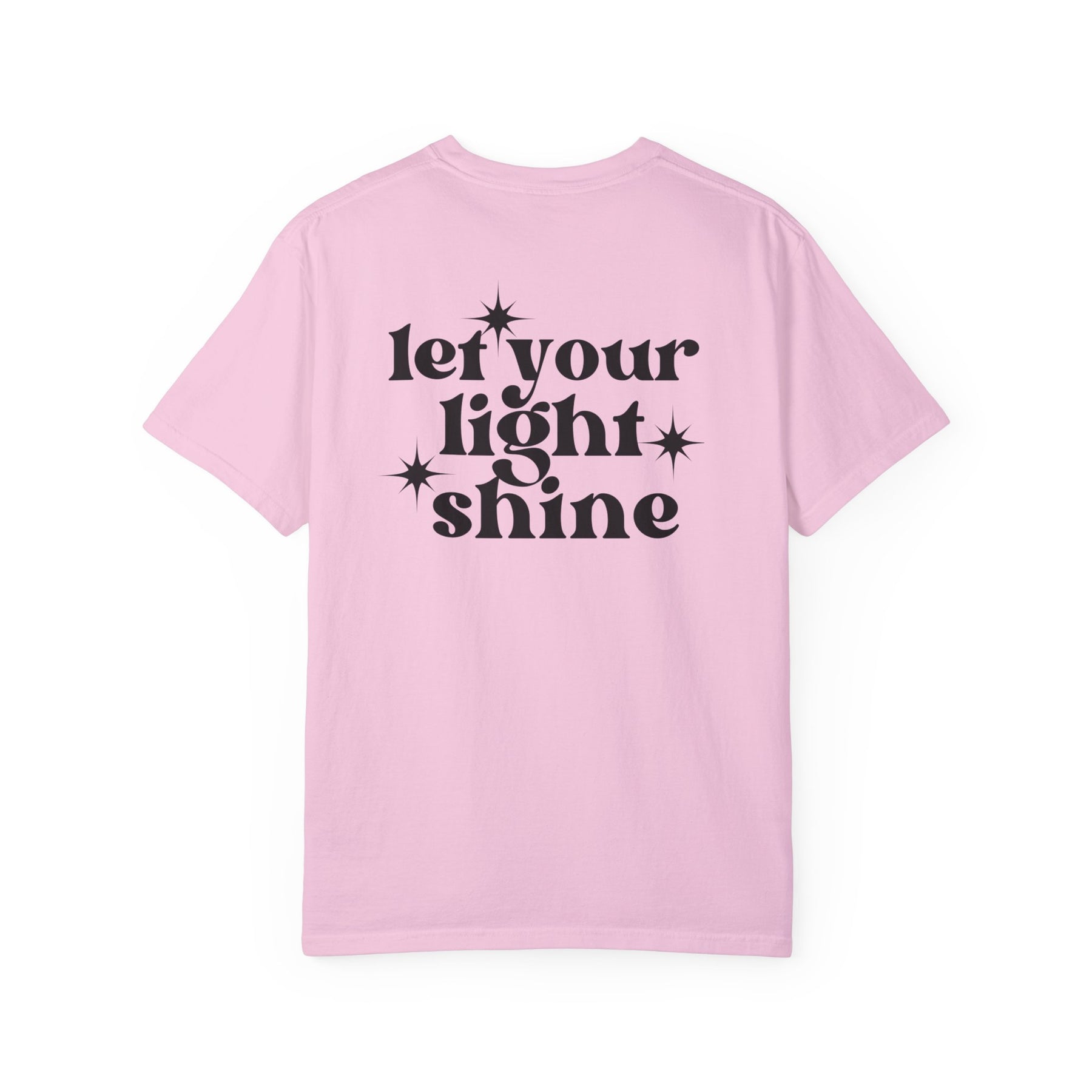 Let Your Light Shine Tee: Pink t-shirt with black text. 100% ring-spun cotton, garment-dyed for coziness. Relaxed fit, durable double-needle stitching, no side-seams. Sizes S to 3XL.