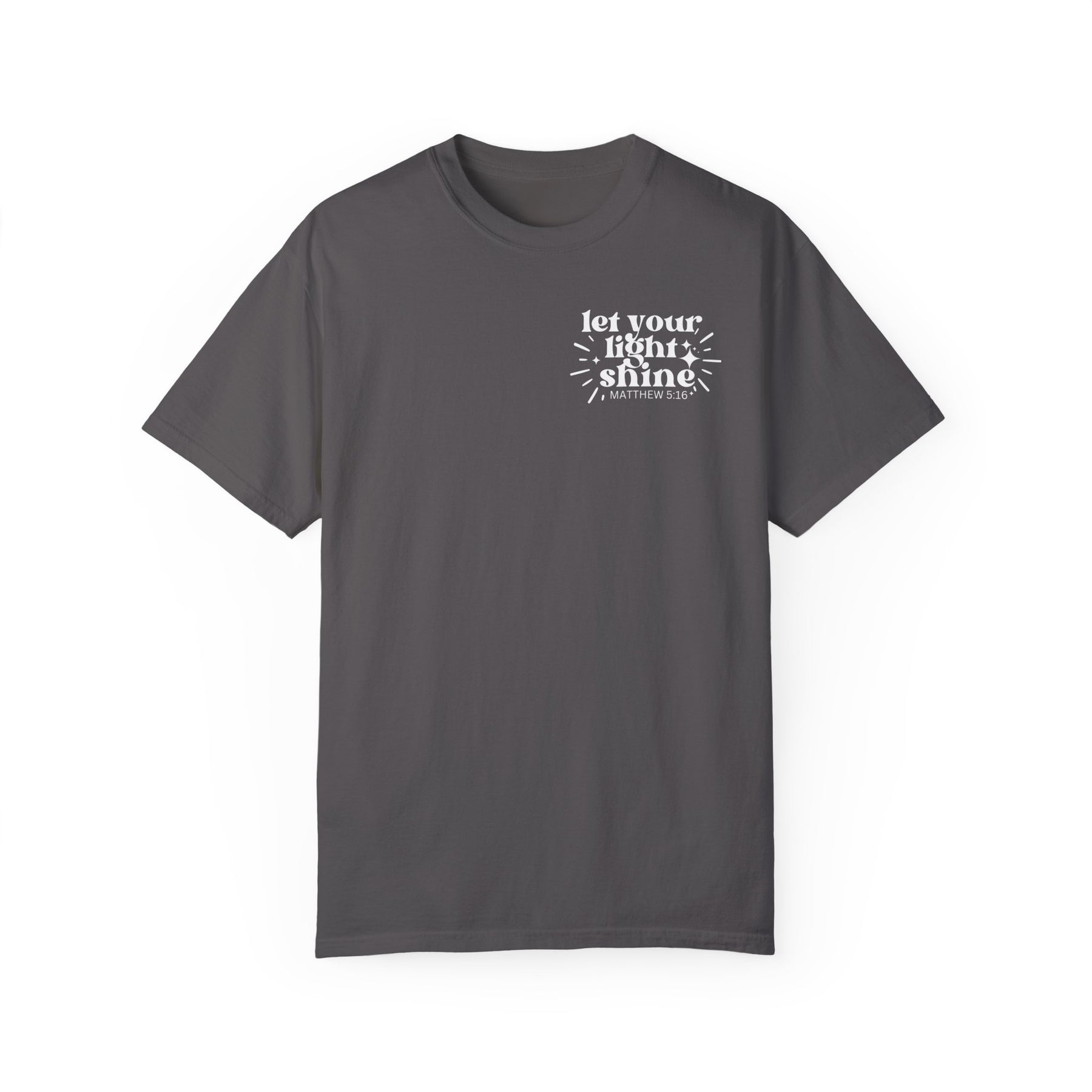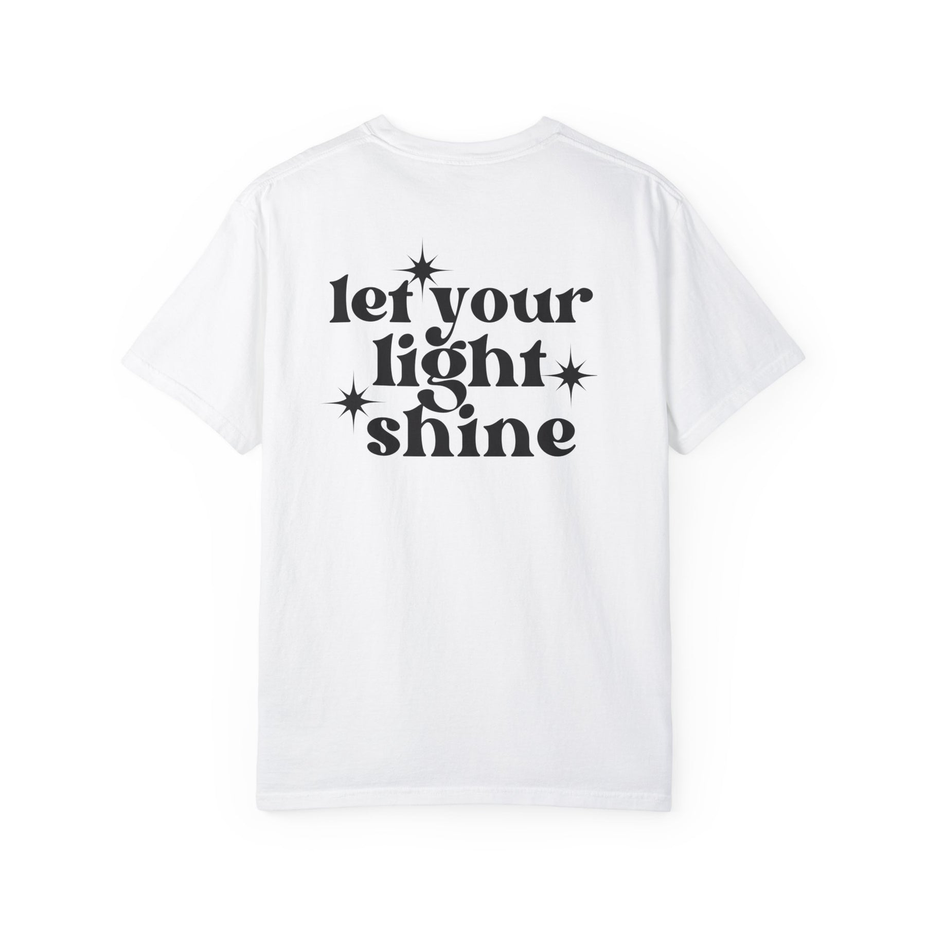 A relaxed-fit Let Your Light Shine Tee, a garment-dyed t-shirt crafted from 100% ring-spun cotton. Features double-needle stitching for durability and a seamless design for a tubular shape. Sizes range from S to 3XL.