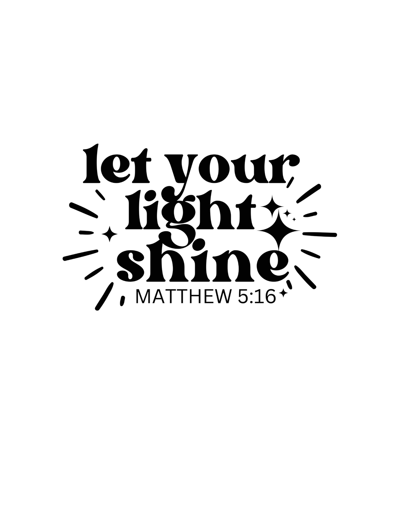 Relaxed fit Let Your Light Shine Tee, a white shirt with black text. 100% ring-spun cotton, garment-dyed for coziness. Durable double-needle stitching, no side-seams for a tubular shape.