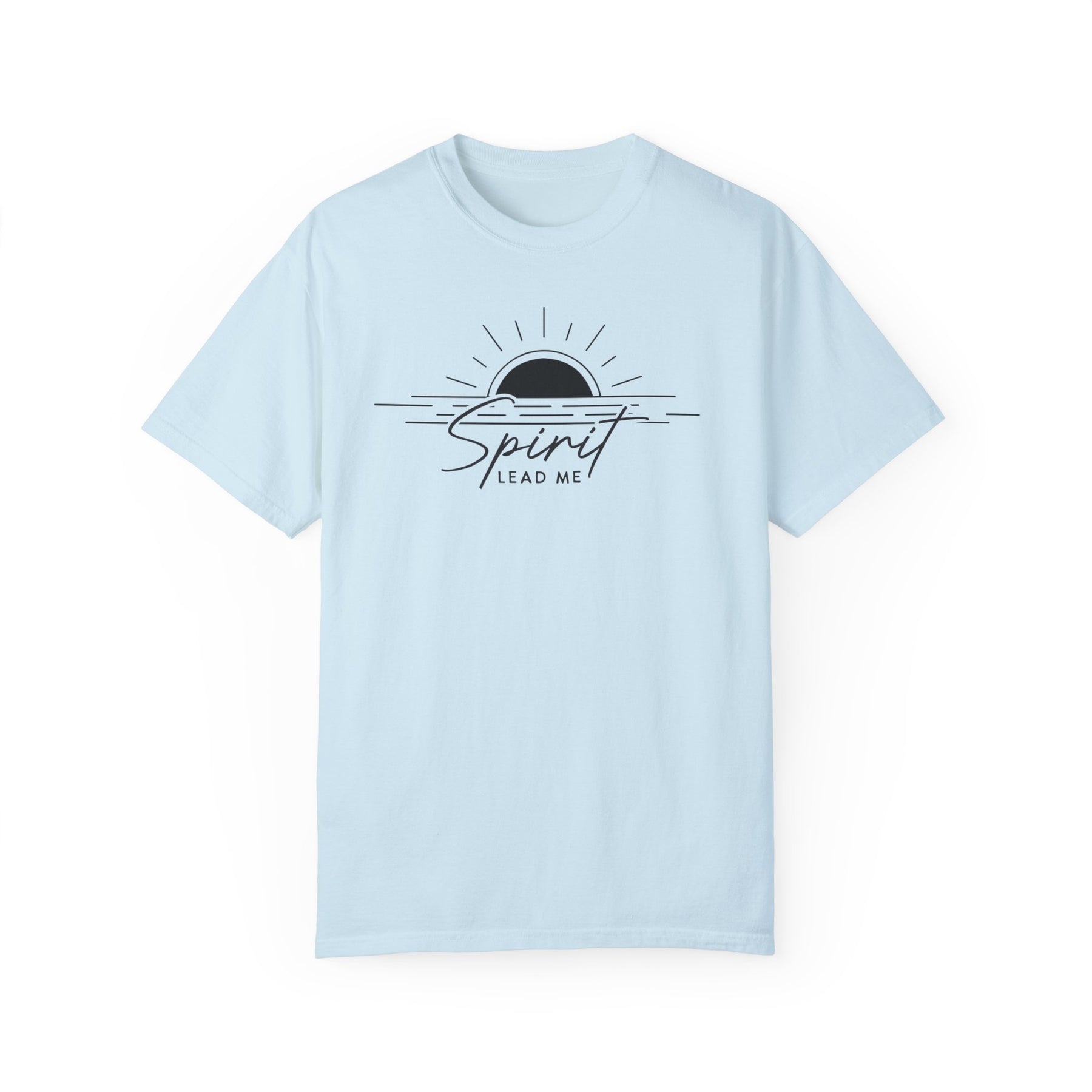 A Spirit Lead Me Tee, light blue with a logo of a sun and water, 100% ring-spun cotton, relaxed fit, durable double-needle stitching, no side-seams for tubular shape.