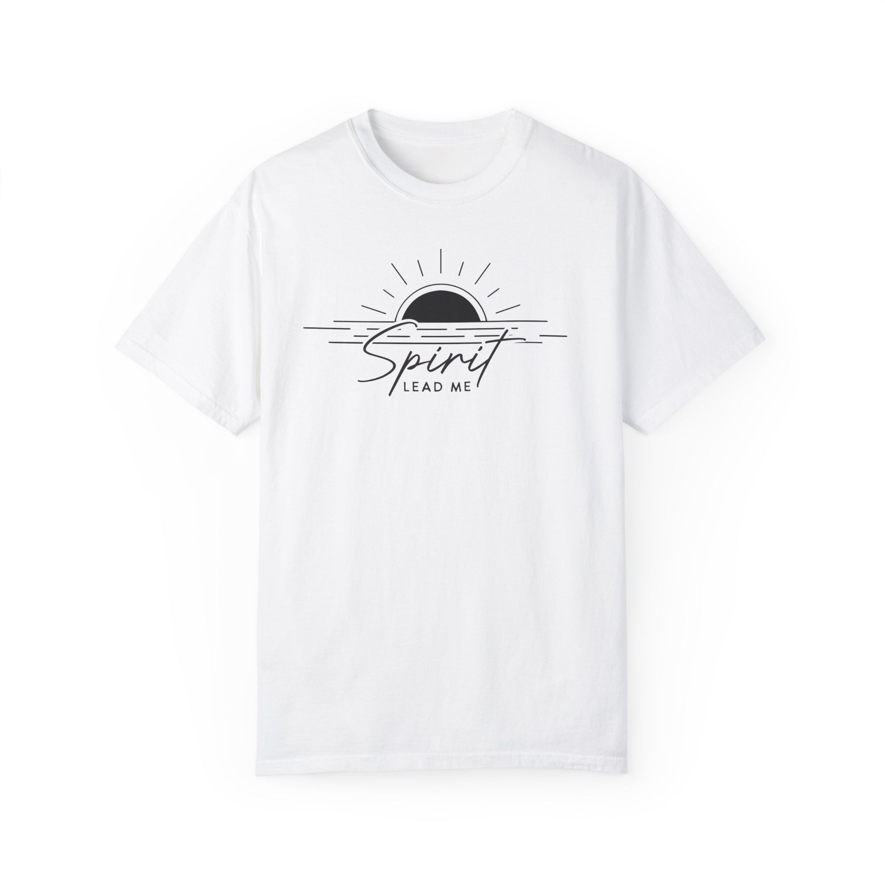 A relaxed fit Spirit Lead Me Tee, a white t-shirt with a logo, crafted from 100% ring-spun cotton. Garment-dyed for coziness, featuring double-needle stitching for durability and a seamless design for a tubular shape.