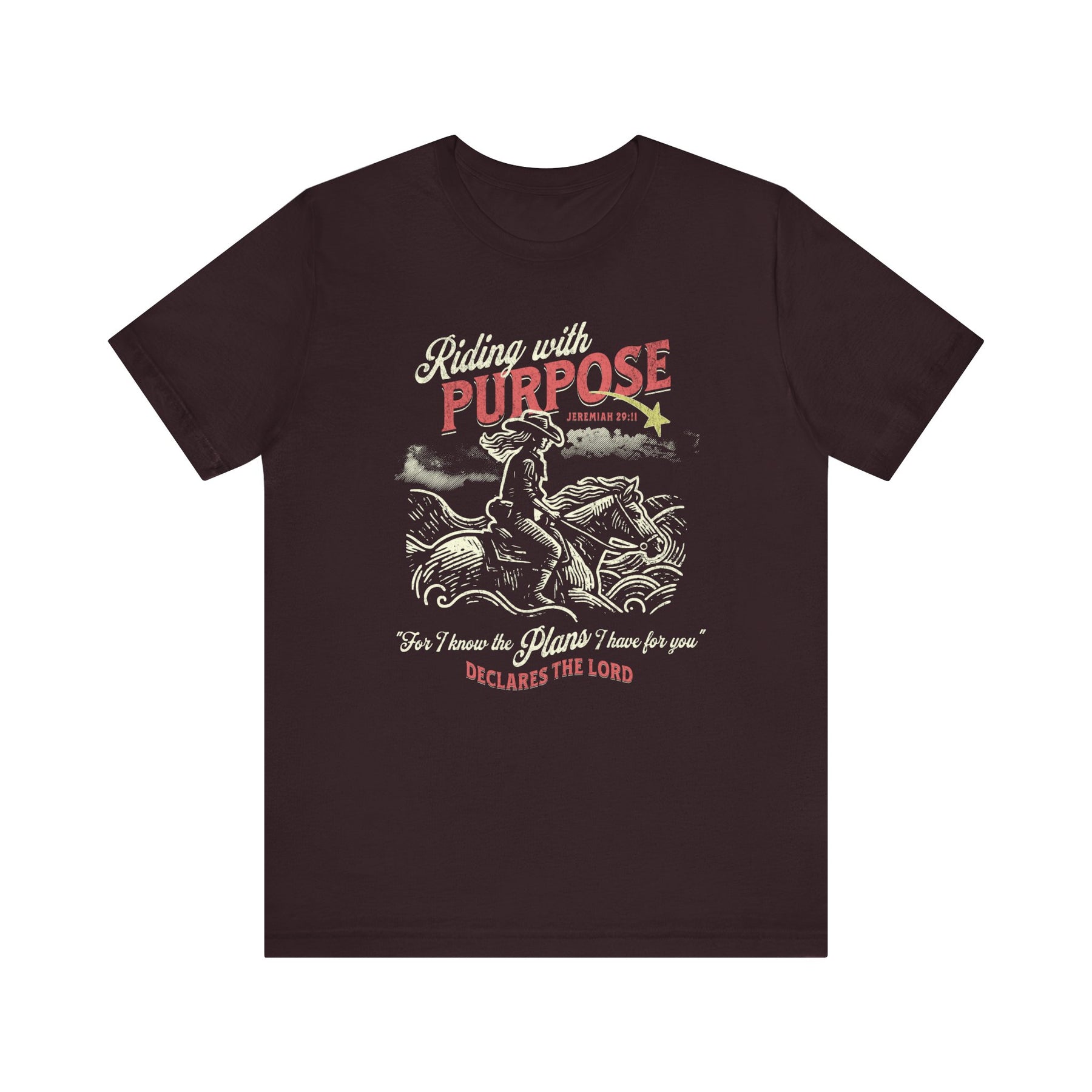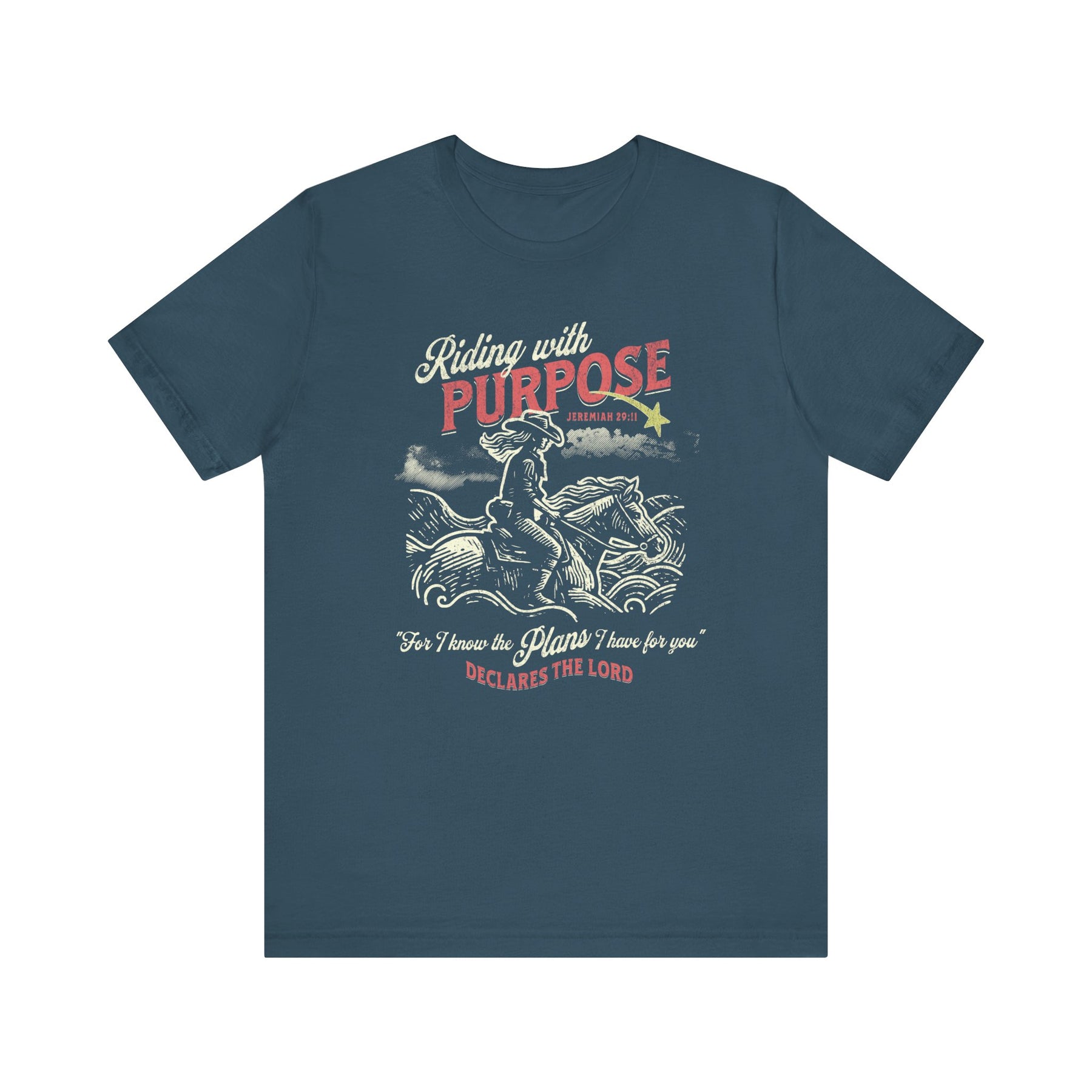 Riding for a Purpose Tee featuring a cowboy graphic, unisex jersey, soft cotton, ribbed collar, and dual side seams for lasting shape.