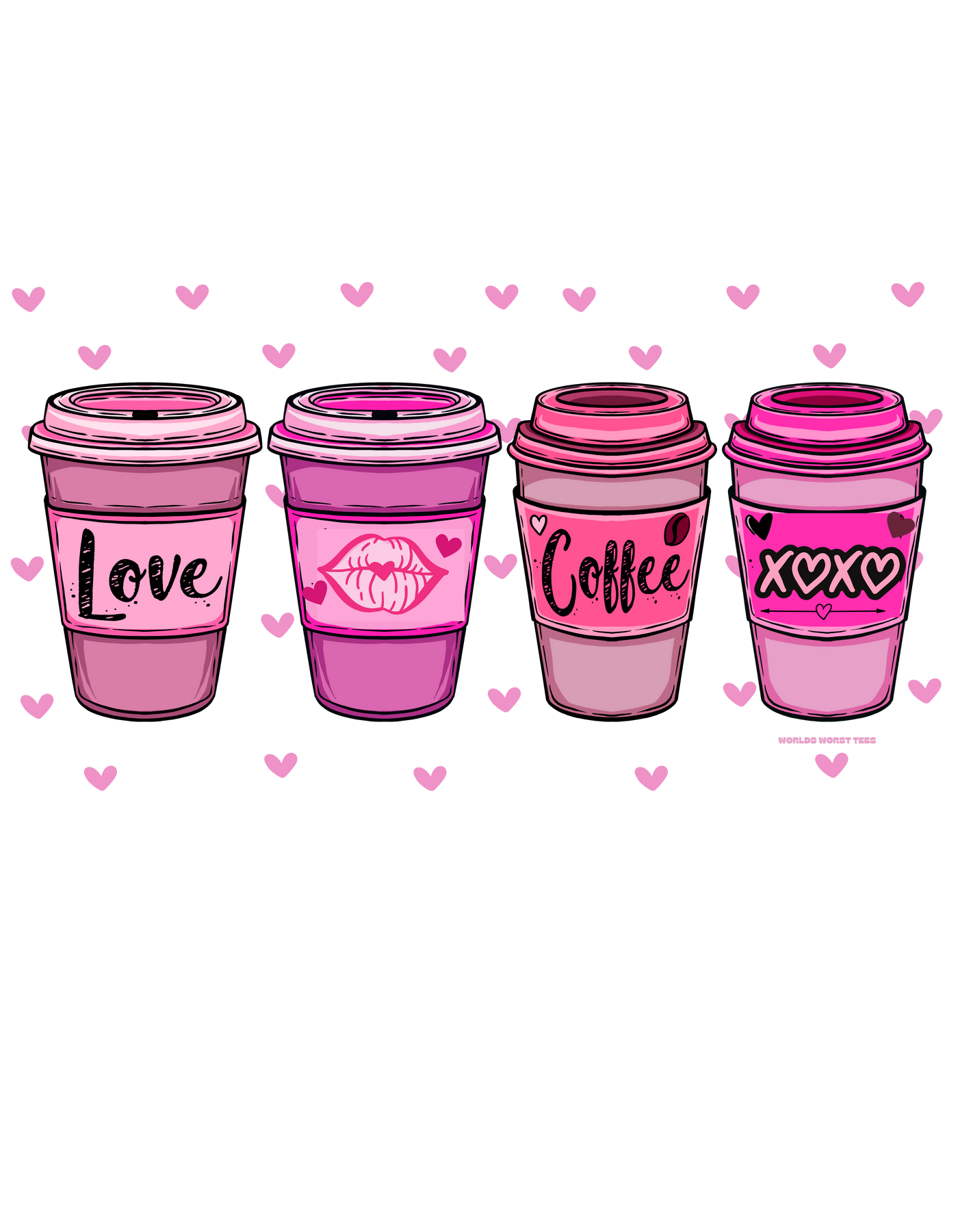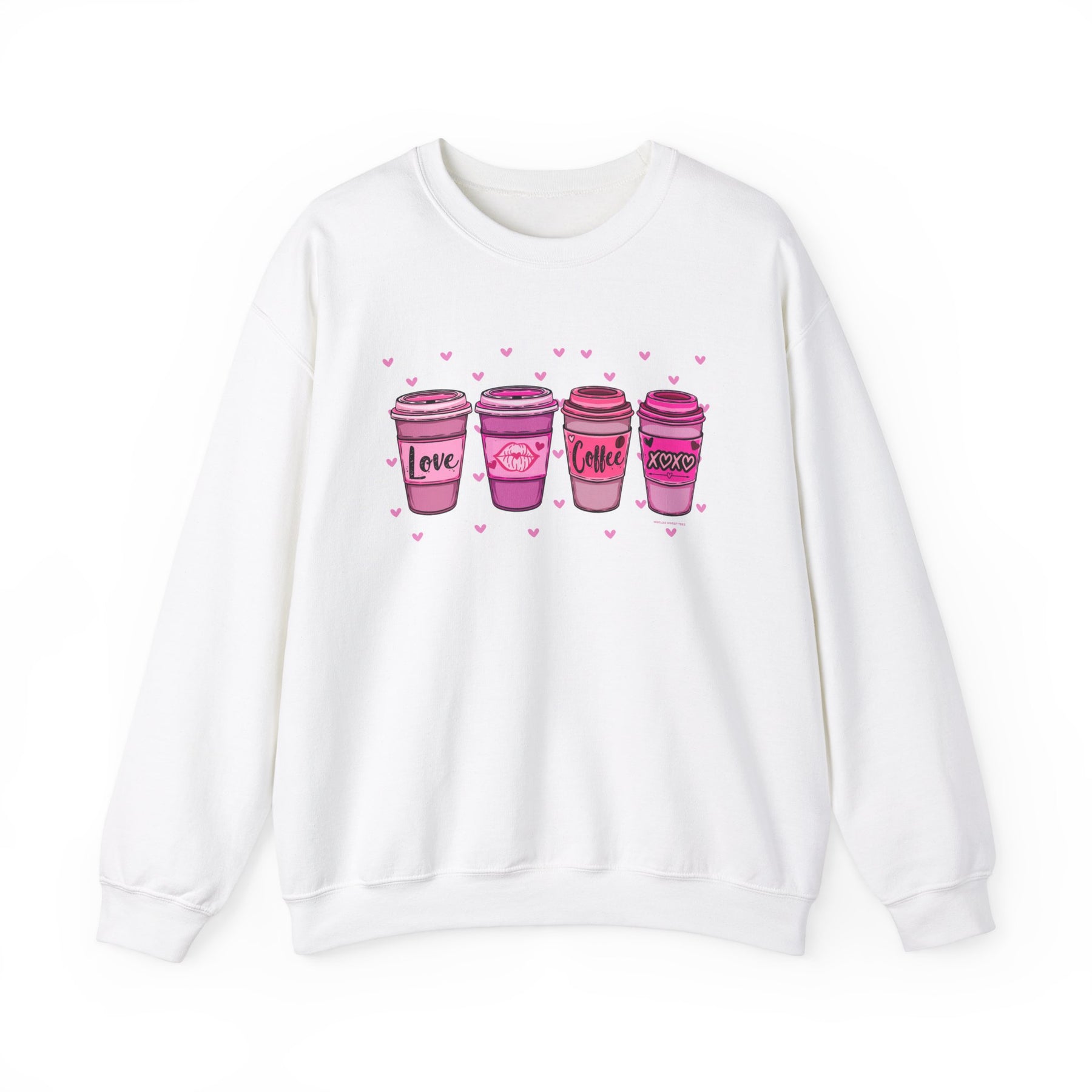 Unisex XOXO Coffee Crew sweatshirt, white with pink coffee cups. Medium-heavy blend, ribbed knit collar, no itchy seams. Comfortable, loose fit. Ideal for any occasion.
