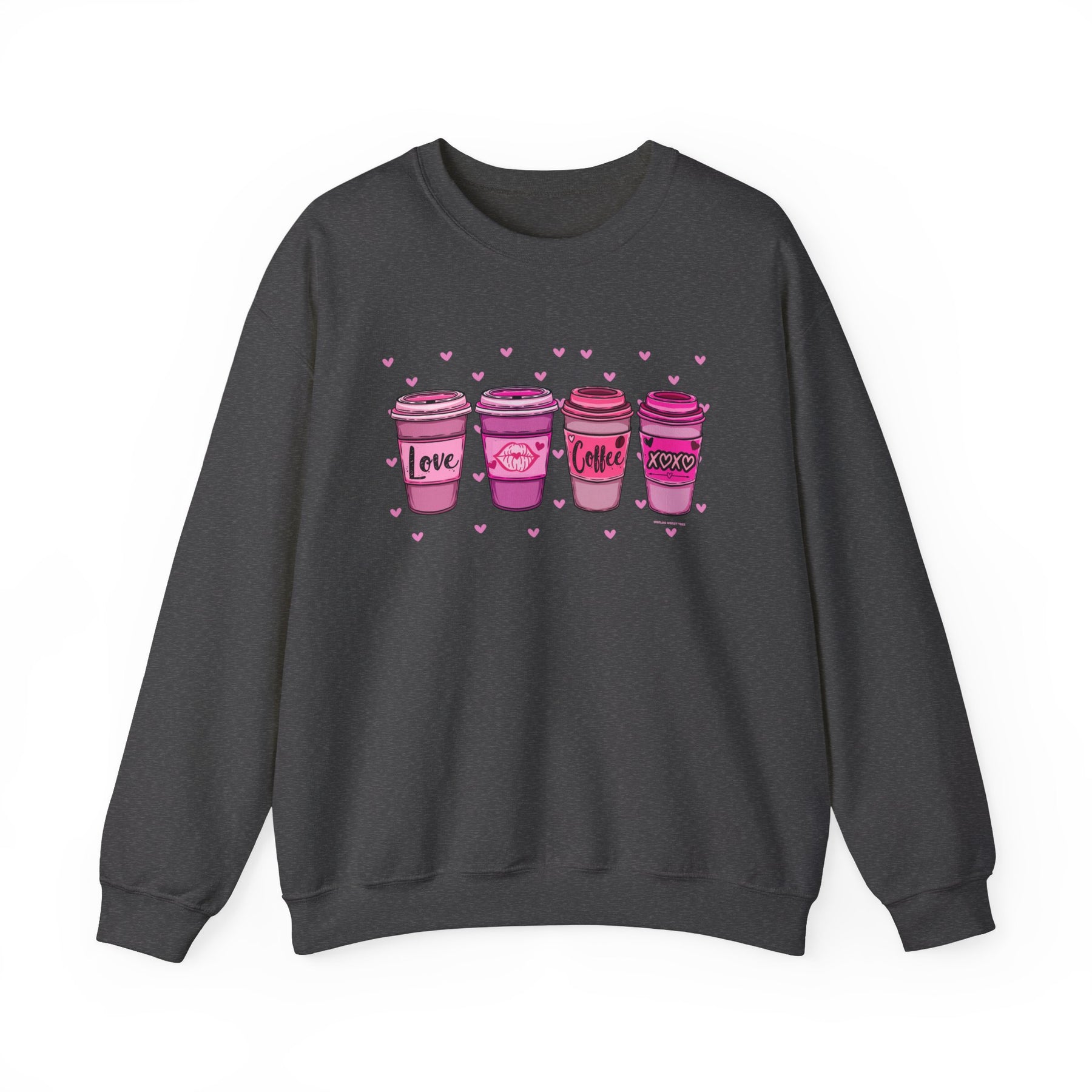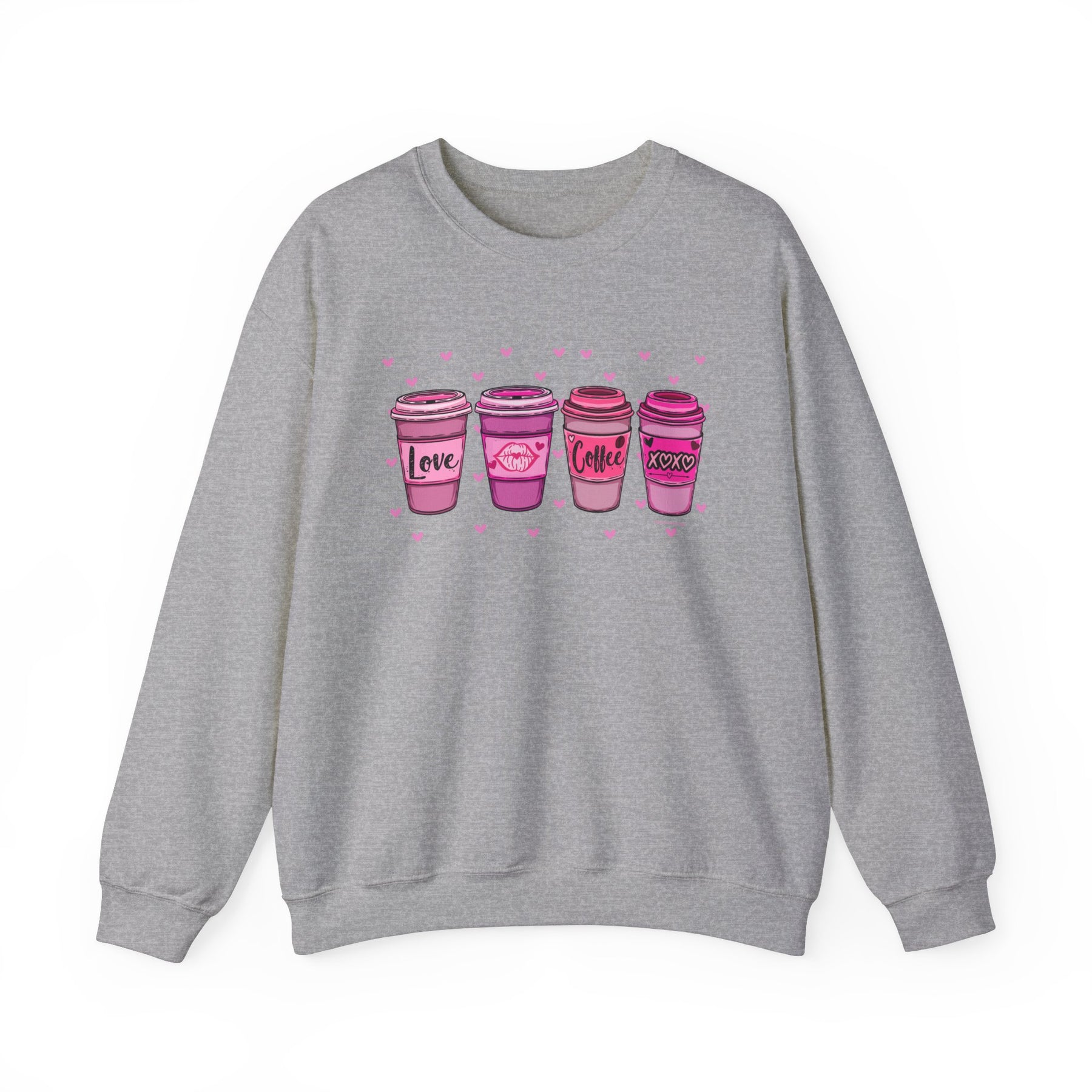Unisex XOXO Coffee Crew sweatshirt, grey with pink coffee cups. Heavy blend fabric, ribbed knit collar, no itchy seams. Sizes S-5XL. Ideal comfort for any occasion.