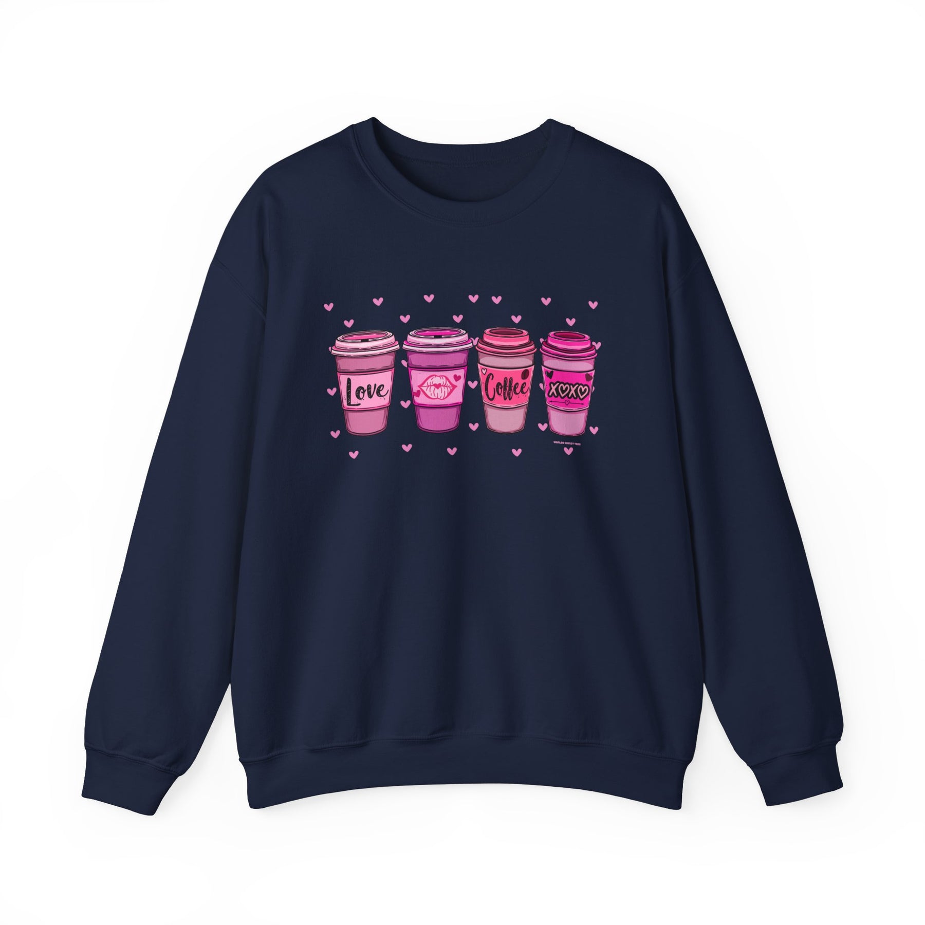 A cozy unisex XOXO Coffee Crew sweatshirt featuring pink coffee cups on blue fabric. Made of 50% cotton, 50% polyester blend for comfort and durability. Ribbed knit collar, loose fit, and no itchy side seams.