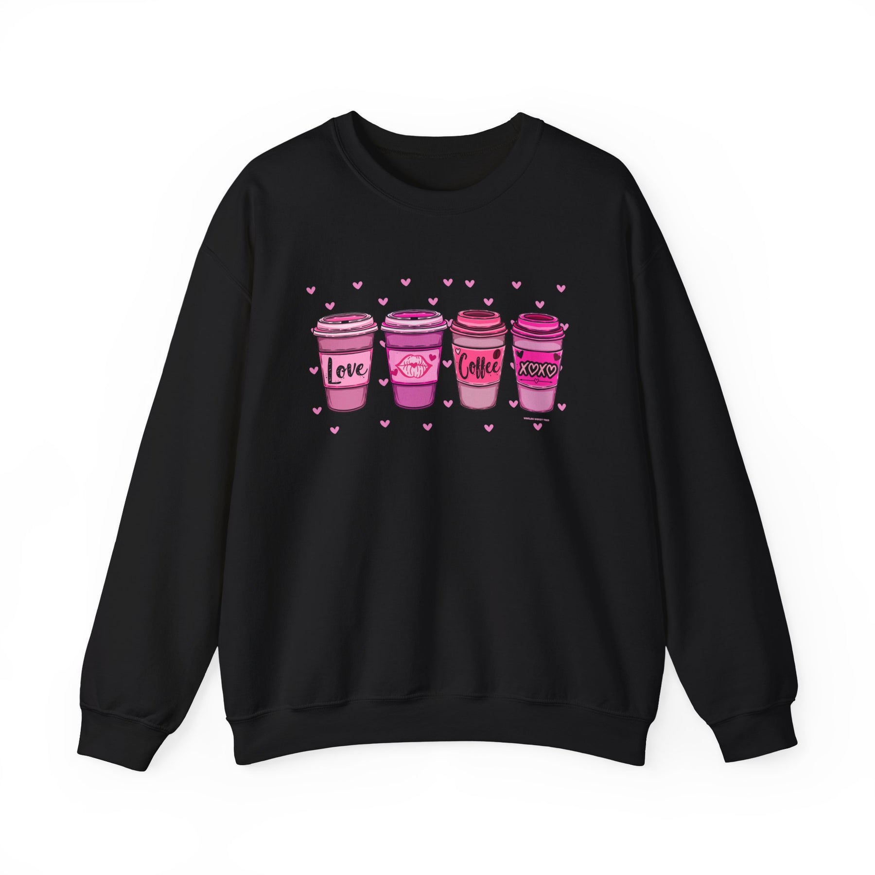 Unisex XOXO Coffee Crew sweatshirt featuring coffee cup design. Heavy blend fabric, ribbed knit collar, no itchy seams. Sizes S-5XL. Ideal comfort for any occasion.