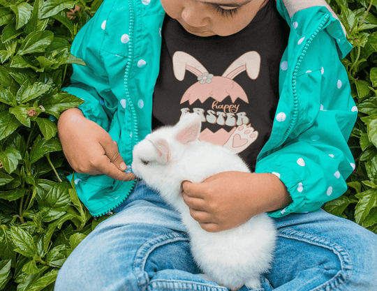 A toddler happily holds a white rabbit on a comfy Happy Easter Toddler Tee. Classic fit, high stitch density, and durable double-needle collar, sleeves, and hems. Made of 100% Ringspun cotton.