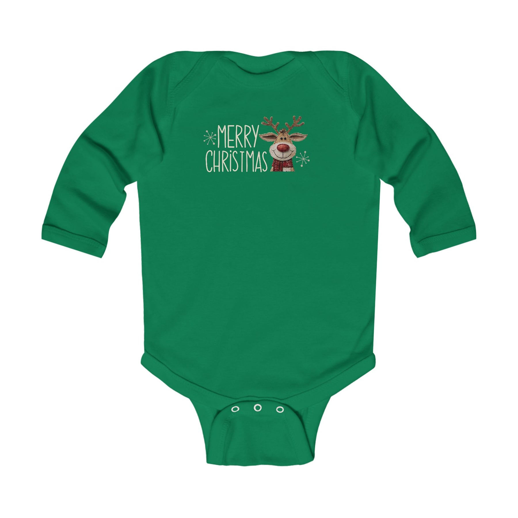 Merry Christmas Reindeer Onesie: Green infant long-sleeved bodysuit featuring a festive reindeer graphic, perfect for holiday celebrations. Soft, durable fabric with easy-change plastic snaps.
