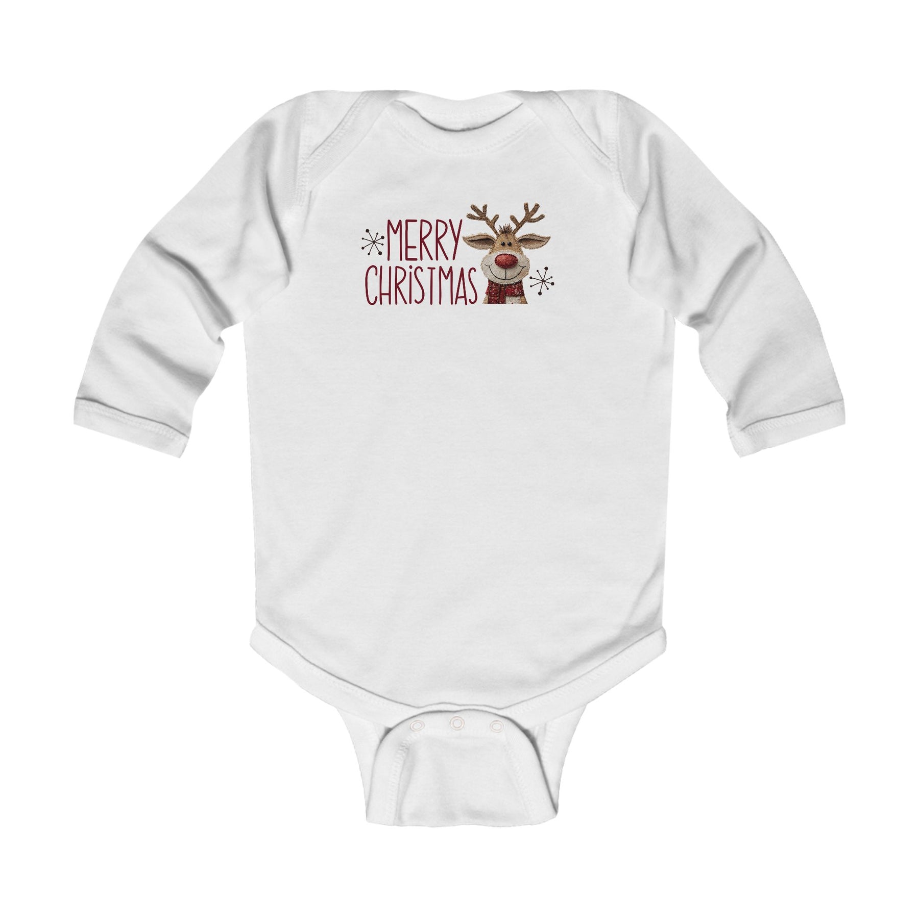 Merry Christmas Reindeer Onesie: A white long-sleeved baby bodysuit featuring a festive red text and reindeer design, with snaps for easy changing and ribbed durability.