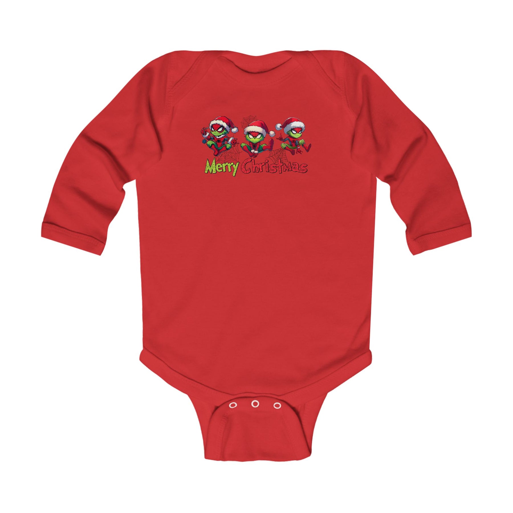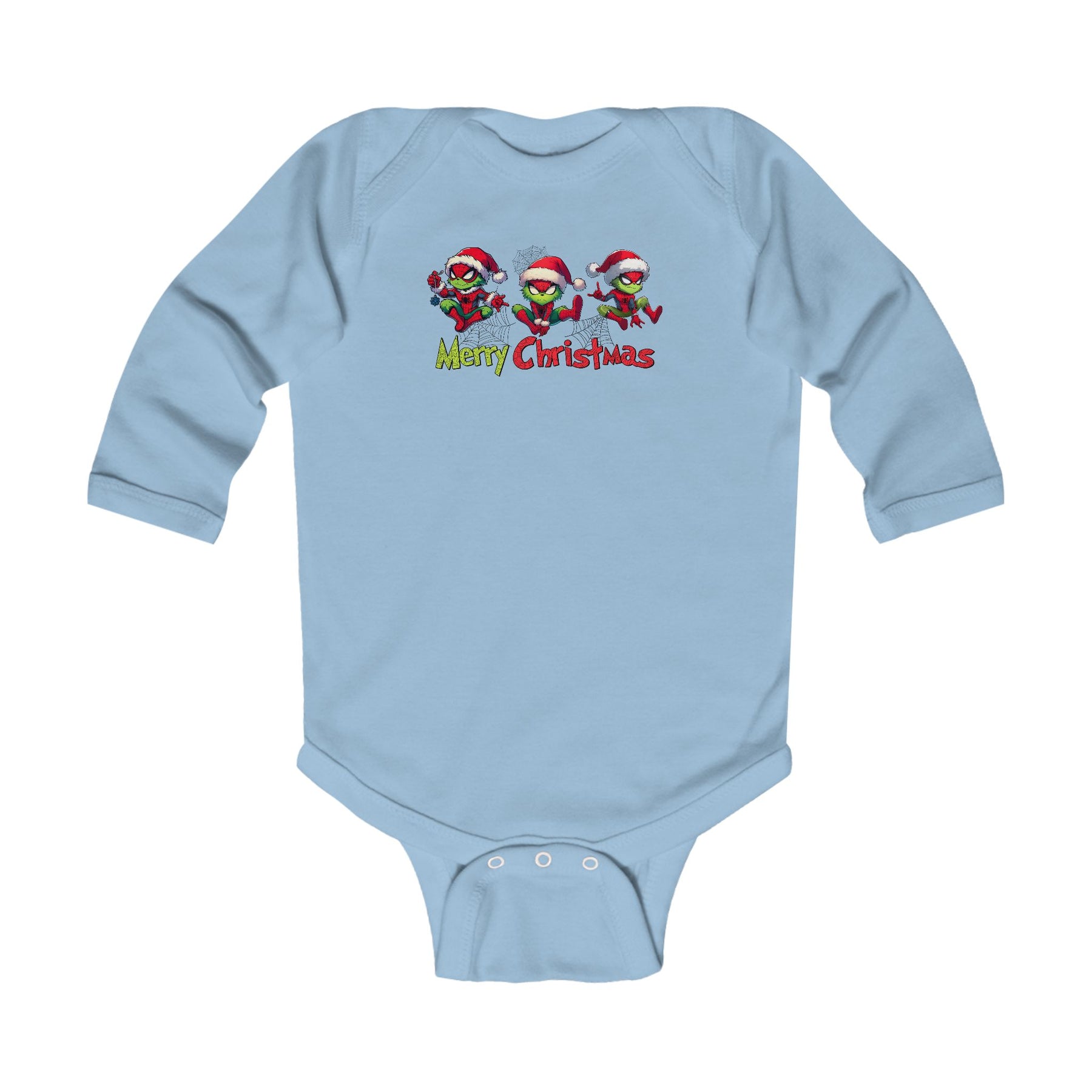 Spider Onesie: Red long-sleeved baby bodysuit with festive Grinch-style characters and Merry Christmas text, featuring snap closures for easy changing.