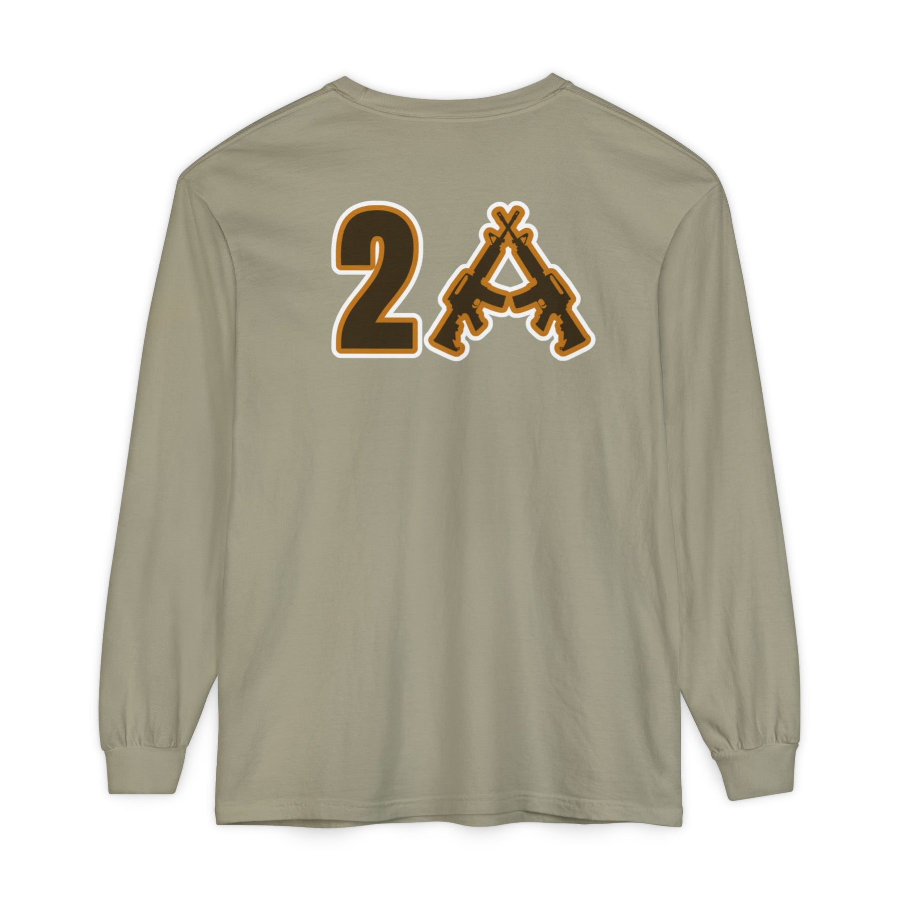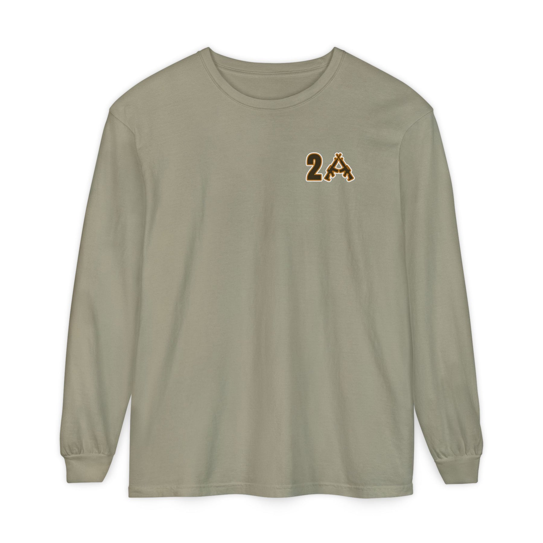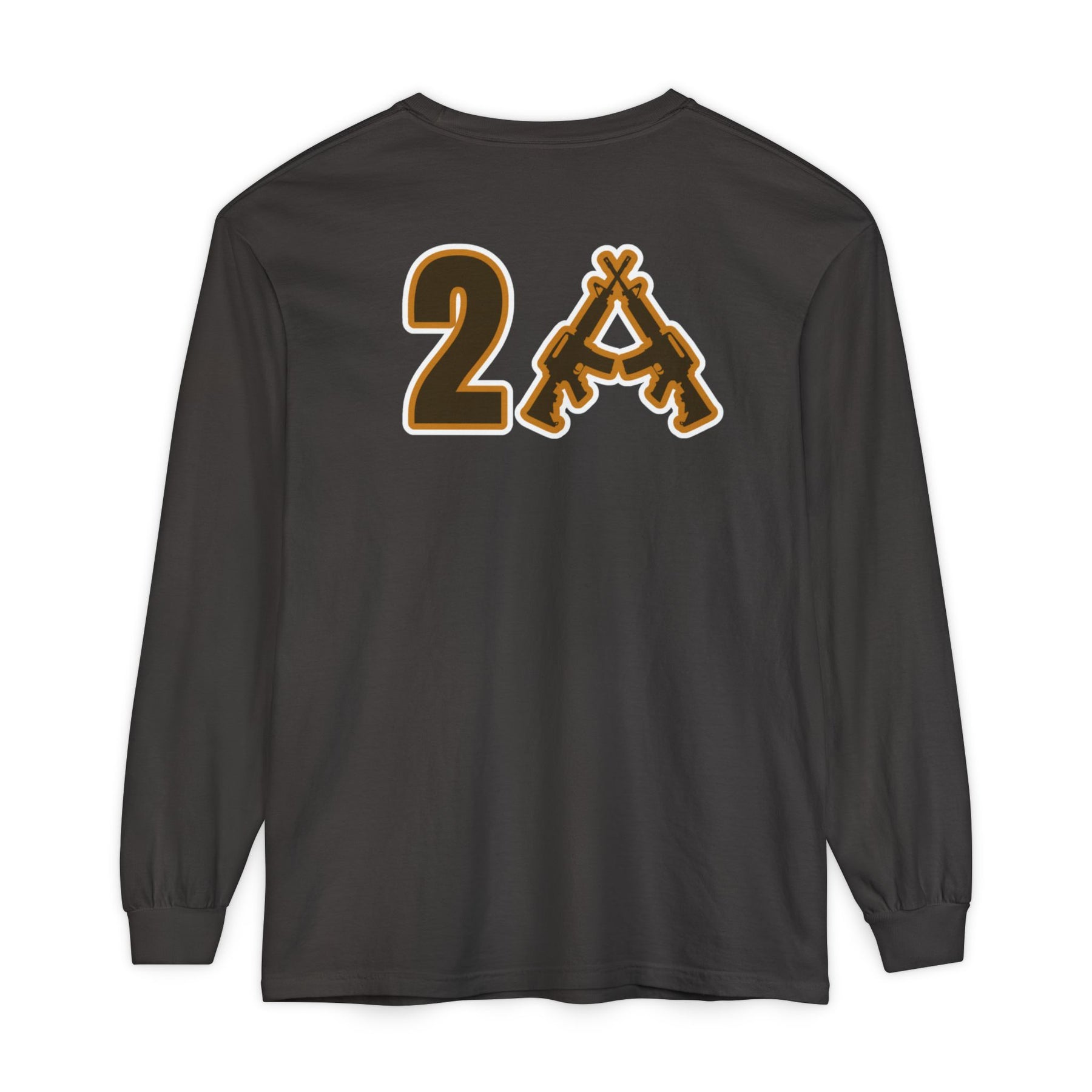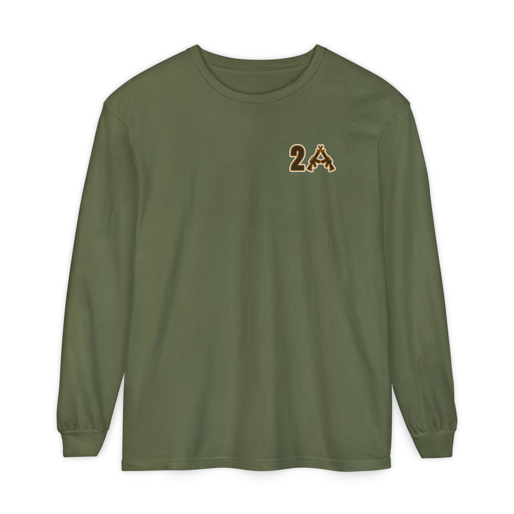 2A Long Sleeve Tee featuring a small chest logo of a block-style 2 and rifles forming A, symbolizing the Second Amendment, in soft ring-spun cotton.