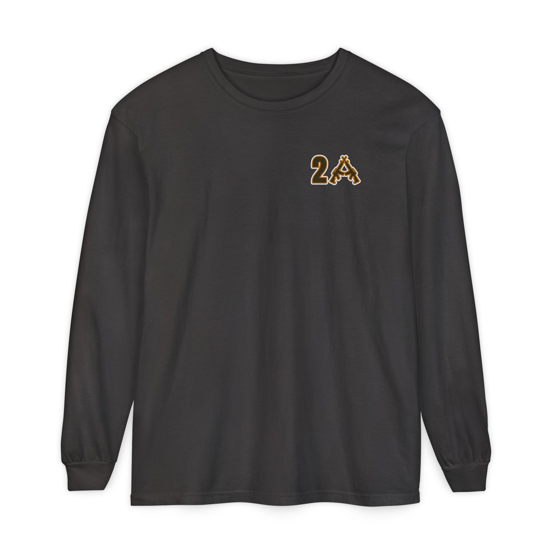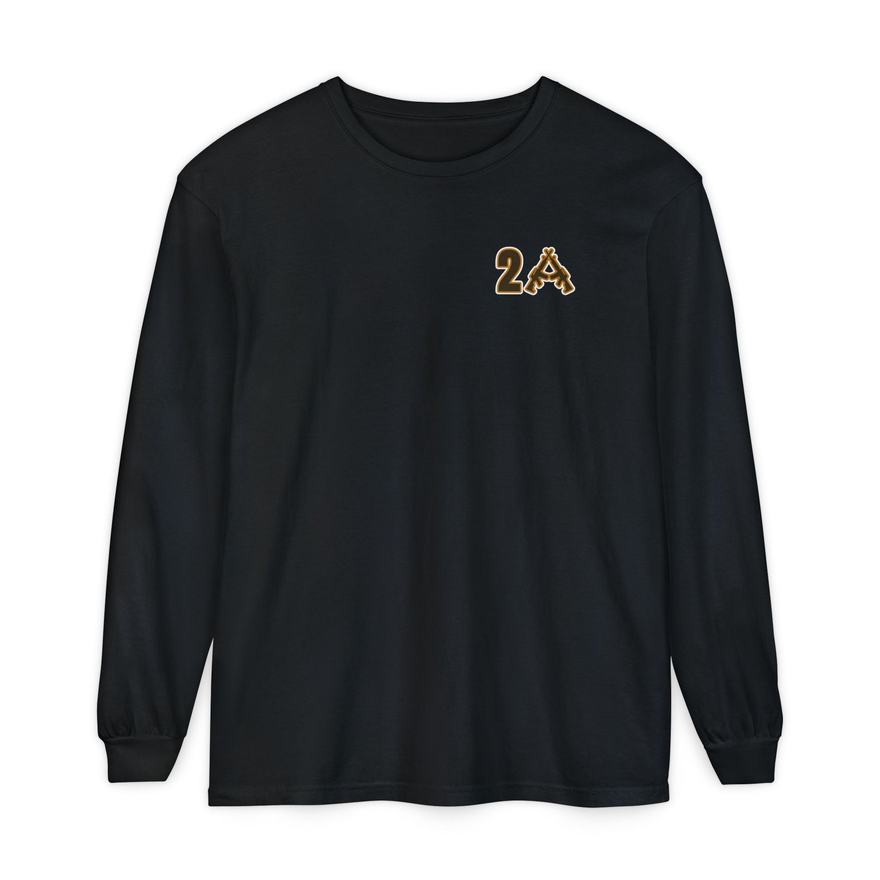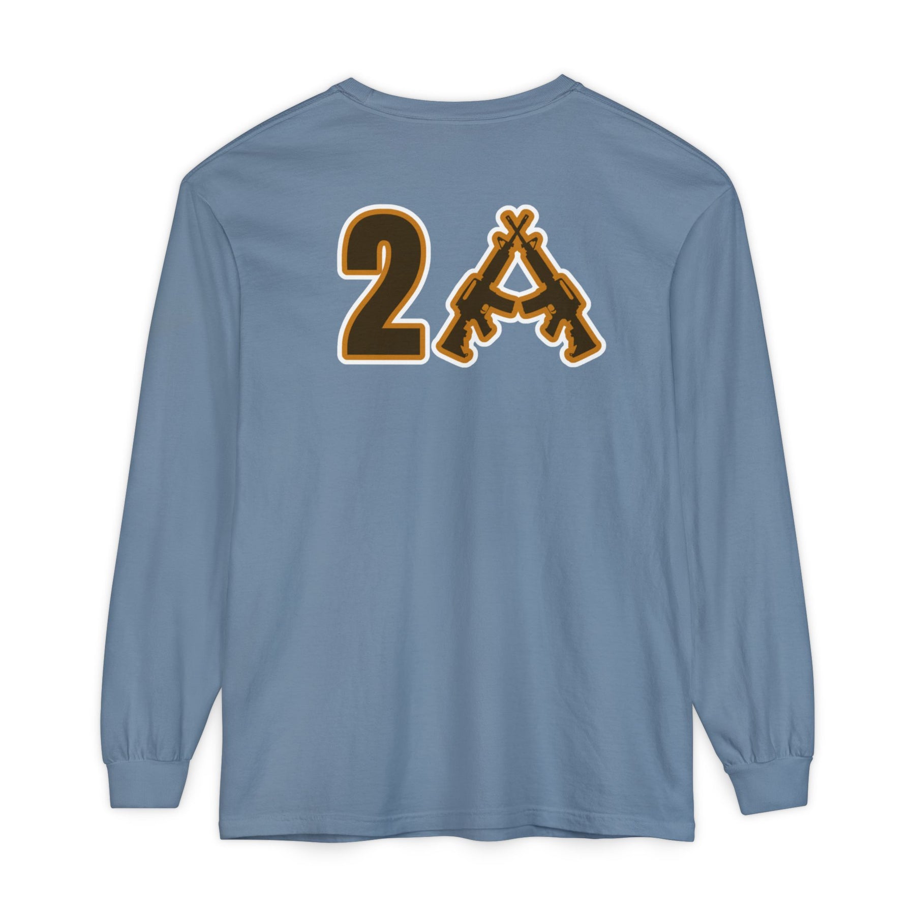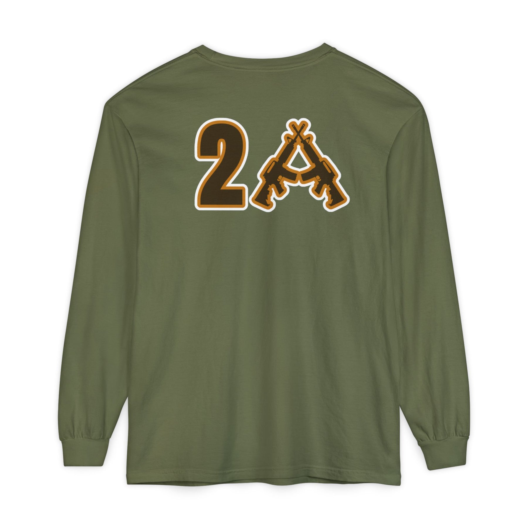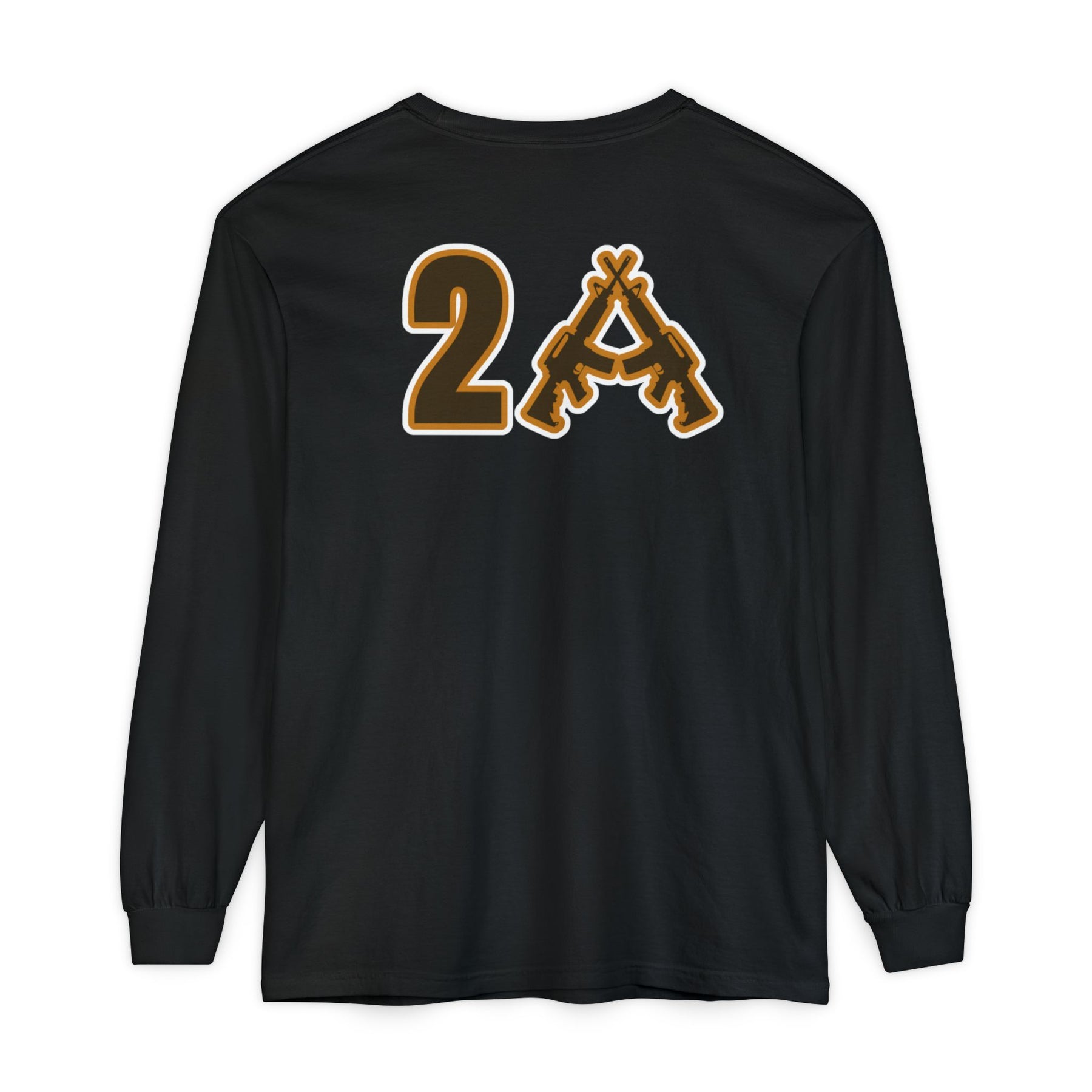 2A Long Sleeve Tee featuring a small chest logo of a block-style 2 and rifles forming A, symbolizing the Second Amendment, in soft ring-spun cotton.