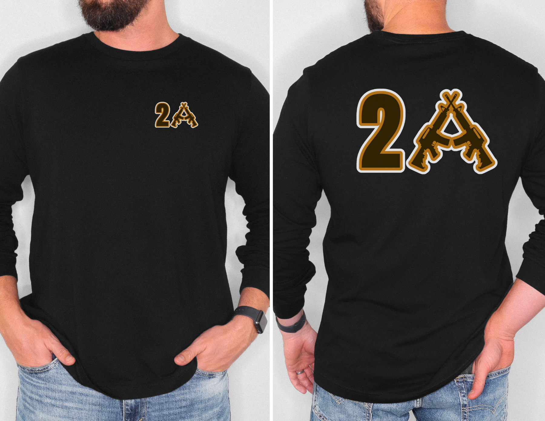 Back view of 2A Long Sleeve Tee featuring a stylized 2A graphic with bold font and crossed handguns, made of soft, 100% ring-spun cotton.
