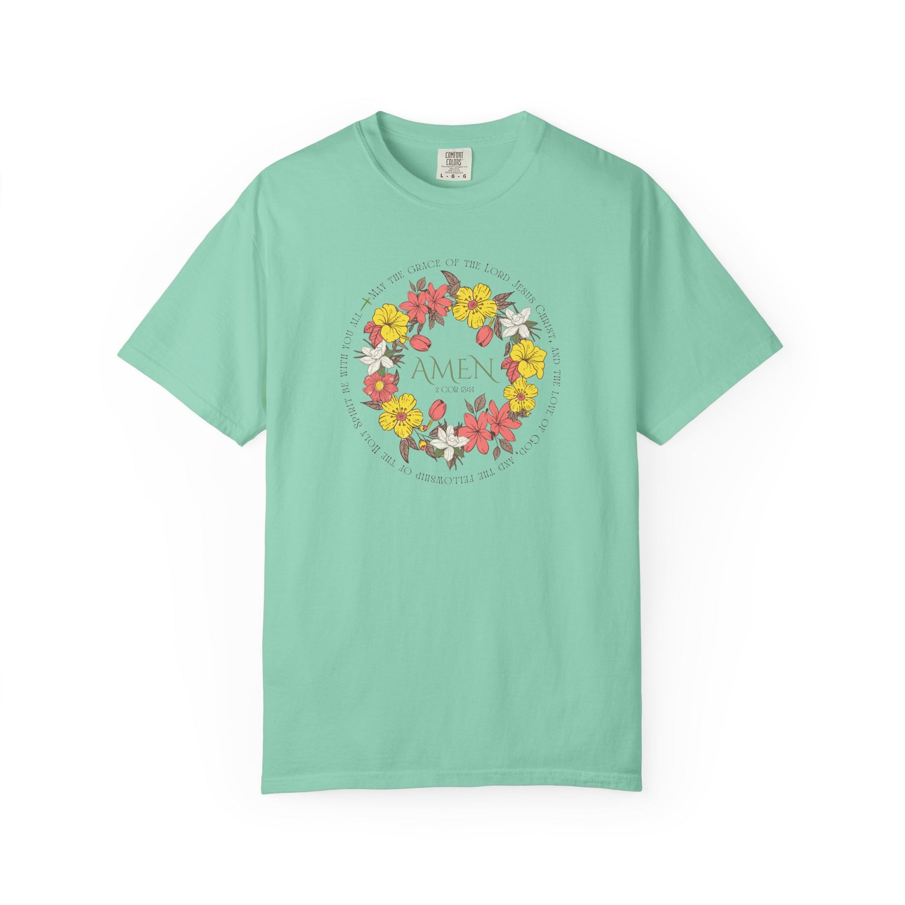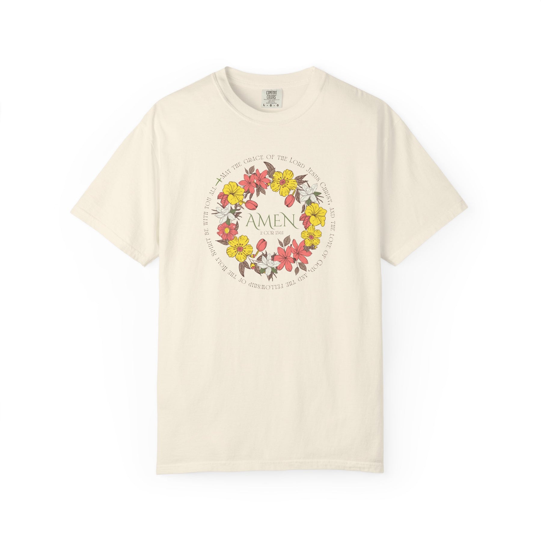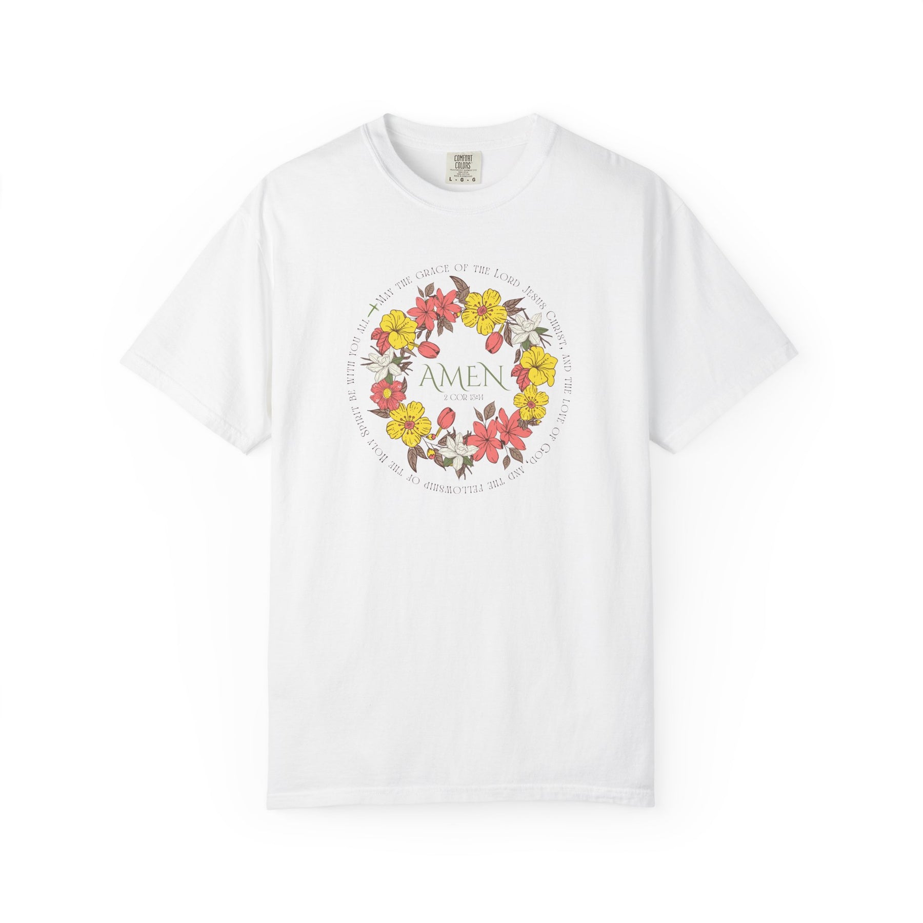 Amen Tee featuring a floral design on a durable, soft-washed fabric, ideal for everyday wear with its relaxed fit and customizable options.