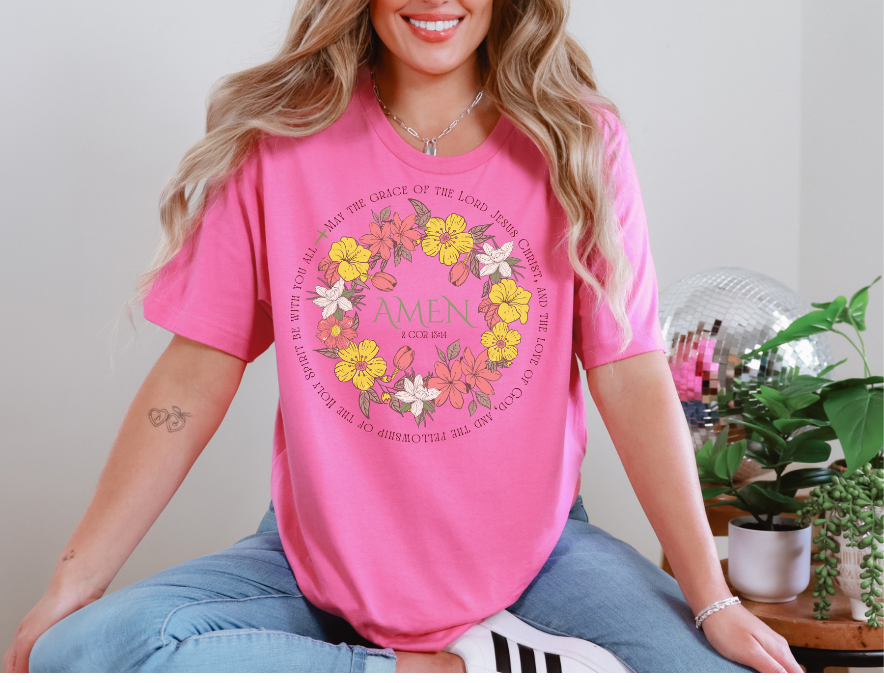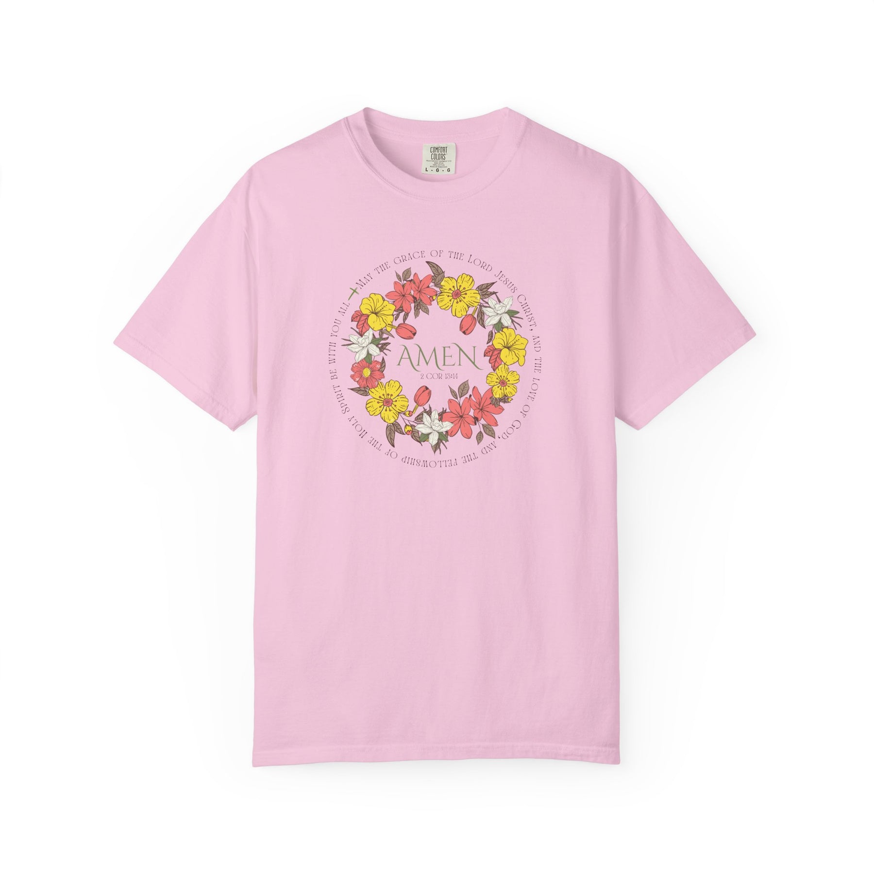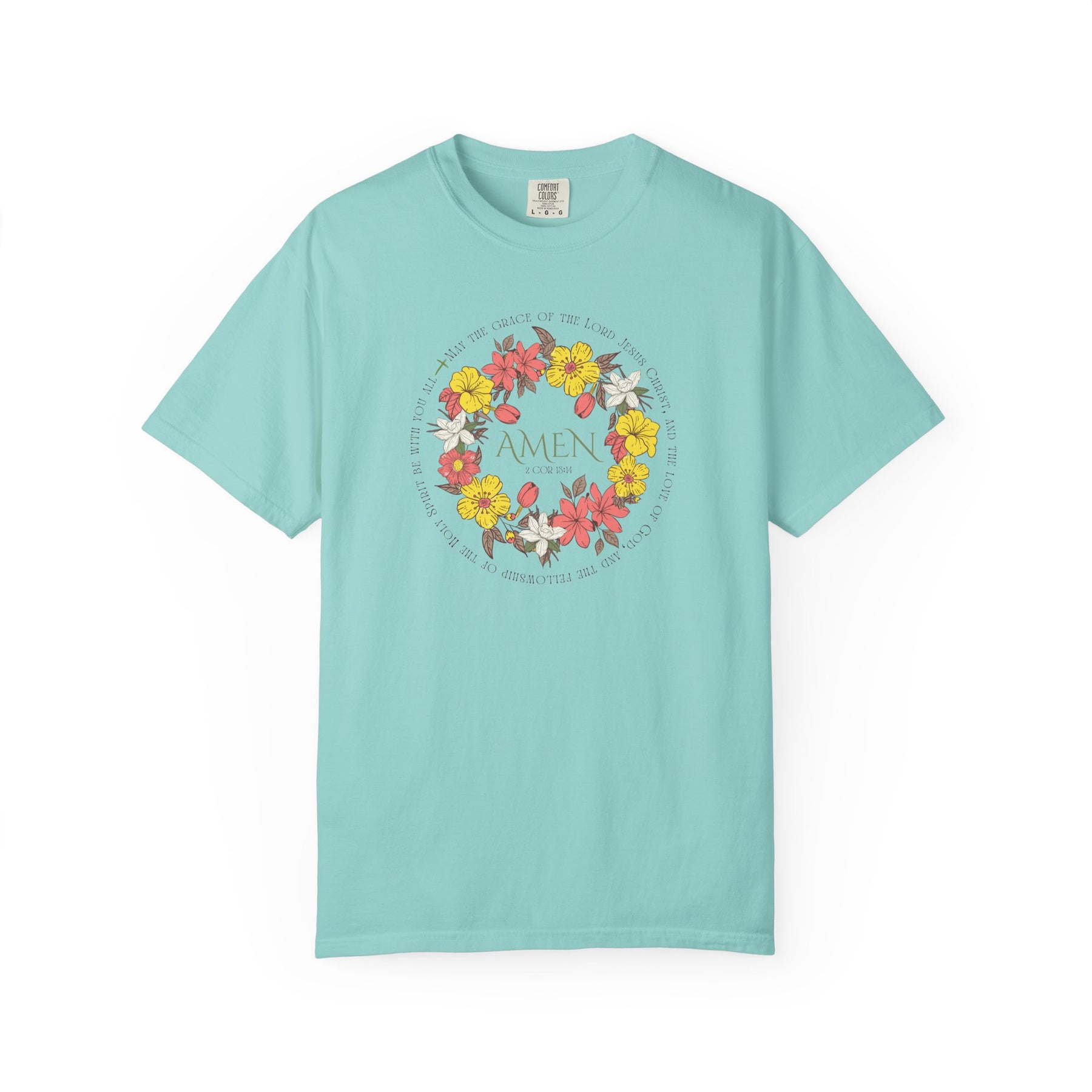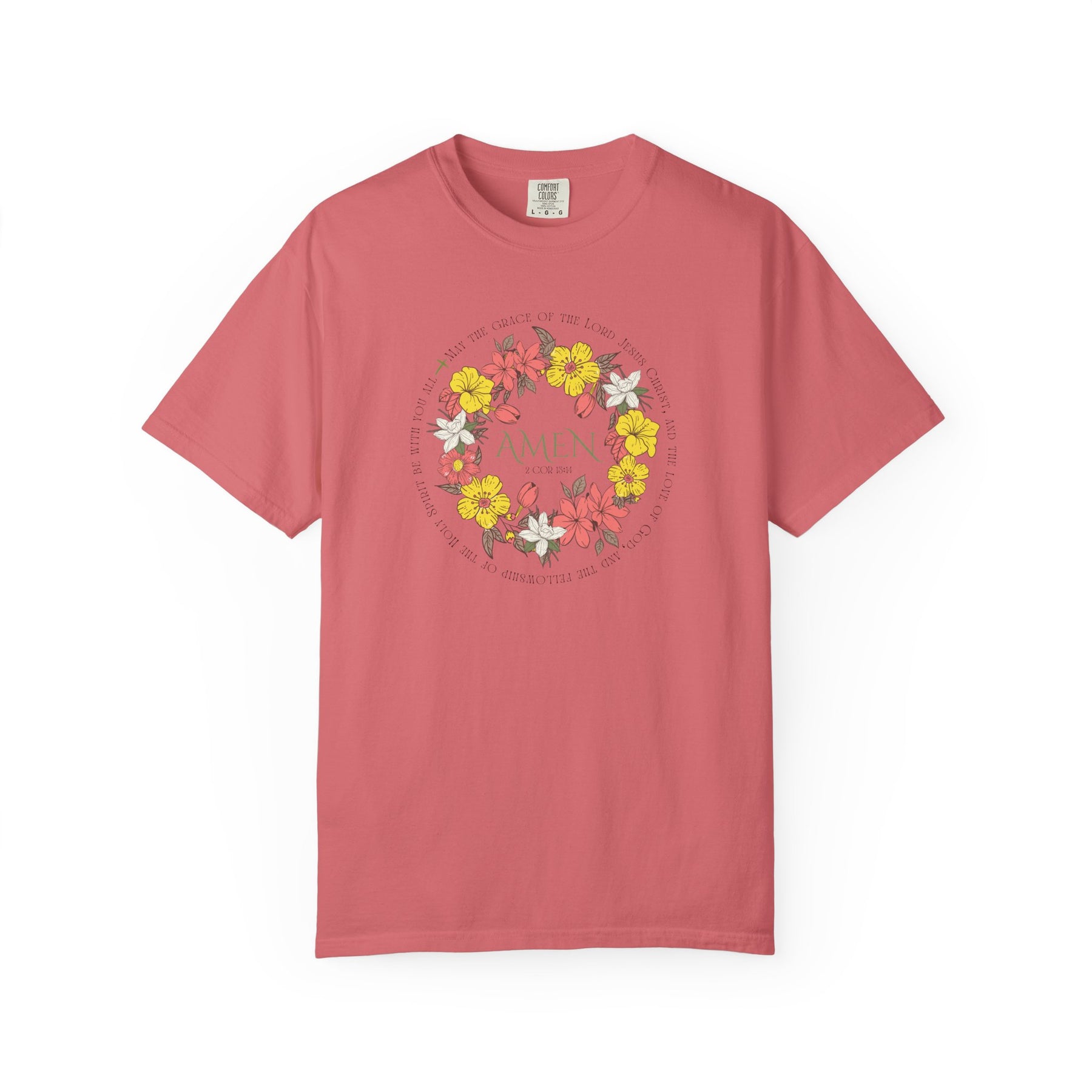 Amen Tee featuring a floral design on a durable, soft-washed fabric, ideal for everyday wear with its relaxed fit and customizable options.