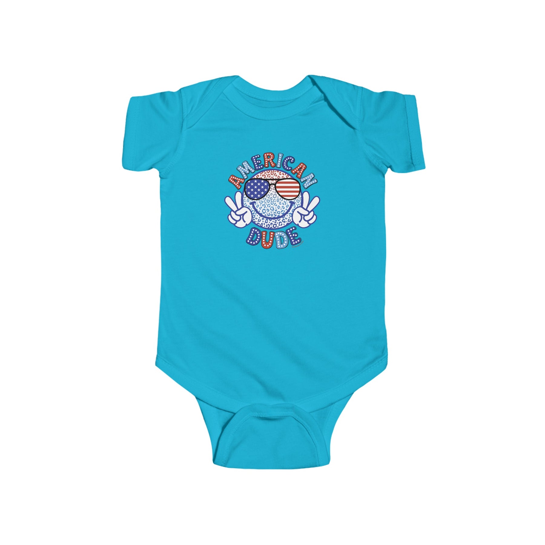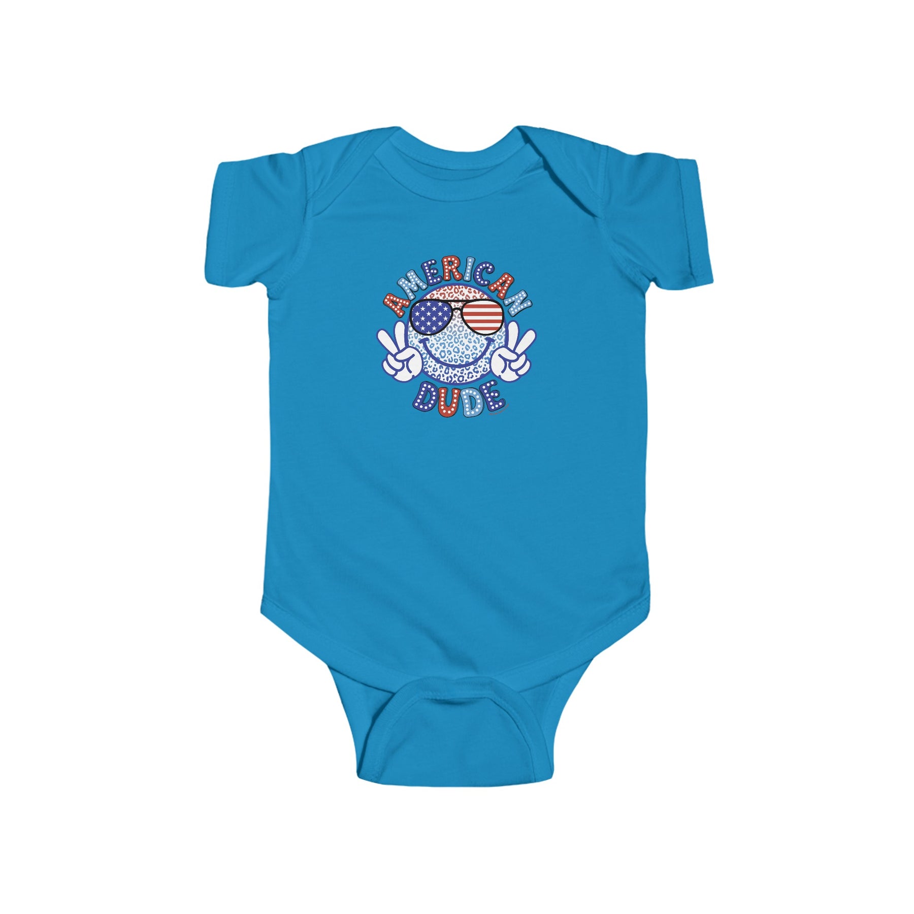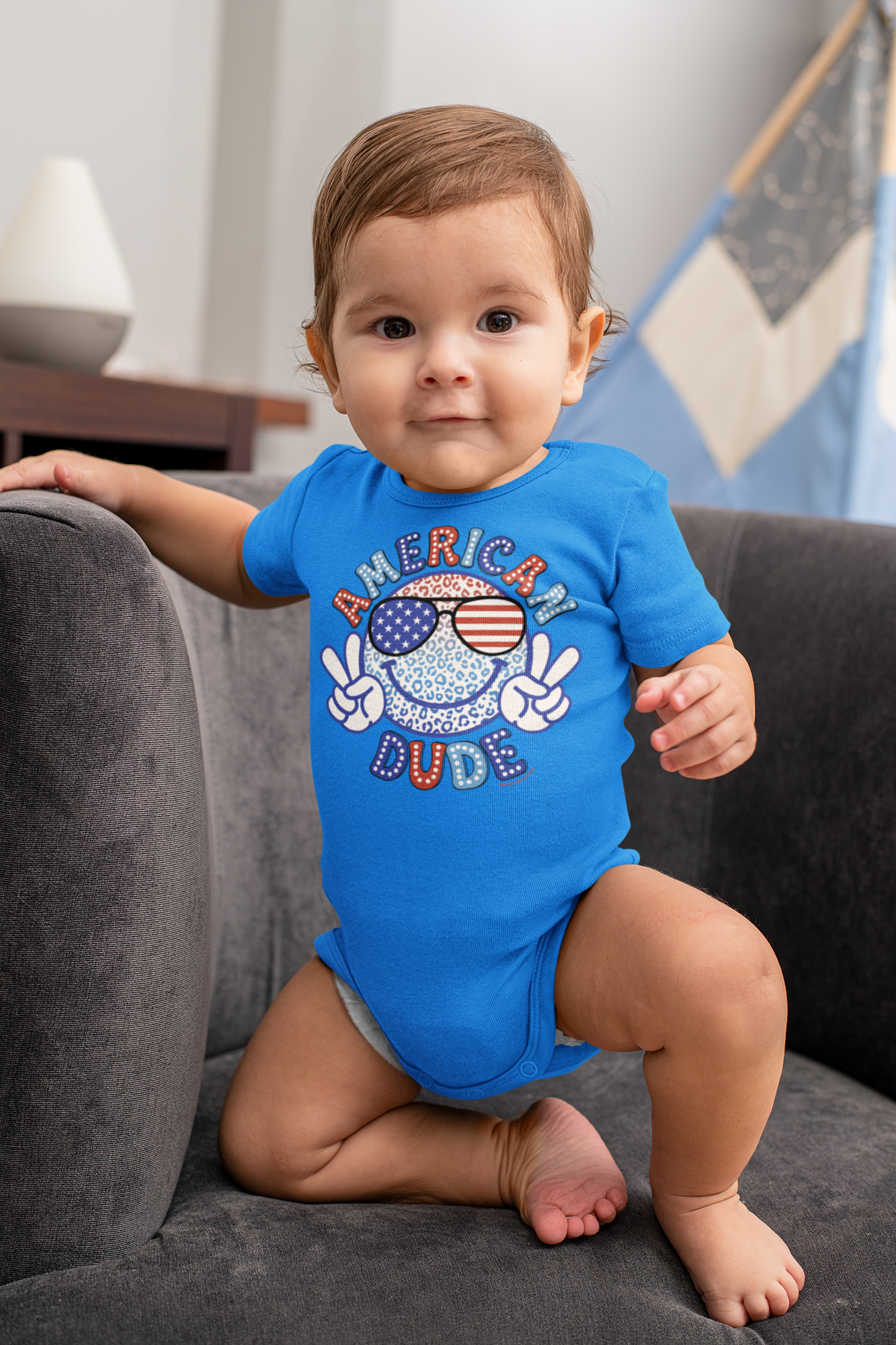 An American Dude Onesie for infants, featuring a blue shirt with a cartoon face and sunglasses. Made of 100% cotton, with ribbed bindings and plastic snaps for easy changing. Ideal for toddlers.