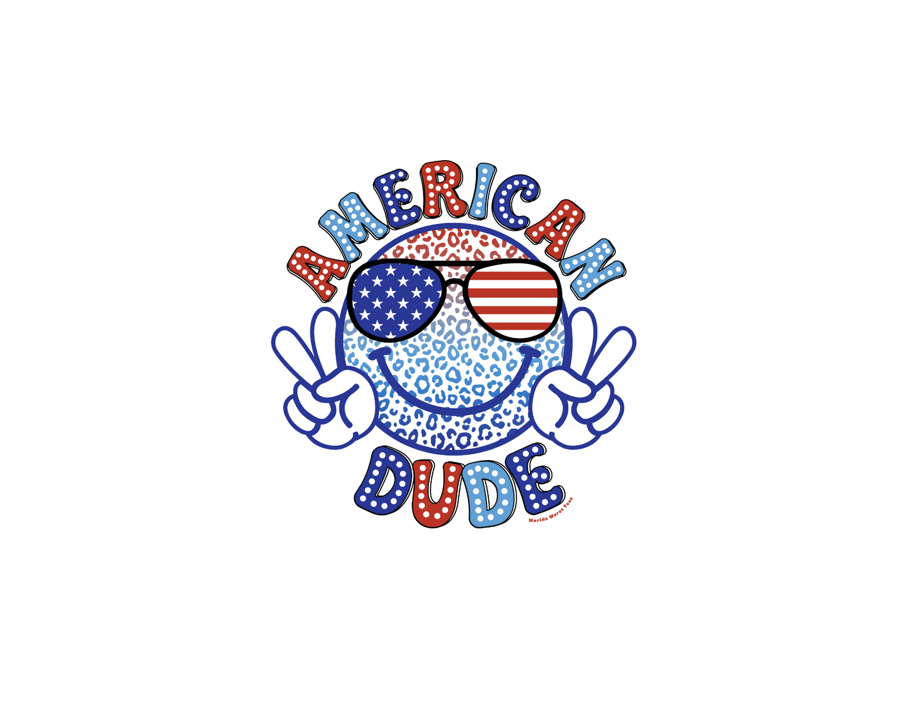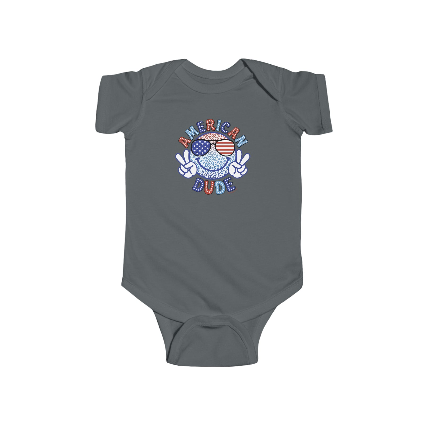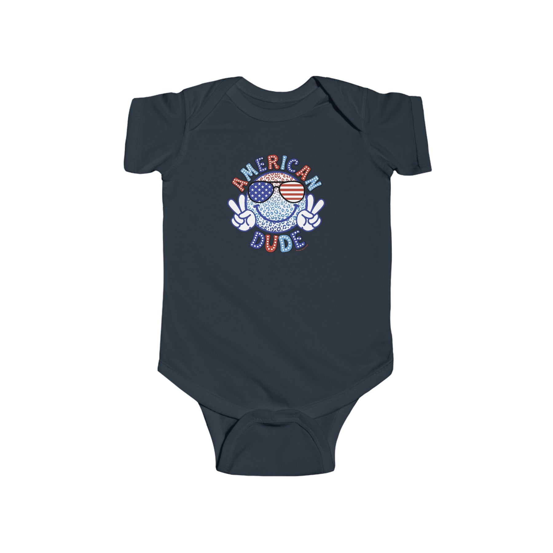 A playful American Dude Onesie featuring a logo with a face and sunglasses, perfect for infants. Made of 100% cotton, with ribbed knitting for durability and plastic snaps for easy changing access.