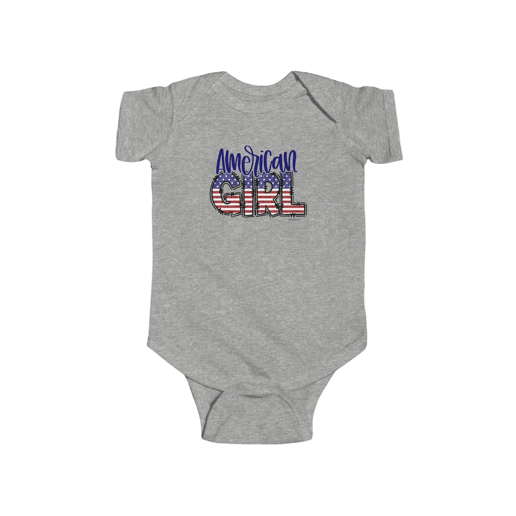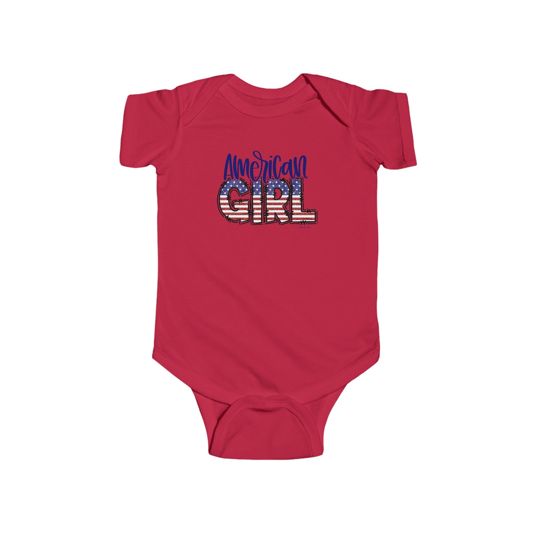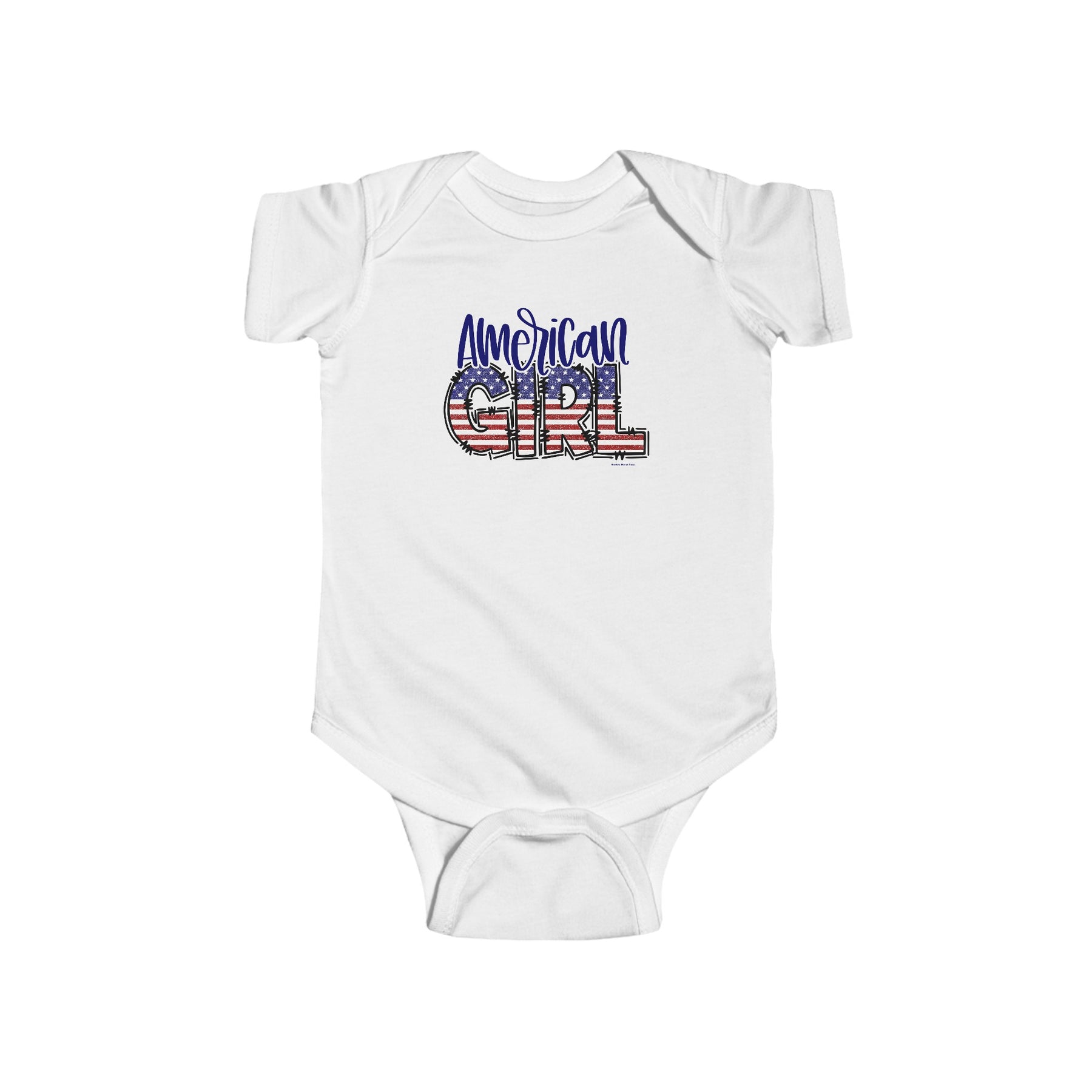 American Girl Onesie featuring patriotic red, white, and blue graphics with stars and stripes. Infant fine jersey bodysuit made of 100% cotton, with ribbed knit bindings and plastic snaps for easy changing access.