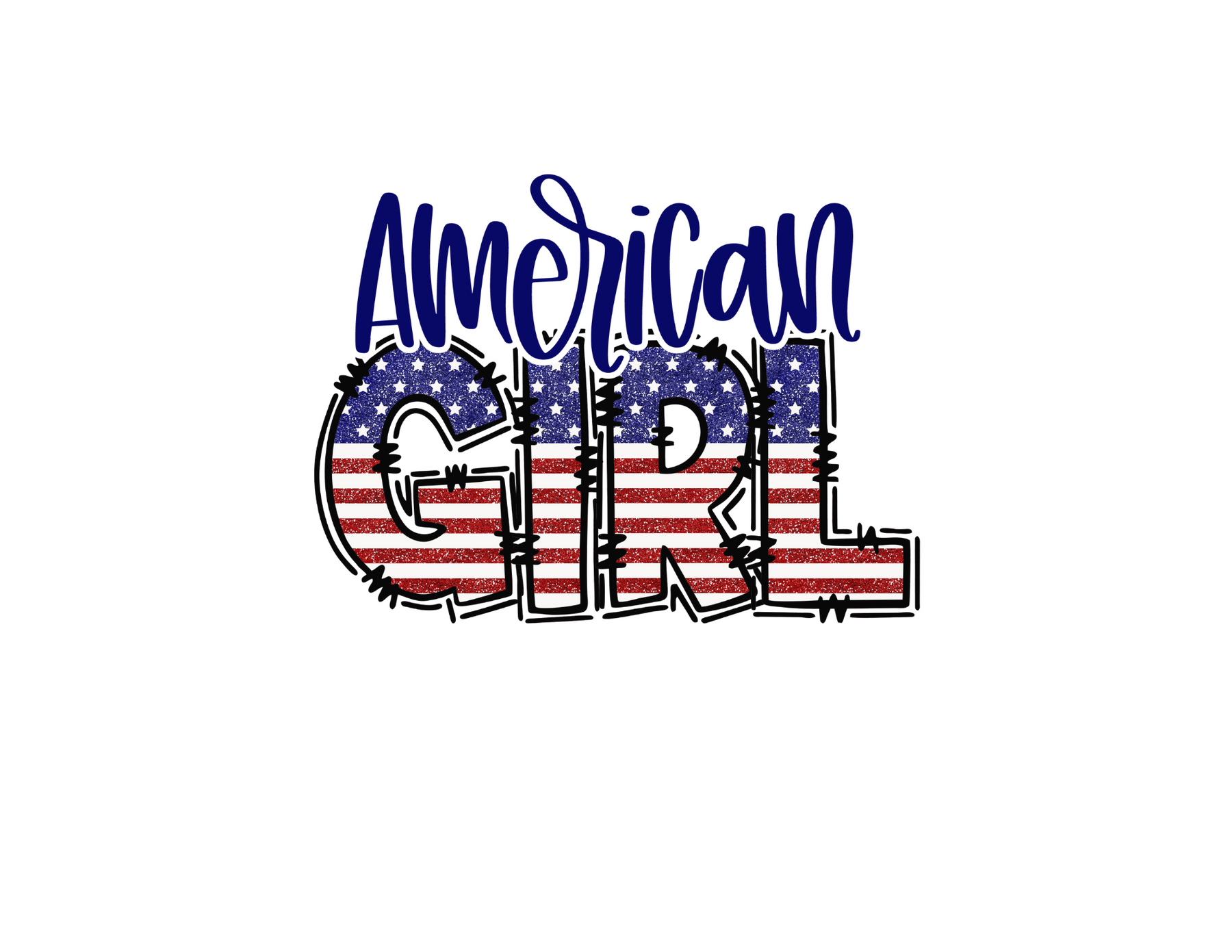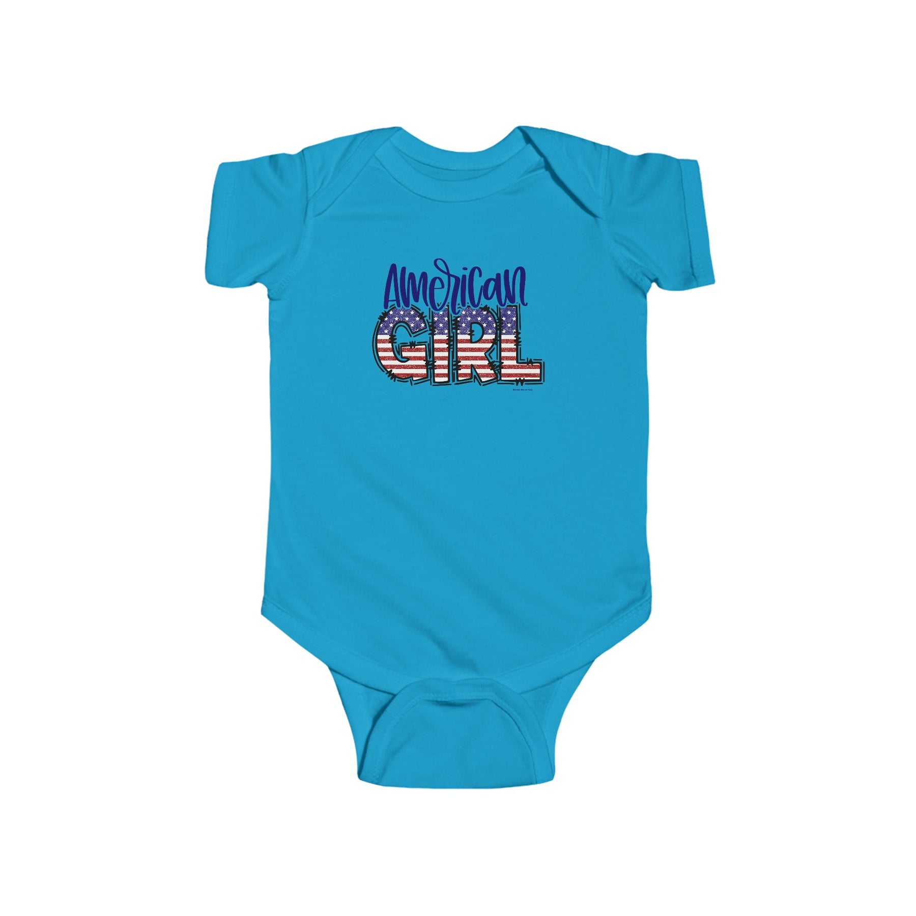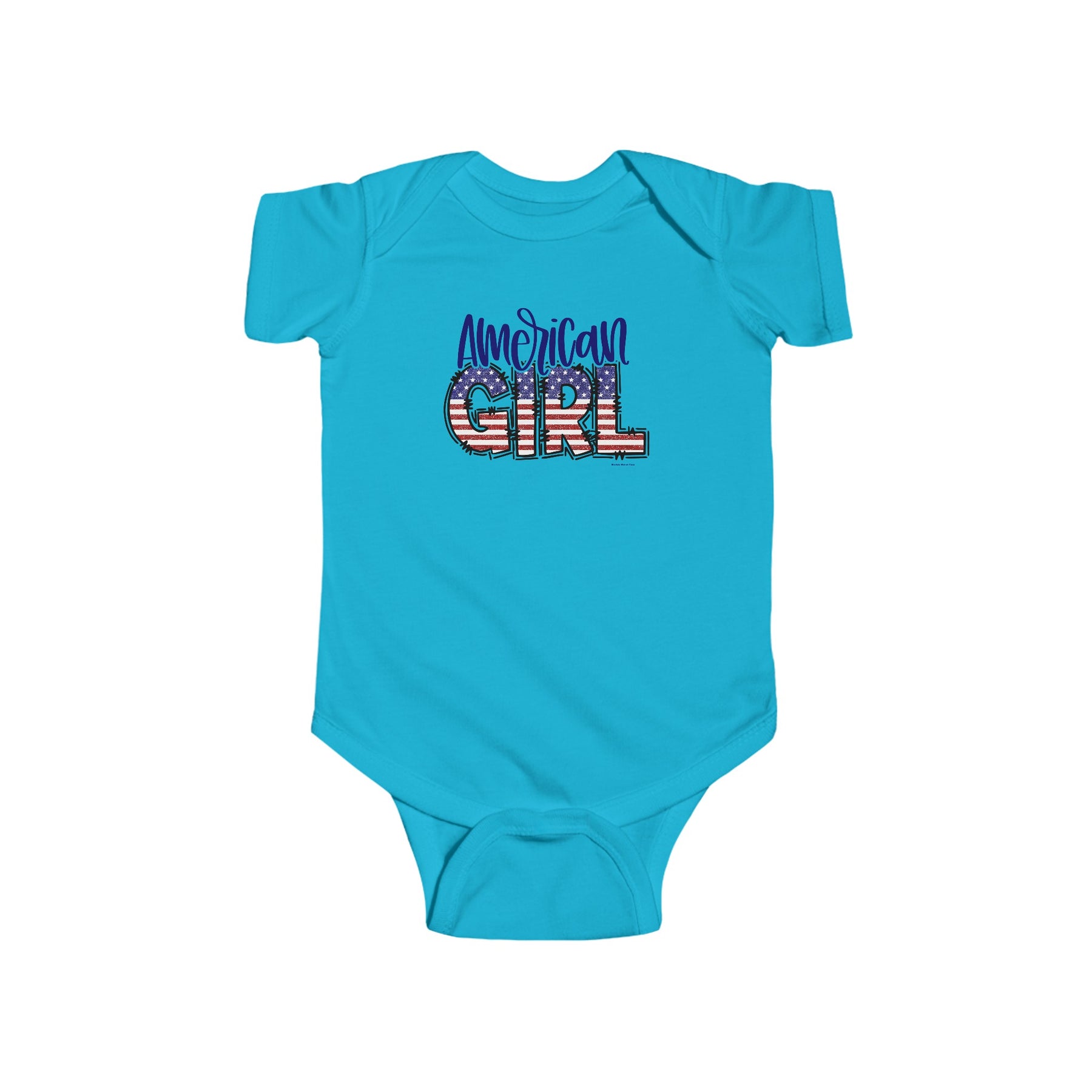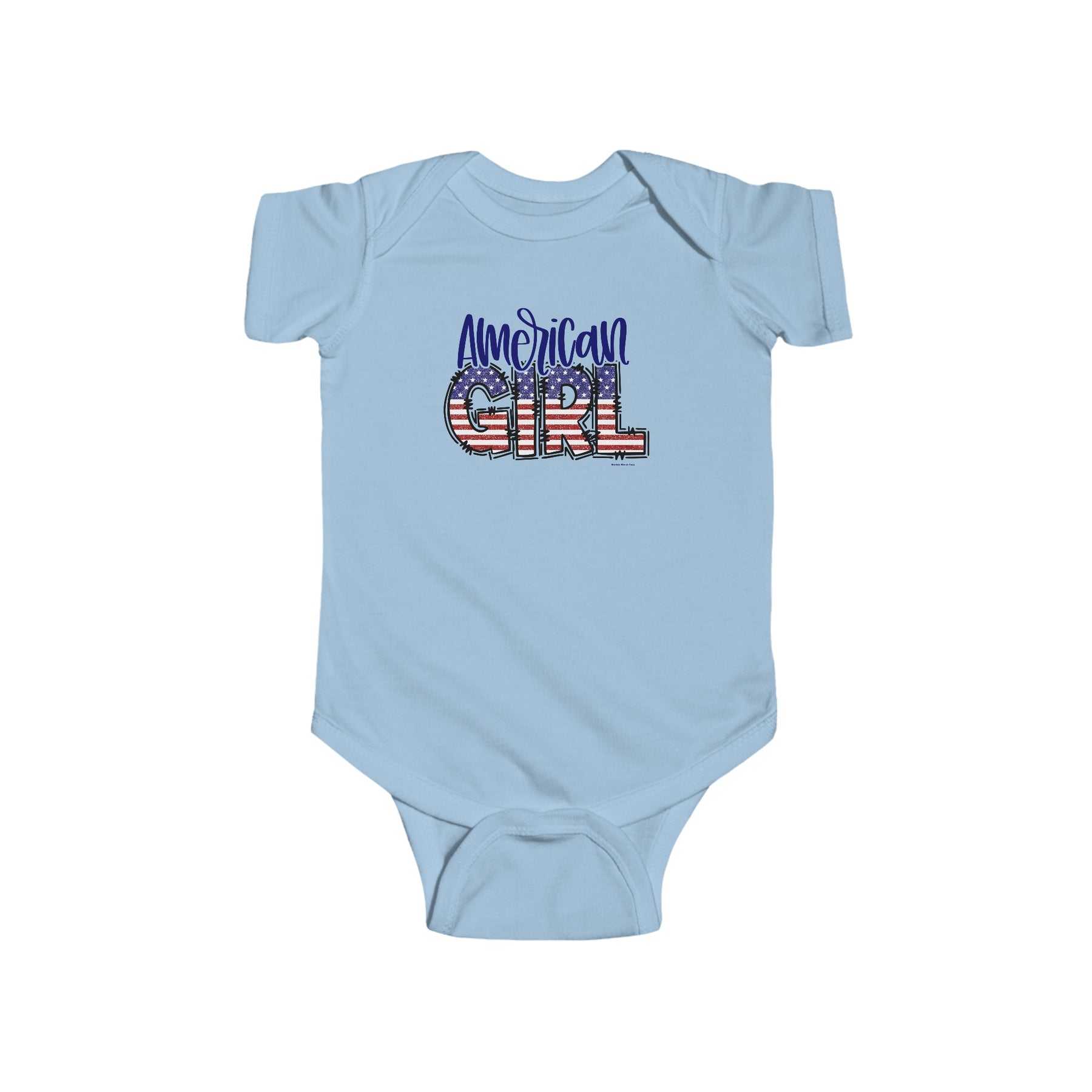 American Girl Onesie featuring patriotic red, white, and blue graphics with stars and stripes. Infant fine jersey bodysuit made of 100% cotton, with ribbed knit bindings and plastic snaps for easy changing access.