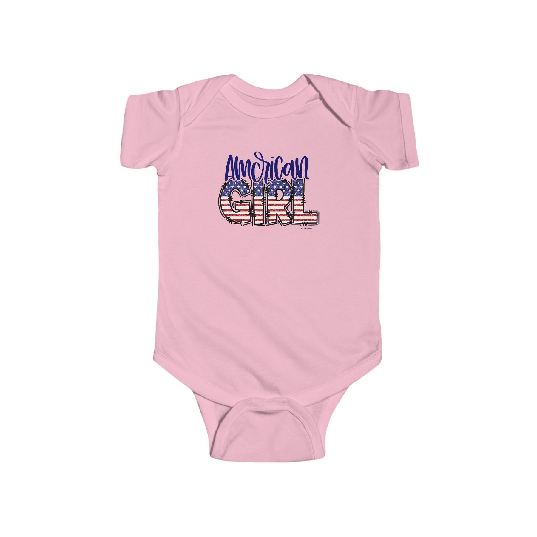 American Girl Onesie infant fine jersey bodysuit with logo, soft 100% cotton fabric, ribbed knitting for durability, plastic snaps for easy changing access. From Worlds Worst Tees.