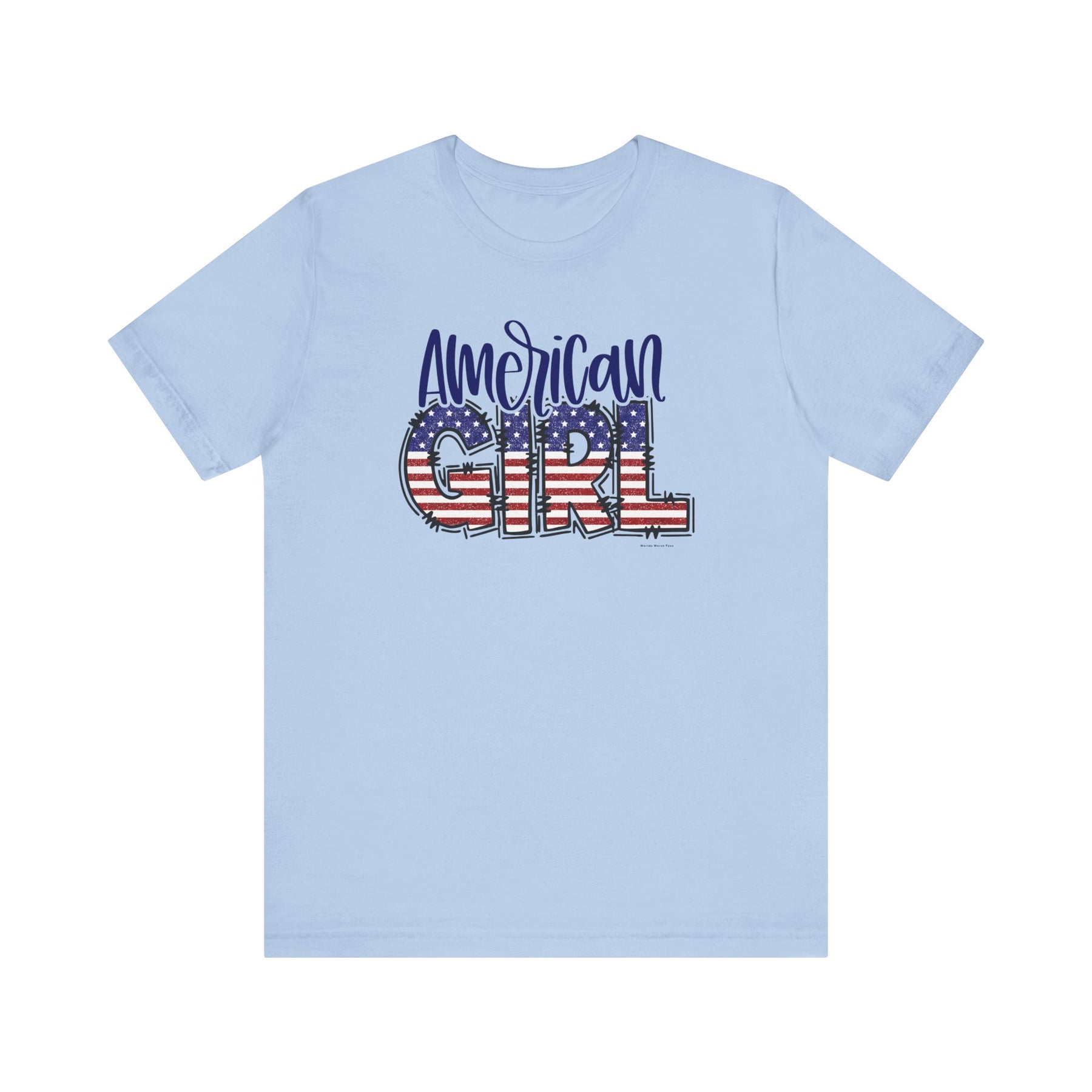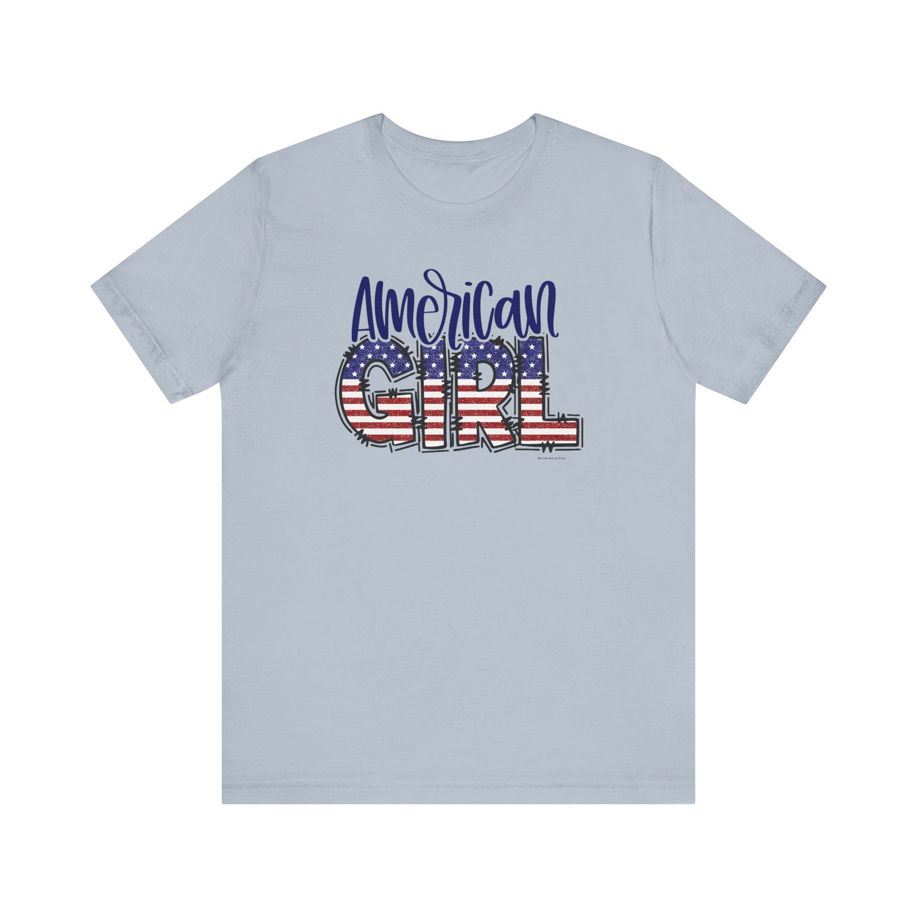 A classic American Girl Tee featuring red, white, and blue graphics with stars and stripes. Unisex jersey tee made of 100% Airlume combed cotton, light fabric, and ribbed knit collars for a retail fit.