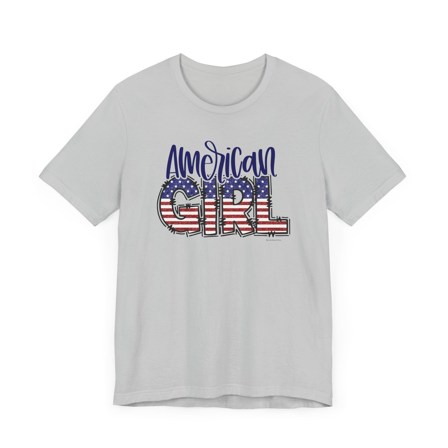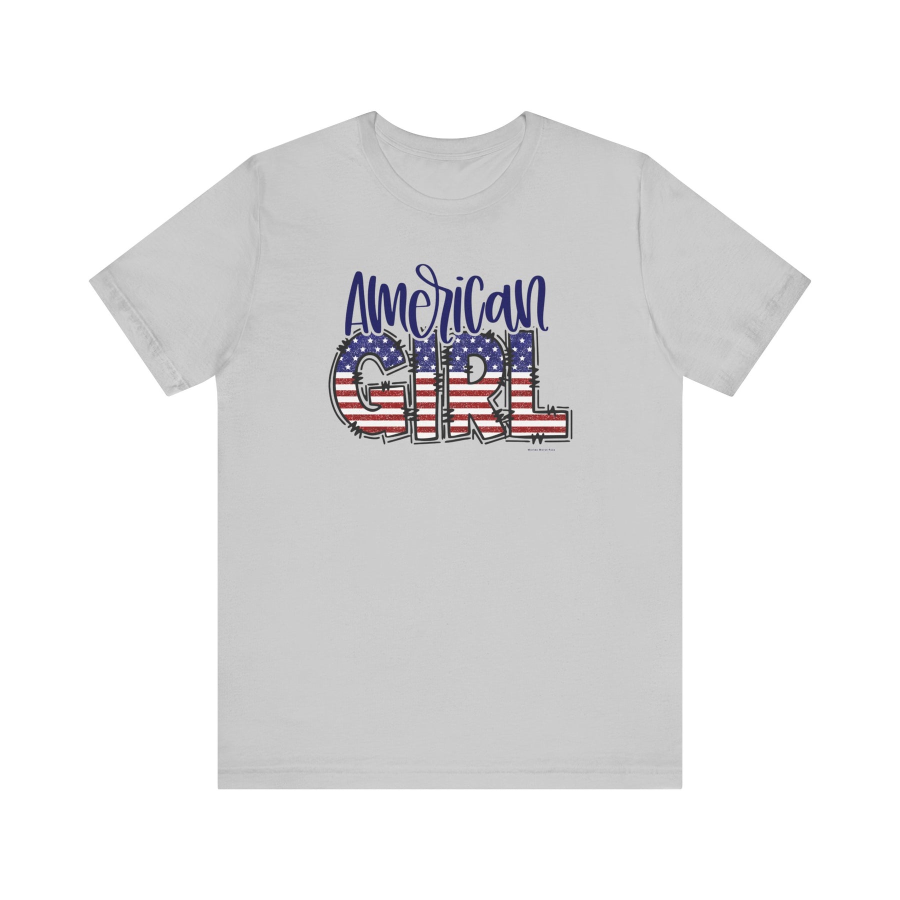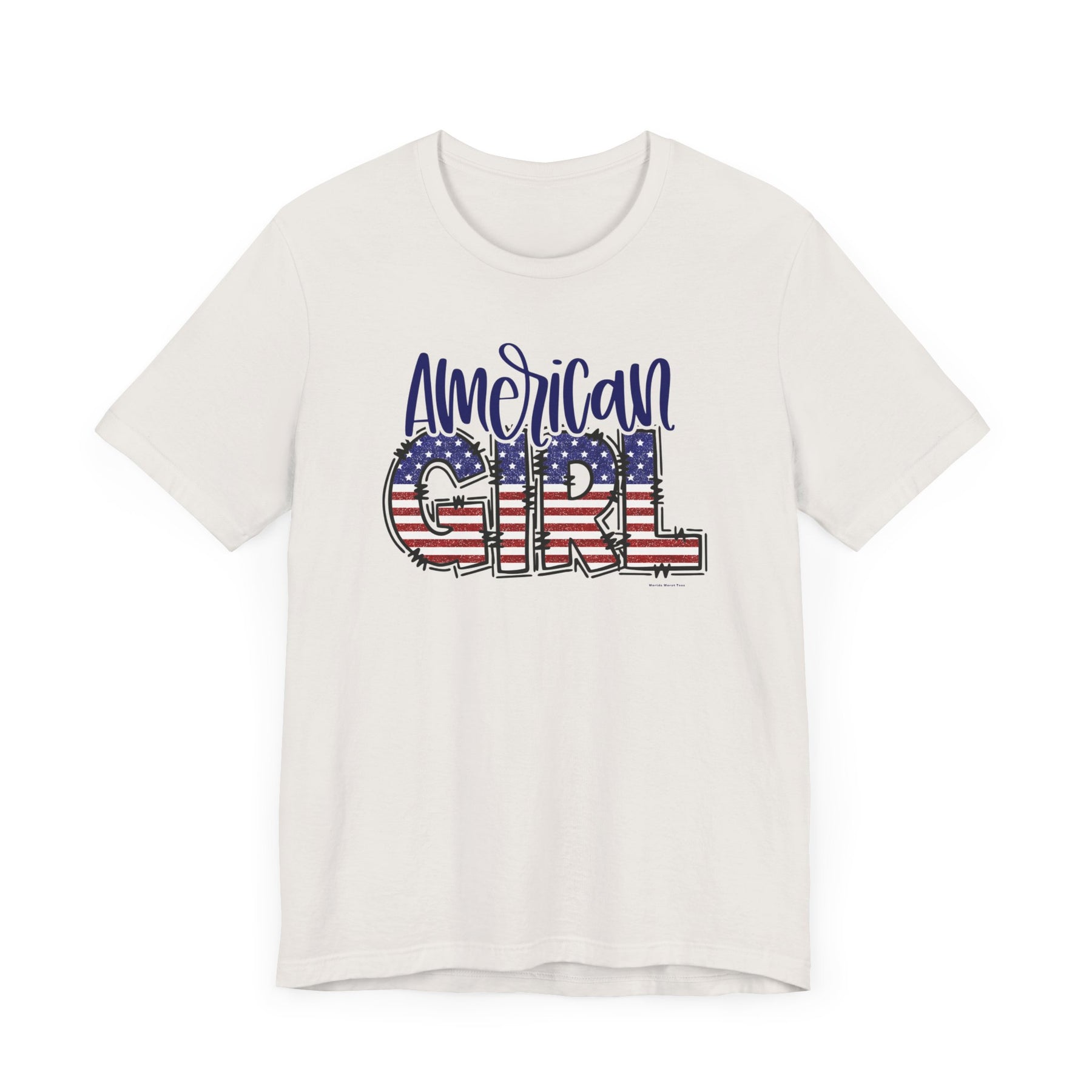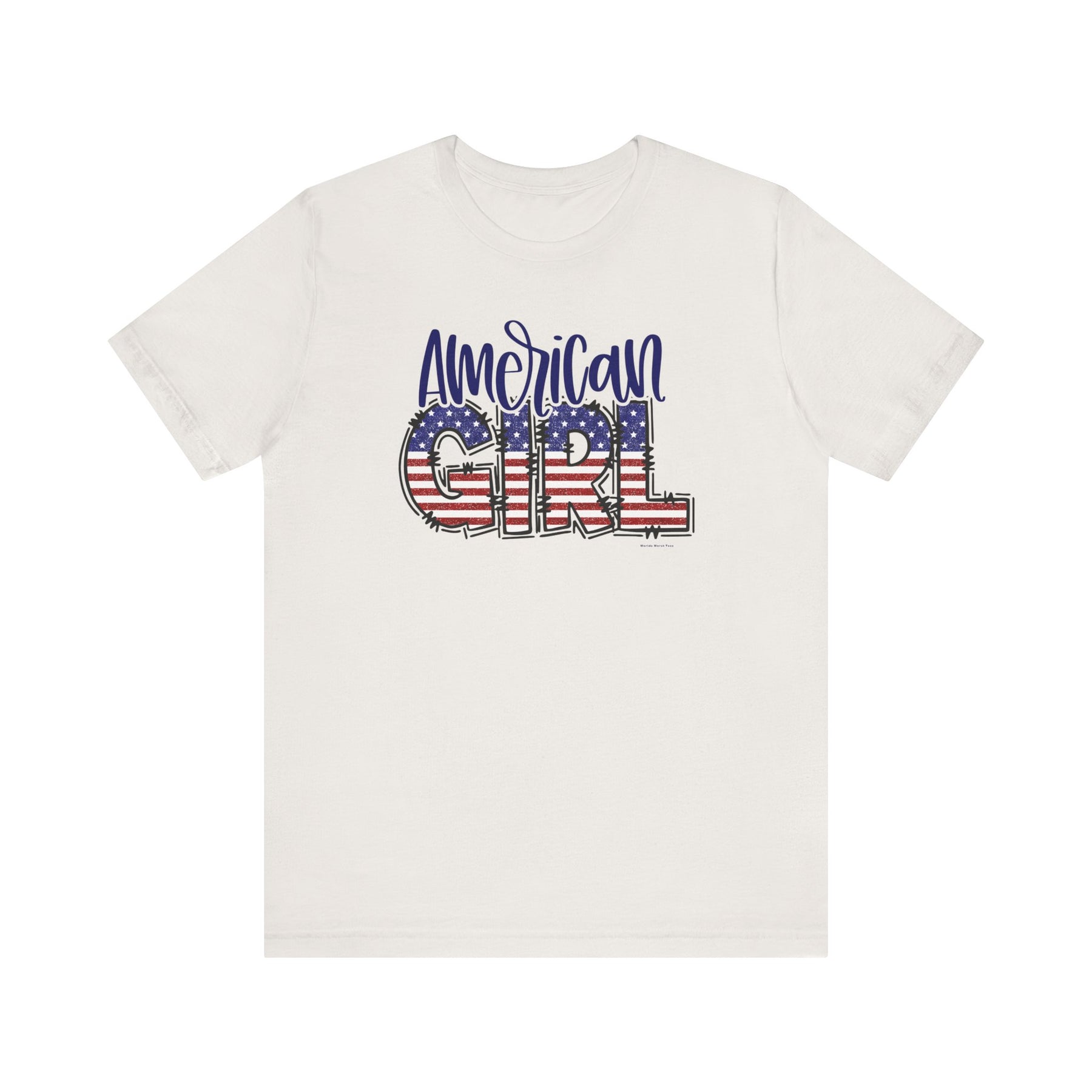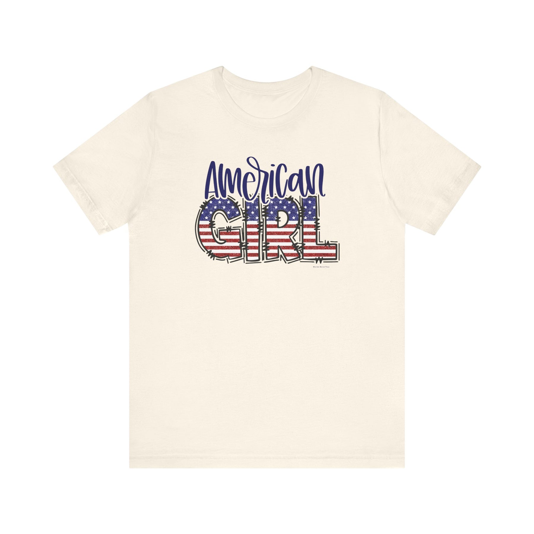 American Girl Tee: A classic white unisex jersey tee with a patriotic red, white, and blue text design. Made of soft 100% cotton, featuring ribbed knit collars, taping on shoulders, and dual side seams for durability.