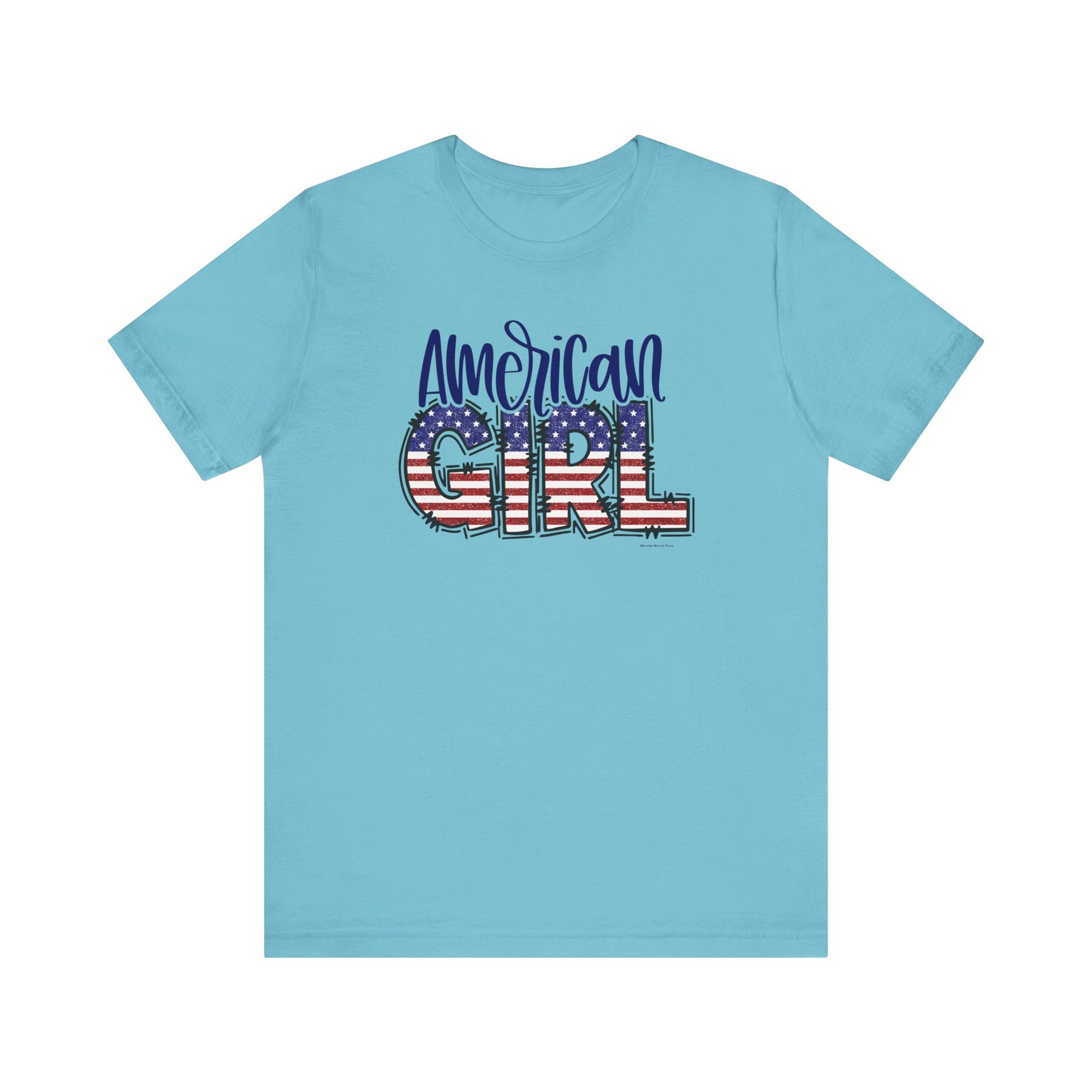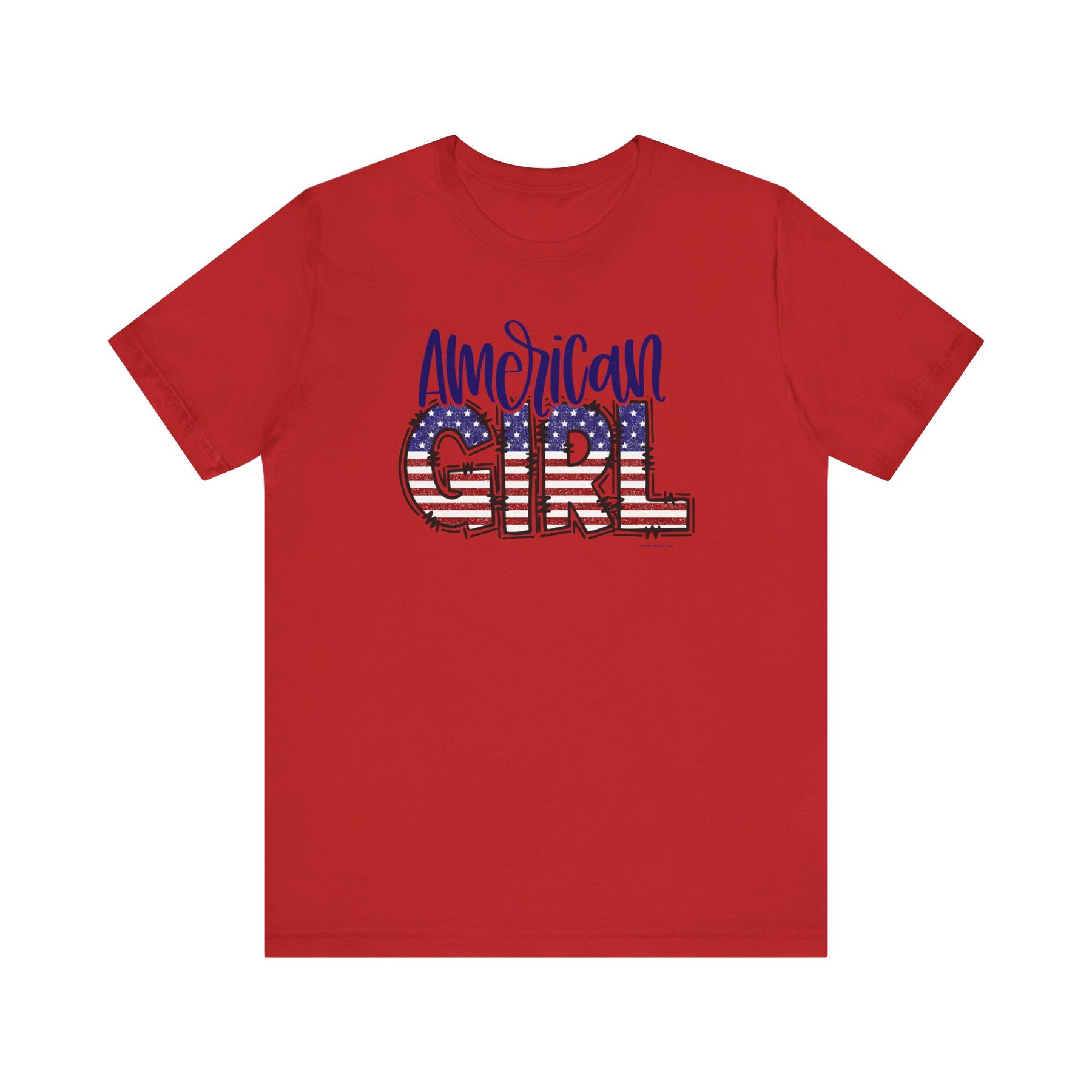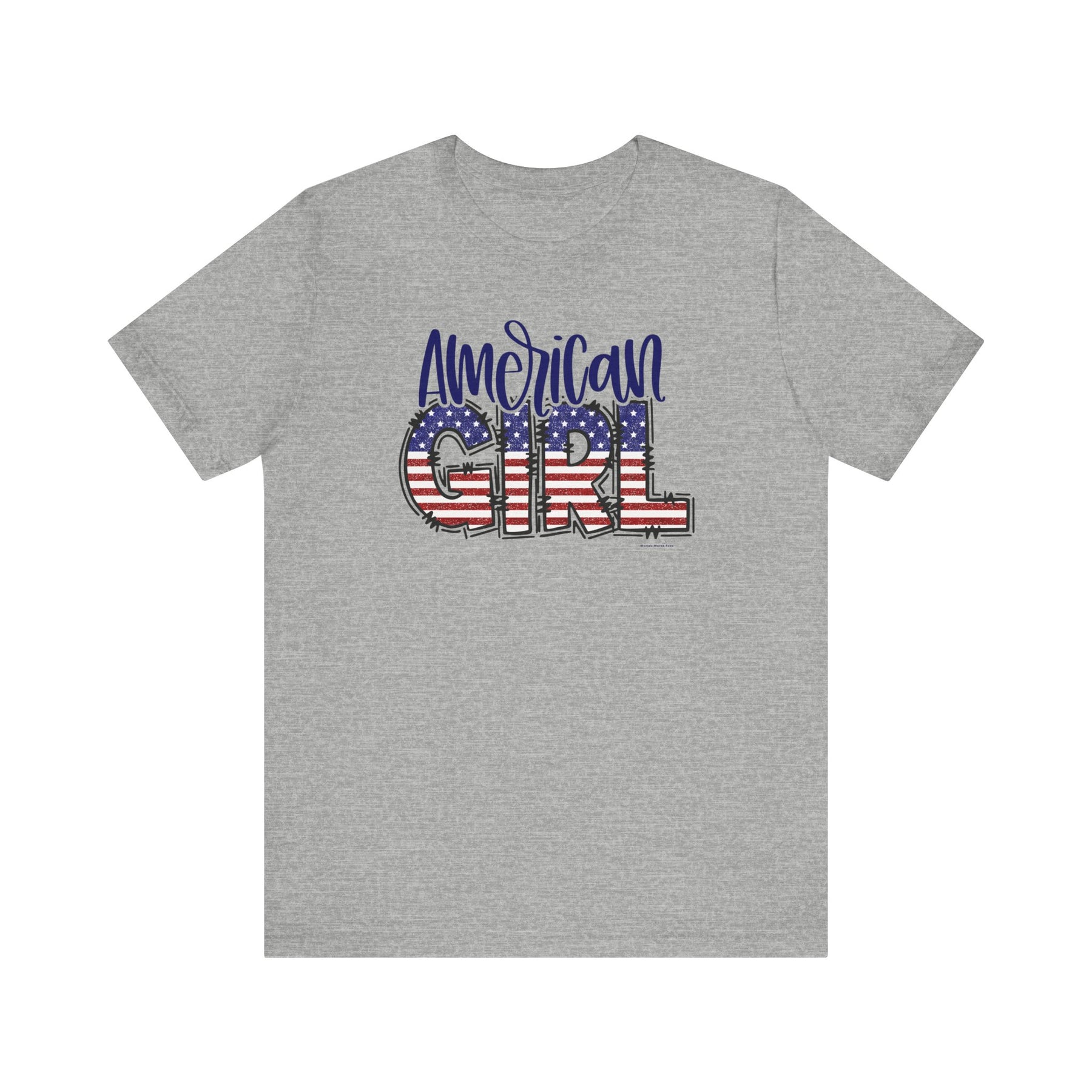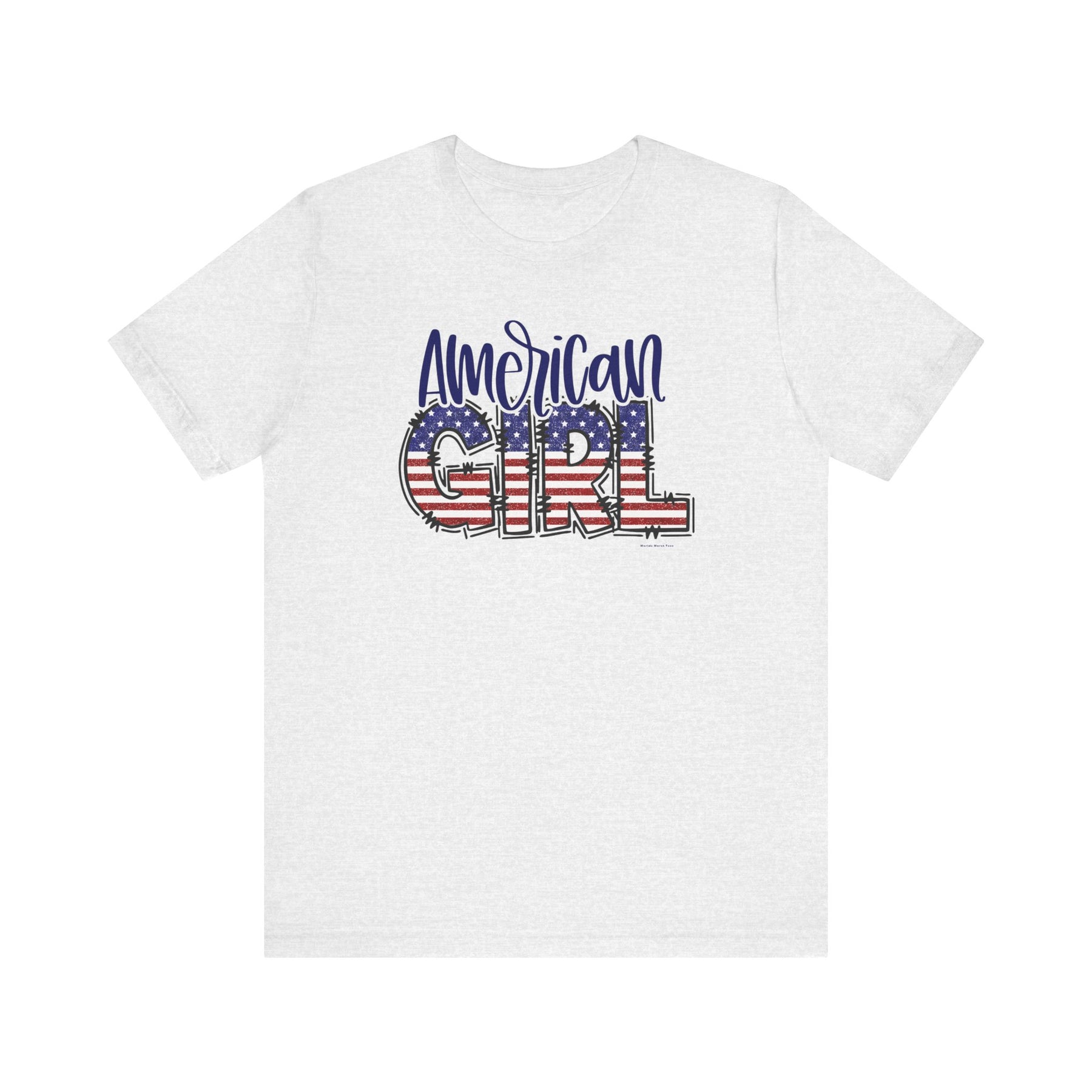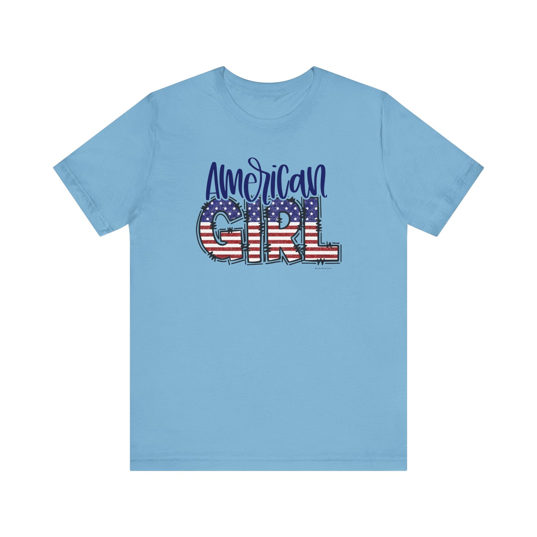 American Girl Tee: A classic white unisex jersey tee with a patriotic red, white, and blue text design. Made of soft 100% cotton, featuring ribbed knit collars, taping on shoulders, and dual side seams for durability.
