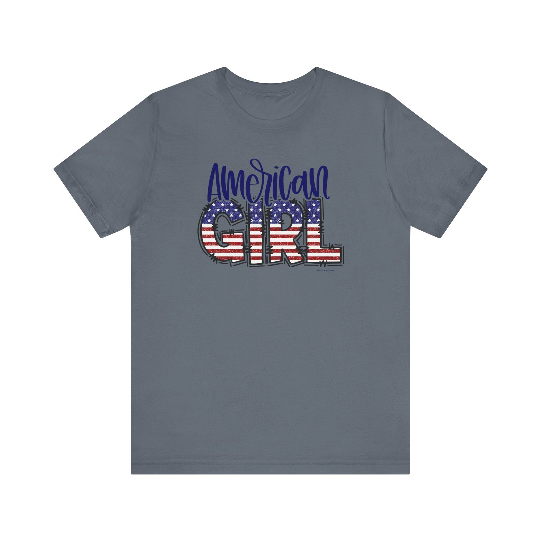 American Girl Tee: A grey t-shirt featuring a flag design and red, white, and blue text. Unisex jersey tee with ribbed knit collars, taping on shoulders, and 100% Airlume combed cotton.