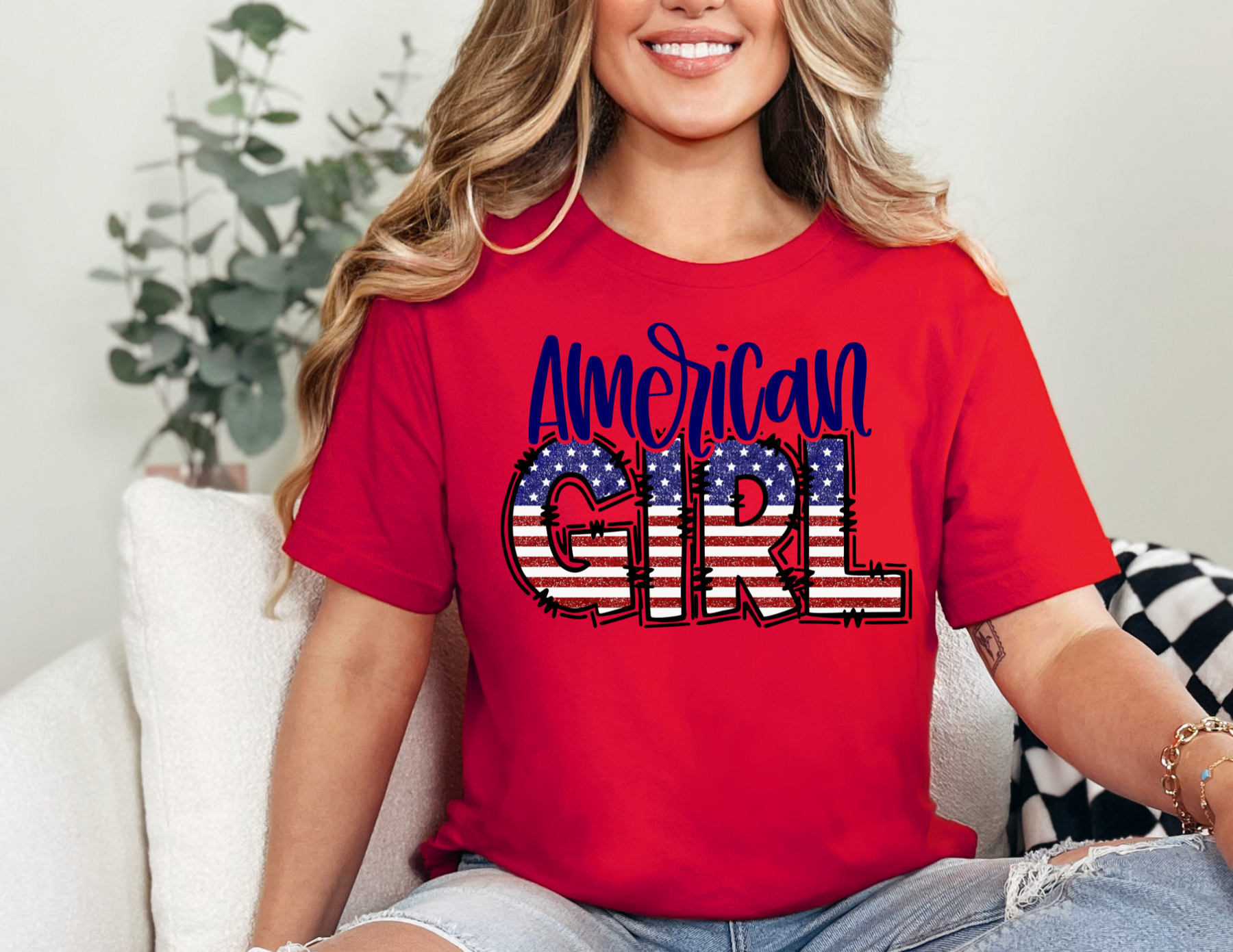 A classic American Girl Tee, featuring a white shirt with a flag and text design. Unisex jersey tee made of 100% Airlume combed cotton, with ribbed knit collars and taping on shoulders for durability. Sizes XS to 3XL available.