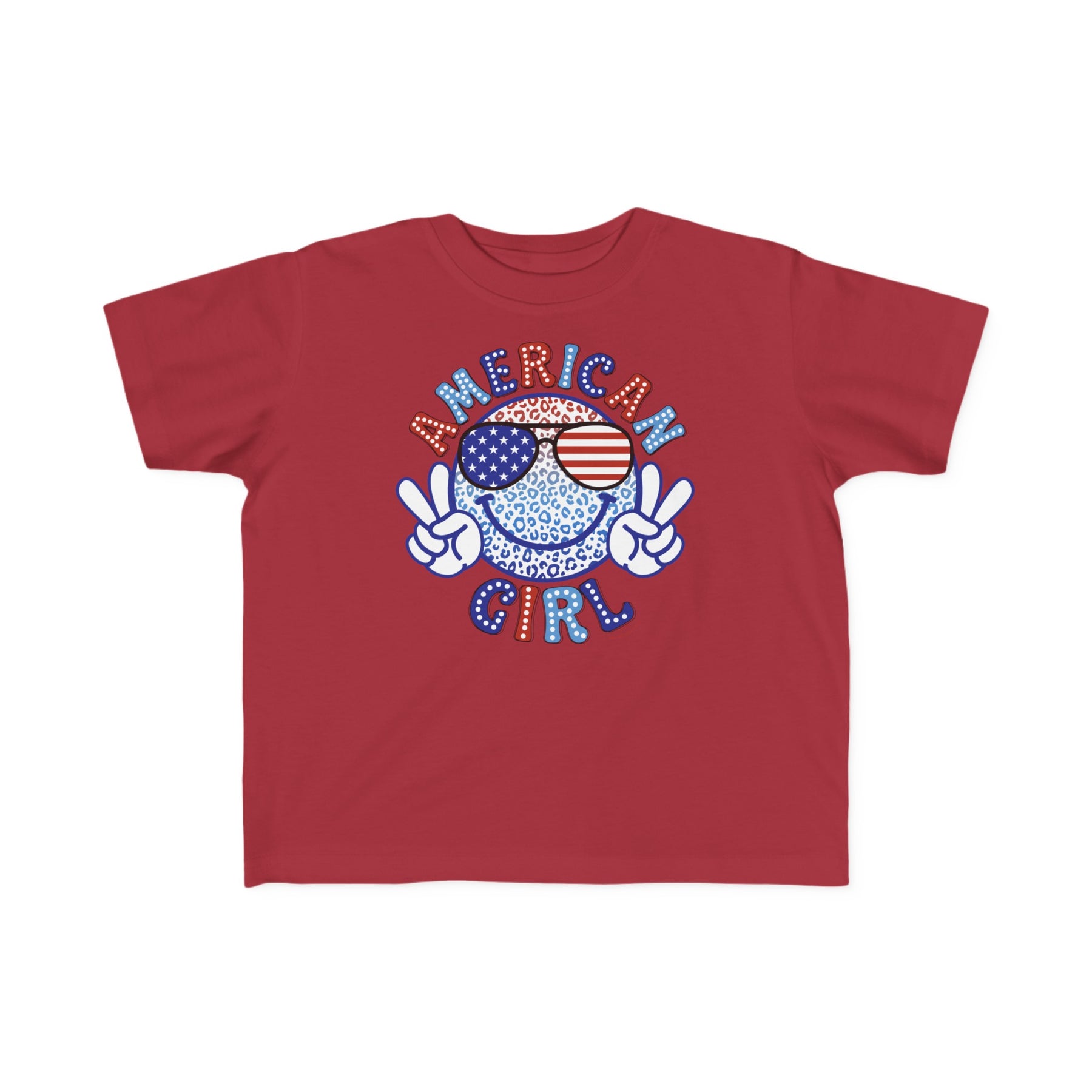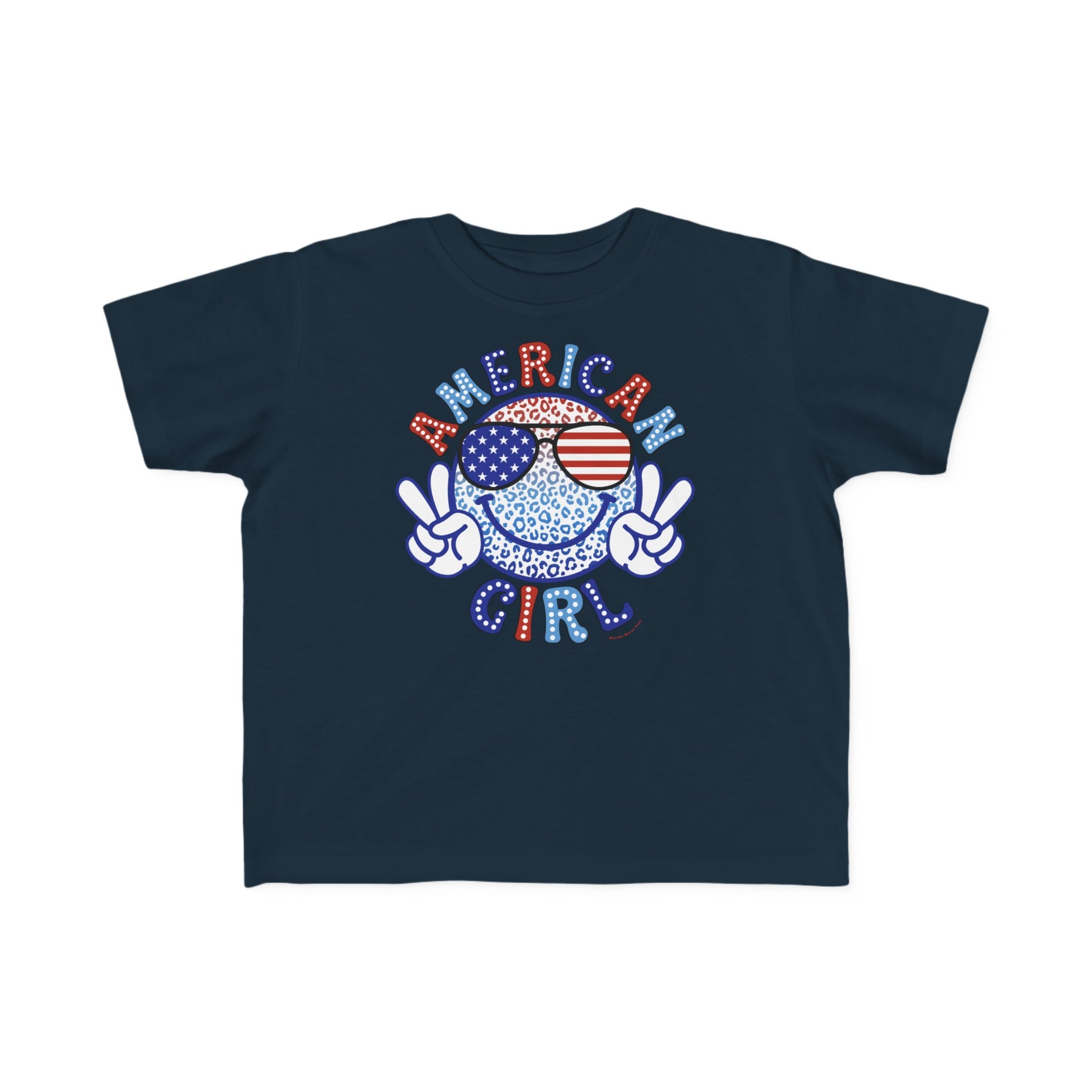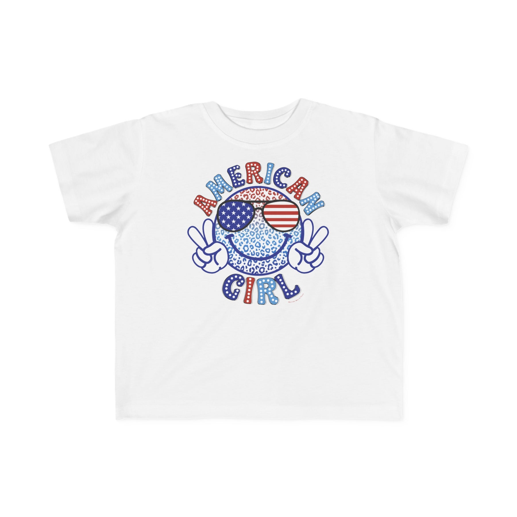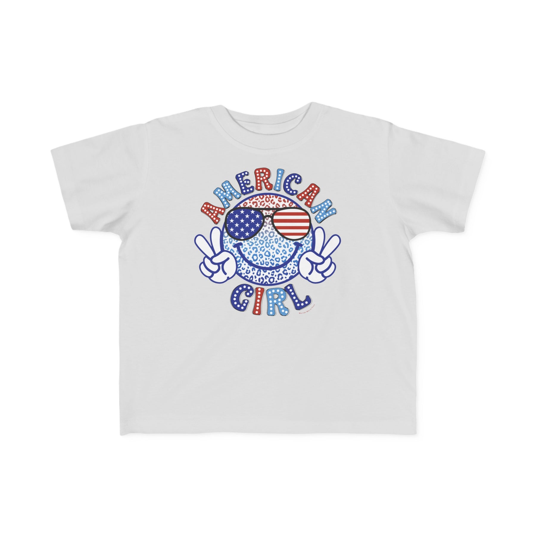 A Peace American Girl Toddler Tee featuring a cartoon smiley face with sunglasses, perfect for sensitive skin. 100% combed ringspun cotton, light fabric, tear-away label, classic fit. Sizes: 2T, 3T, 4T, 5-6T.