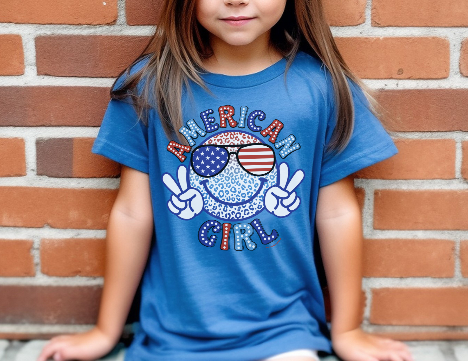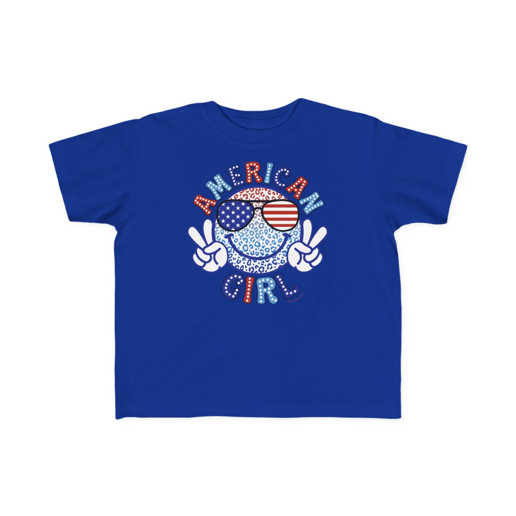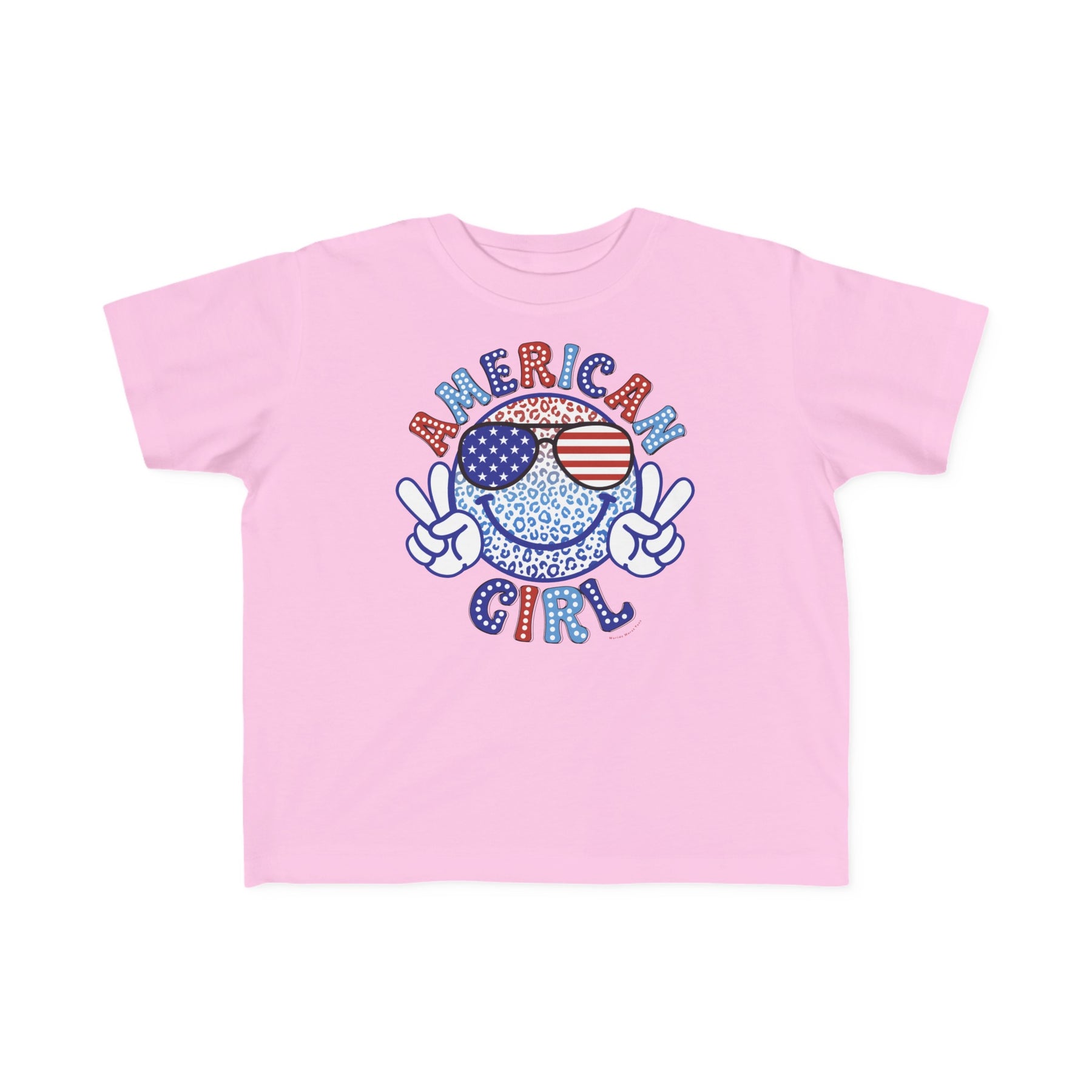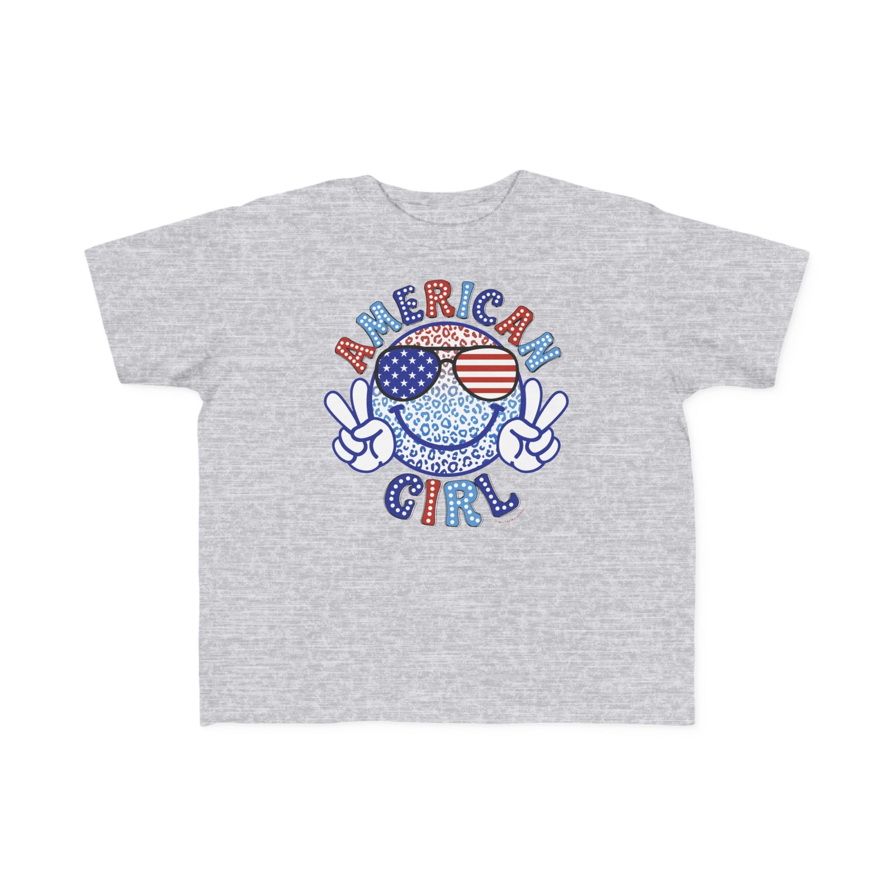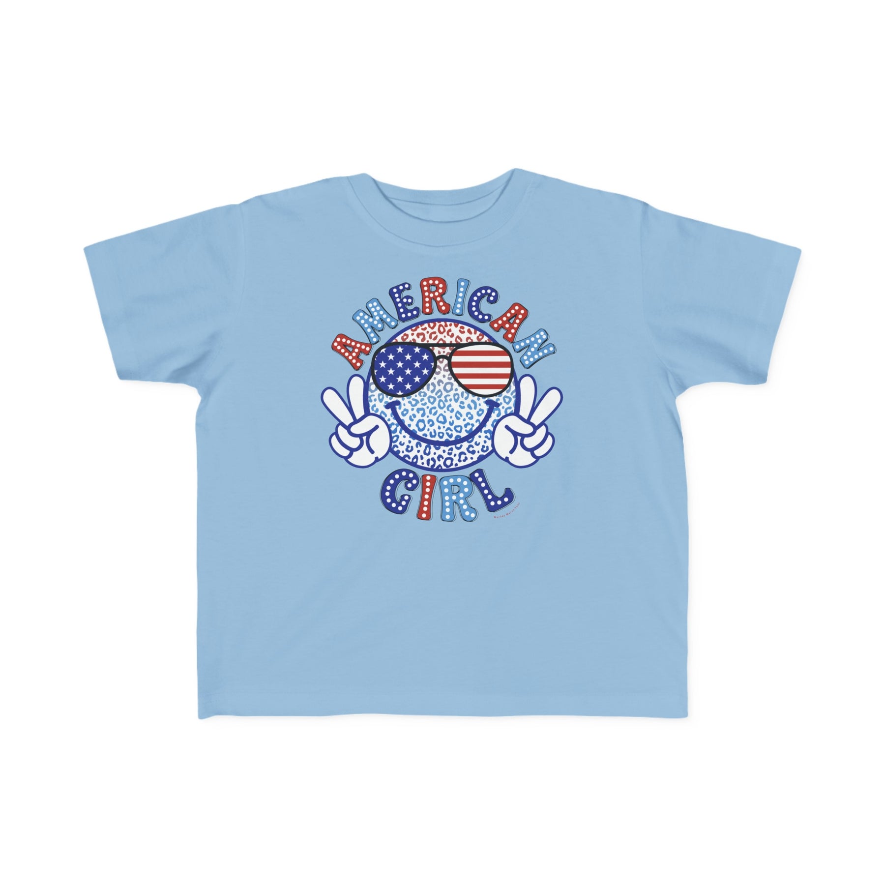 A Peace American Girl Toddler Tee featuring a cartoon smiley face with sunglasses, perfect for sensitive skin. 100% combed ringspun cotton, light fabric, tear-away label, classic fit. Sizes: 2T, 3T, 4T, 5-6T.