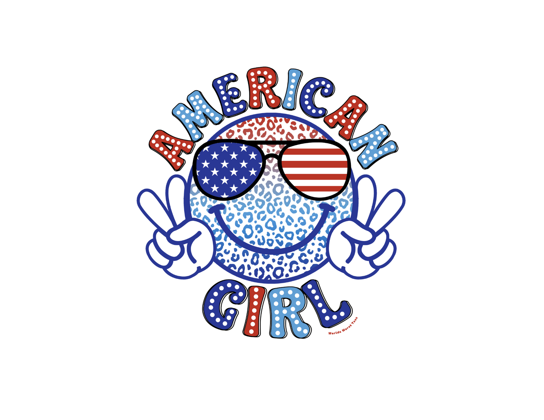 American Girl Toddler Tee featuring a peace sign, smiley face, and sunglasses. Soft 100% cotton, light fabric, classic fit, tear-away label. Available in sizes 2T to 5-6T.