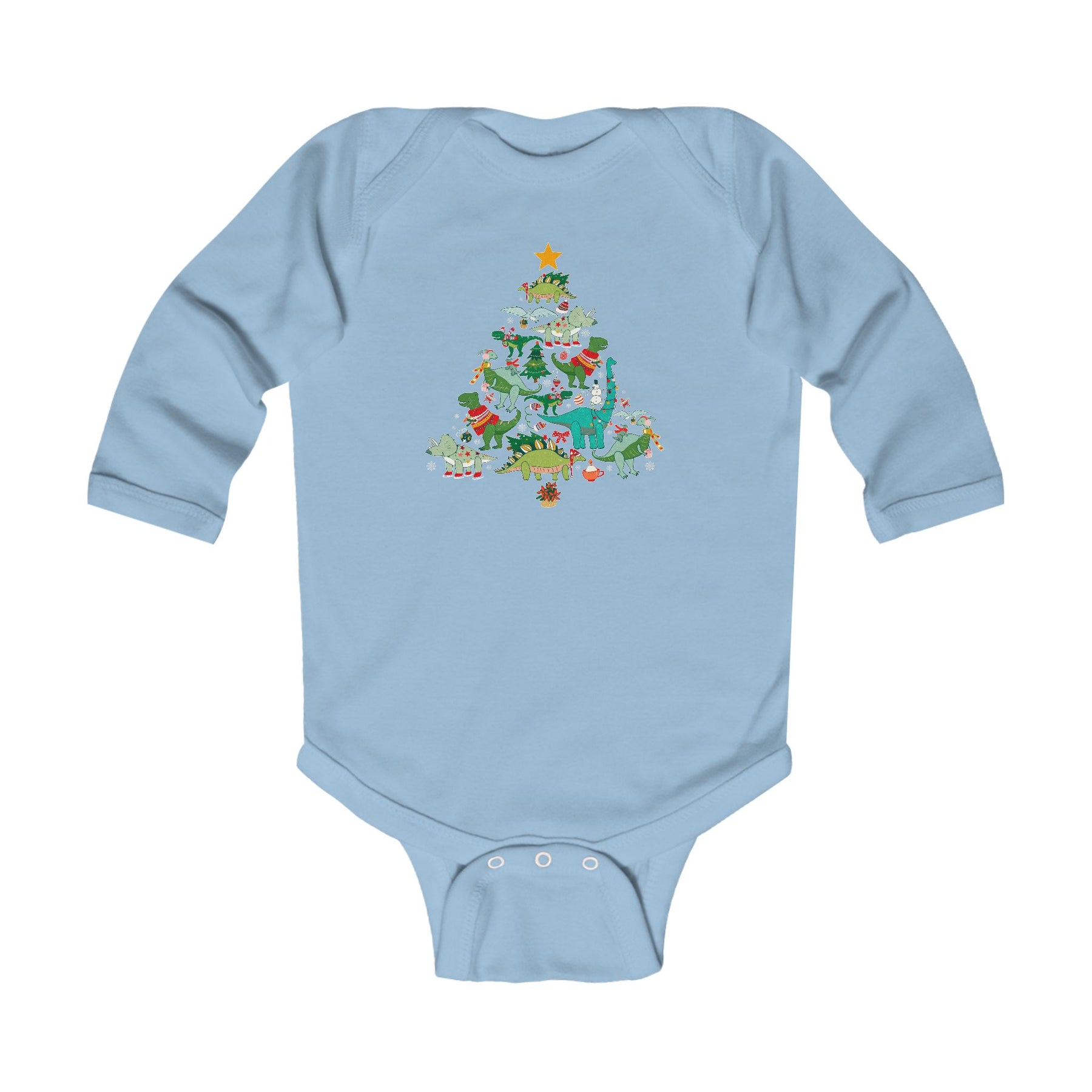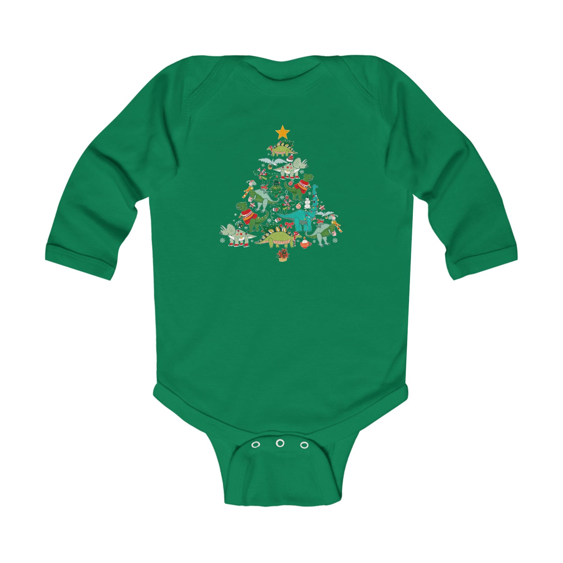 Baby Dino Tree Onesie features a festive dinosaur Christmas tree design on a gray long-sleeve bodysuit, combining comfort and holiday cheer for infants.